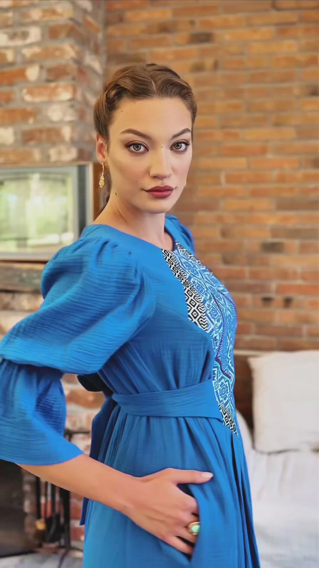 Mâneca este trei sferturi, stil clopot și decolteul are o formă armonioasă la baza gâtului.