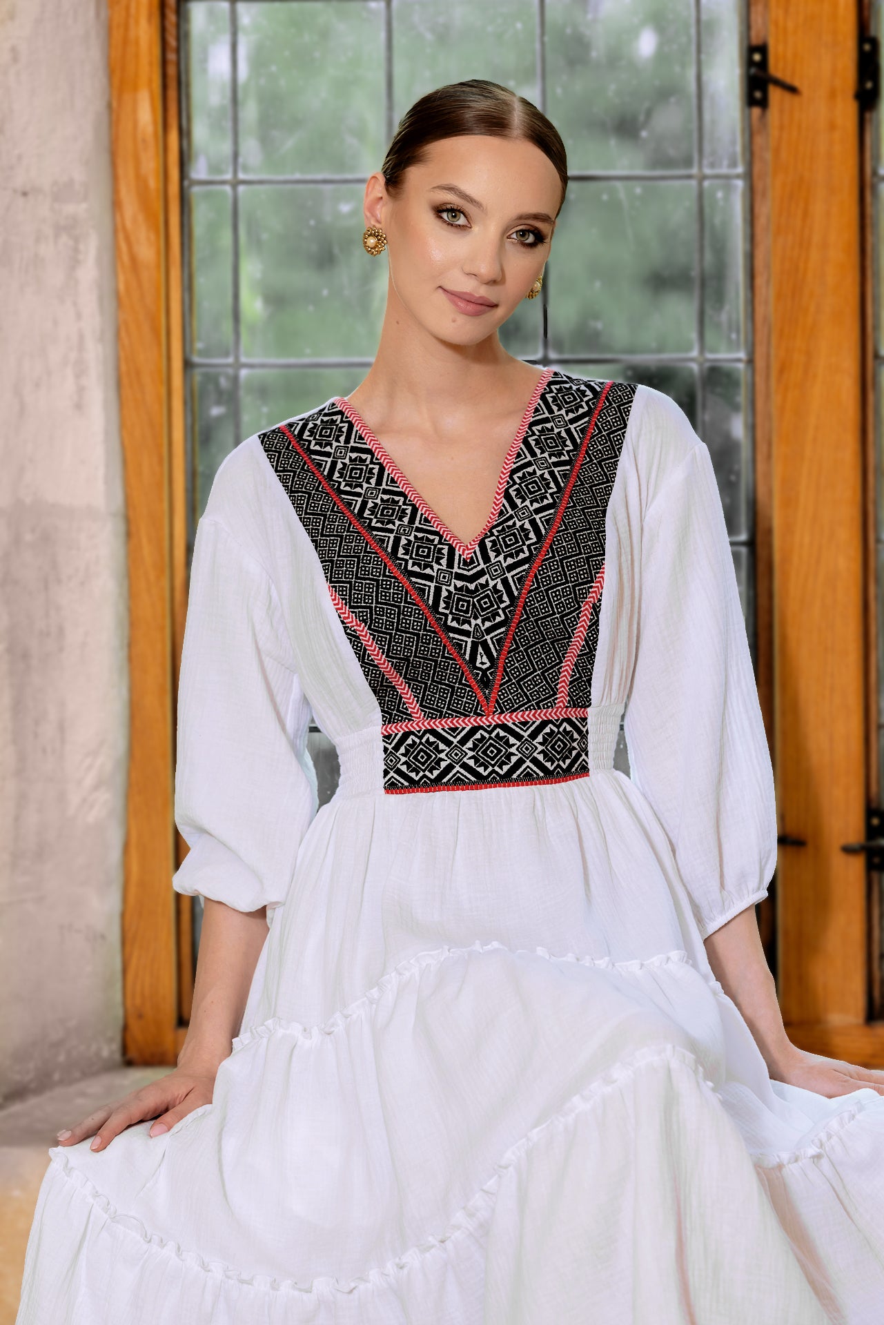 Aceasta are o croială feminină, cu bustul din jacquard etnic țesut și partea de fustă din trei volane foarte bogate.