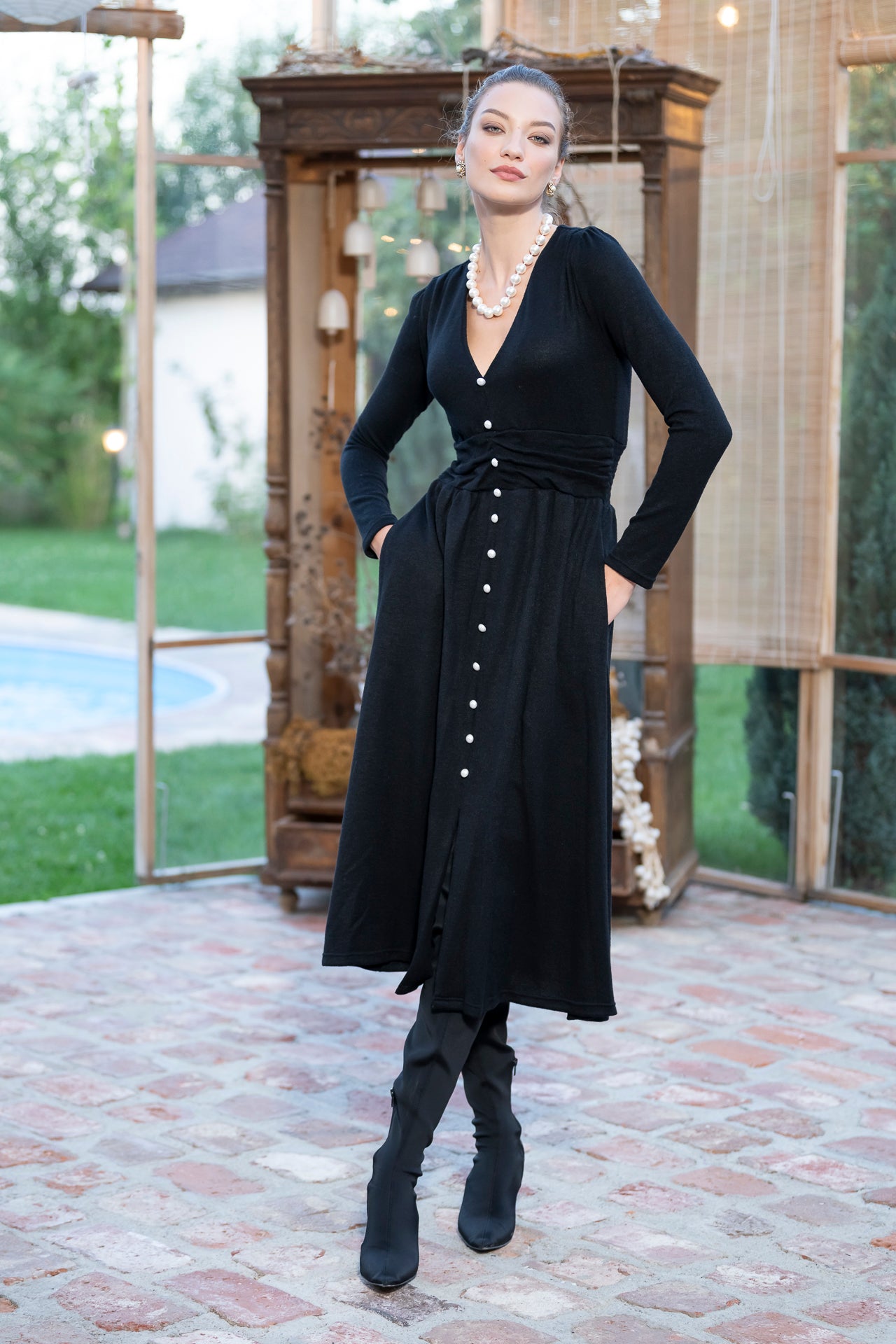 Rochia Kira din tricot negru cu nasturi tip perlă