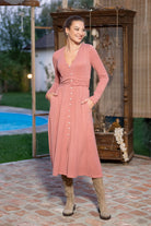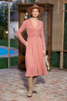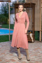 Rochia Kira din tricot roz pudra cu nasturi tip perla