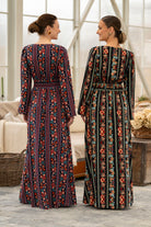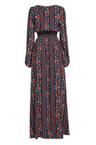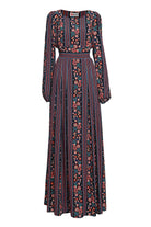 Rochia Sânziana Boem este confecționată din viscoză bleumarin, fină, imprimată digital cu motive florale și geometrice multicolore.