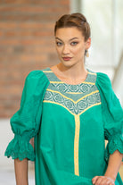 Broderia spectaculoasă înnobilează poalele și mânecile rochiei ,iar jacquardul tradițional accentuează feminitatea.