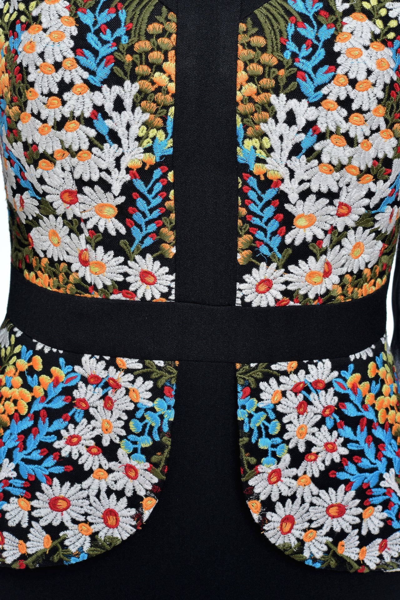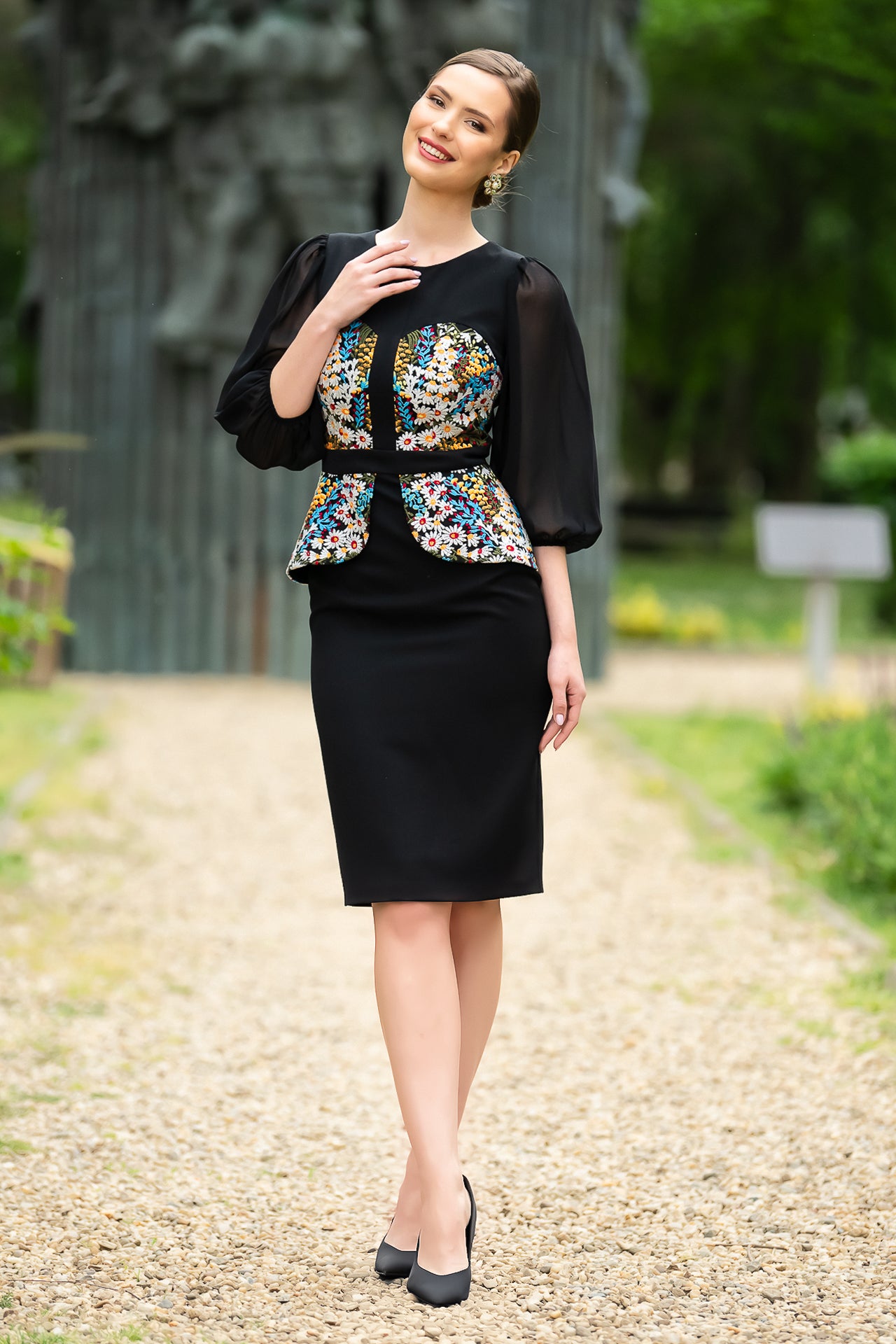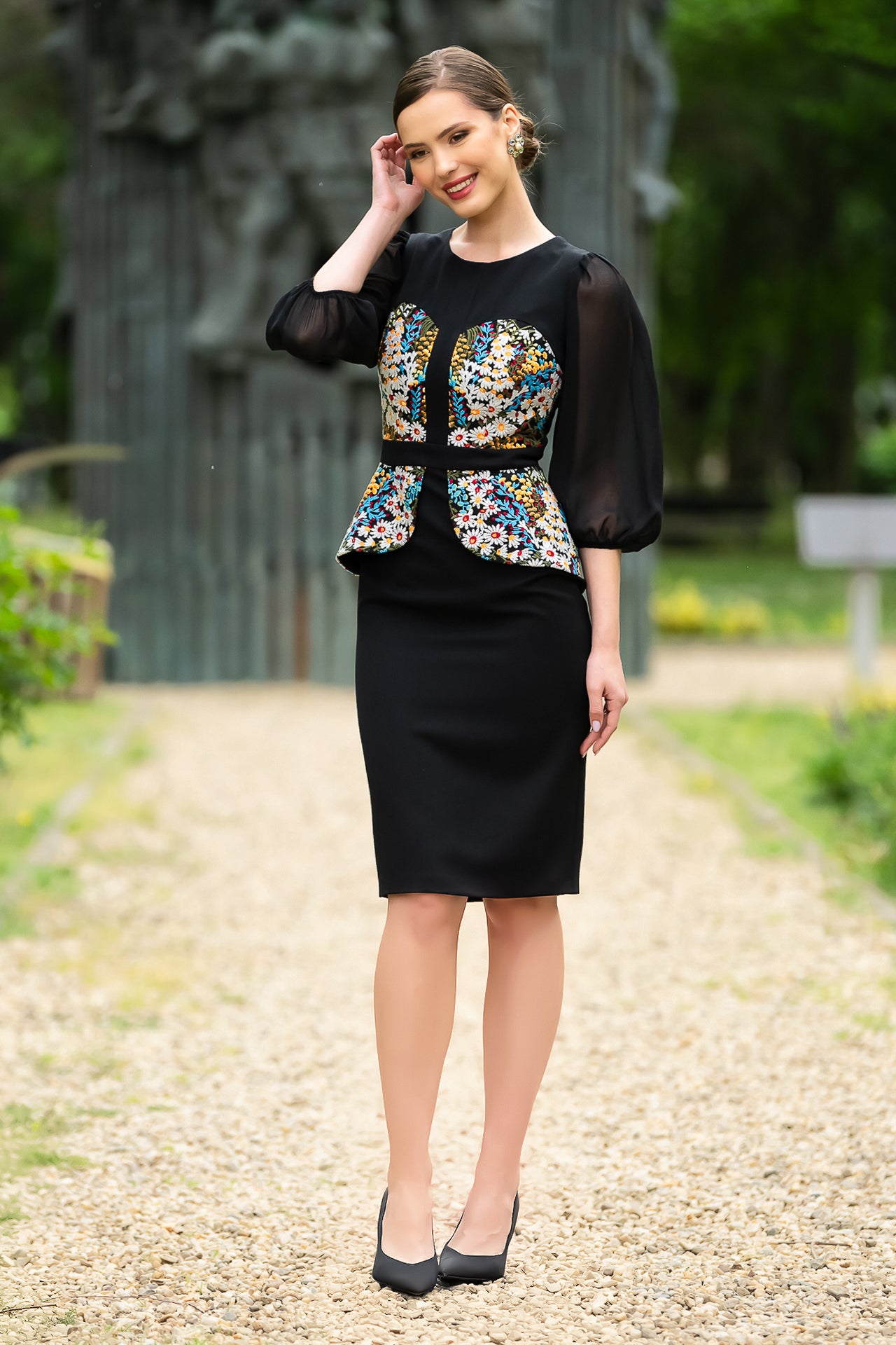 Rochia corset margarete are o linie elegantă și este confecționată din stofă neagră, voal negru și dantelă brodată cu motive florale.