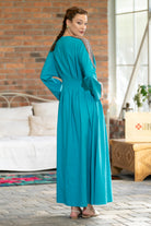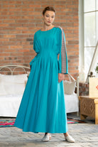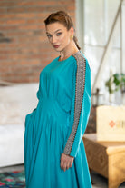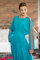 Rochia modernă din in turcoaz cu pense cusute manual și jacquard etnic
