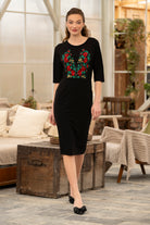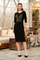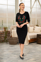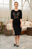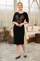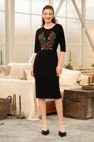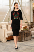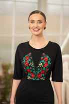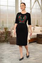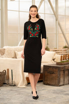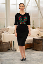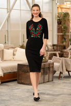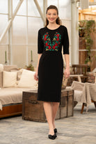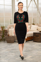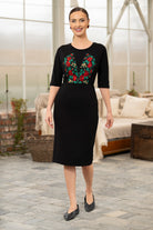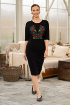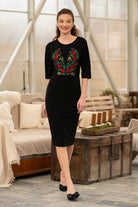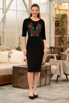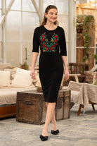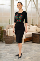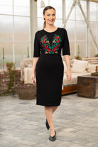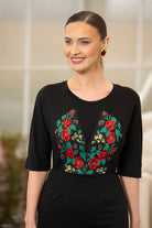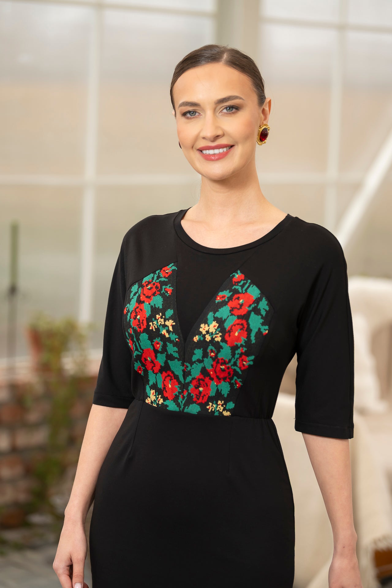Rochia este confecționată din jerseu negru, premium, din viscoză cu elastan și jacquard țesut cu motive florale.