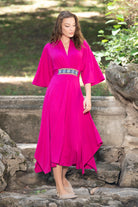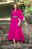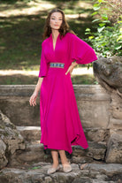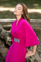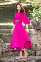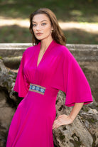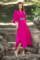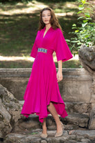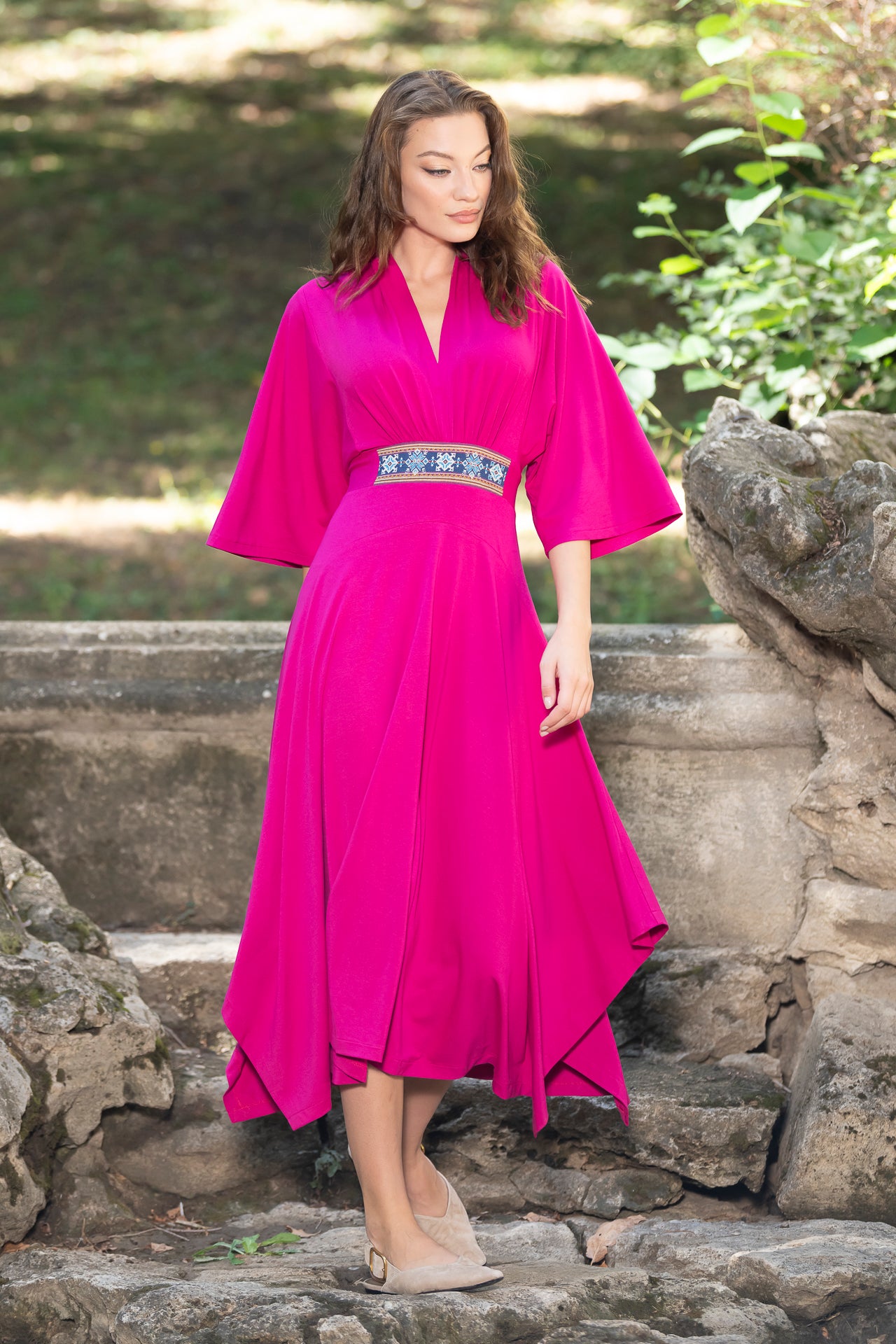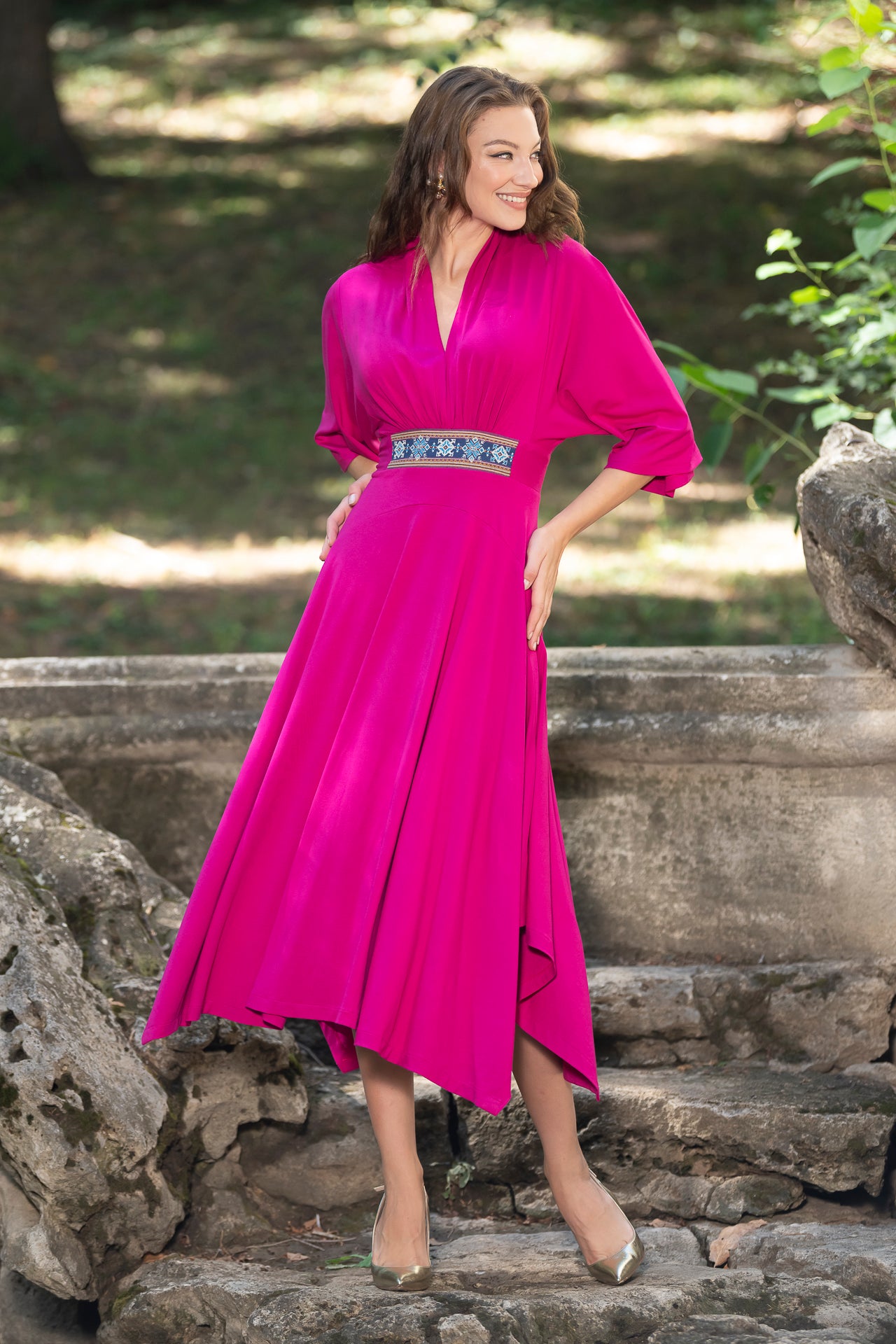 Rochia roz are un croi versatil și sofisticat, cu talia marcată de jacquardul țesut și fusta în colțuri cu corseletă.