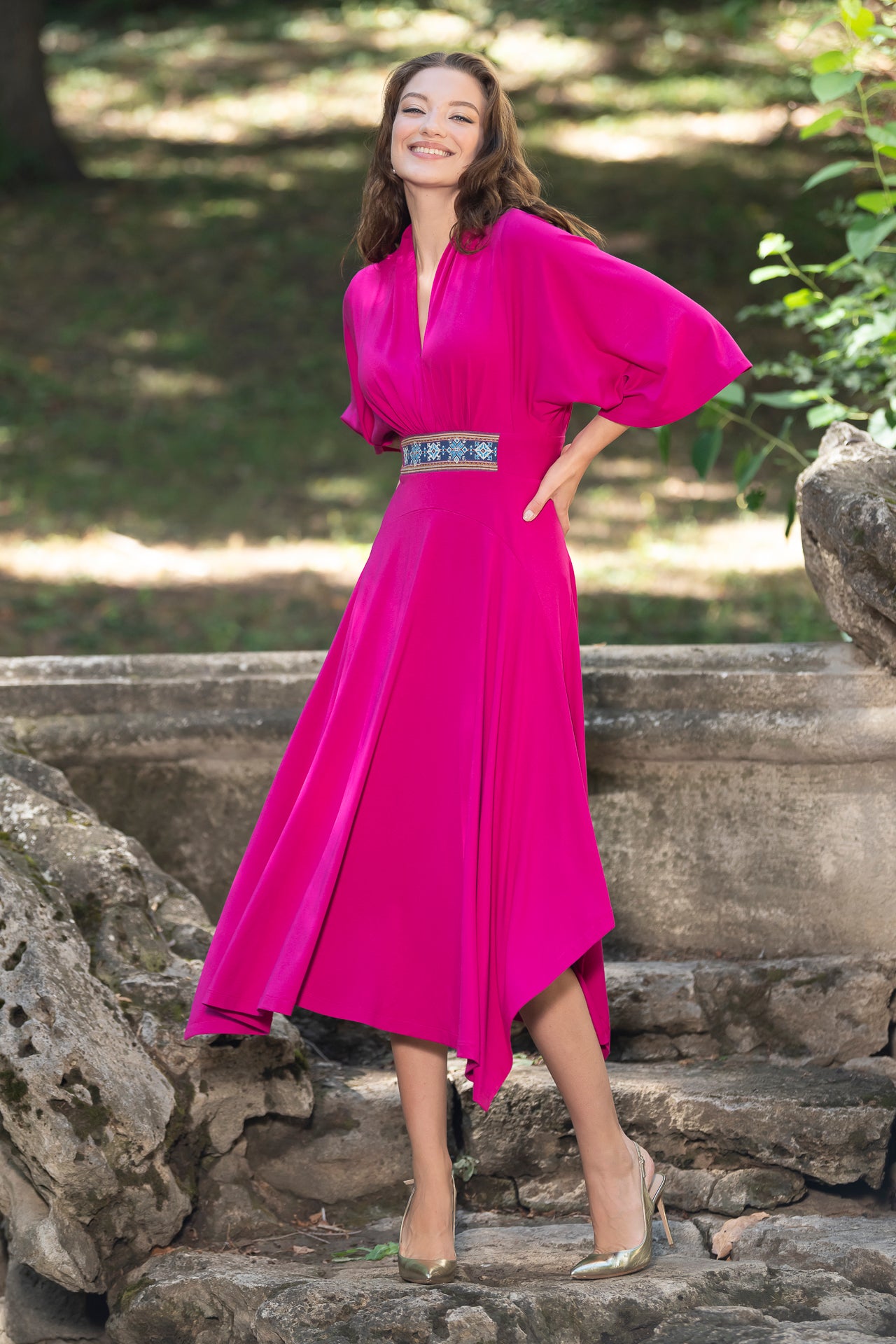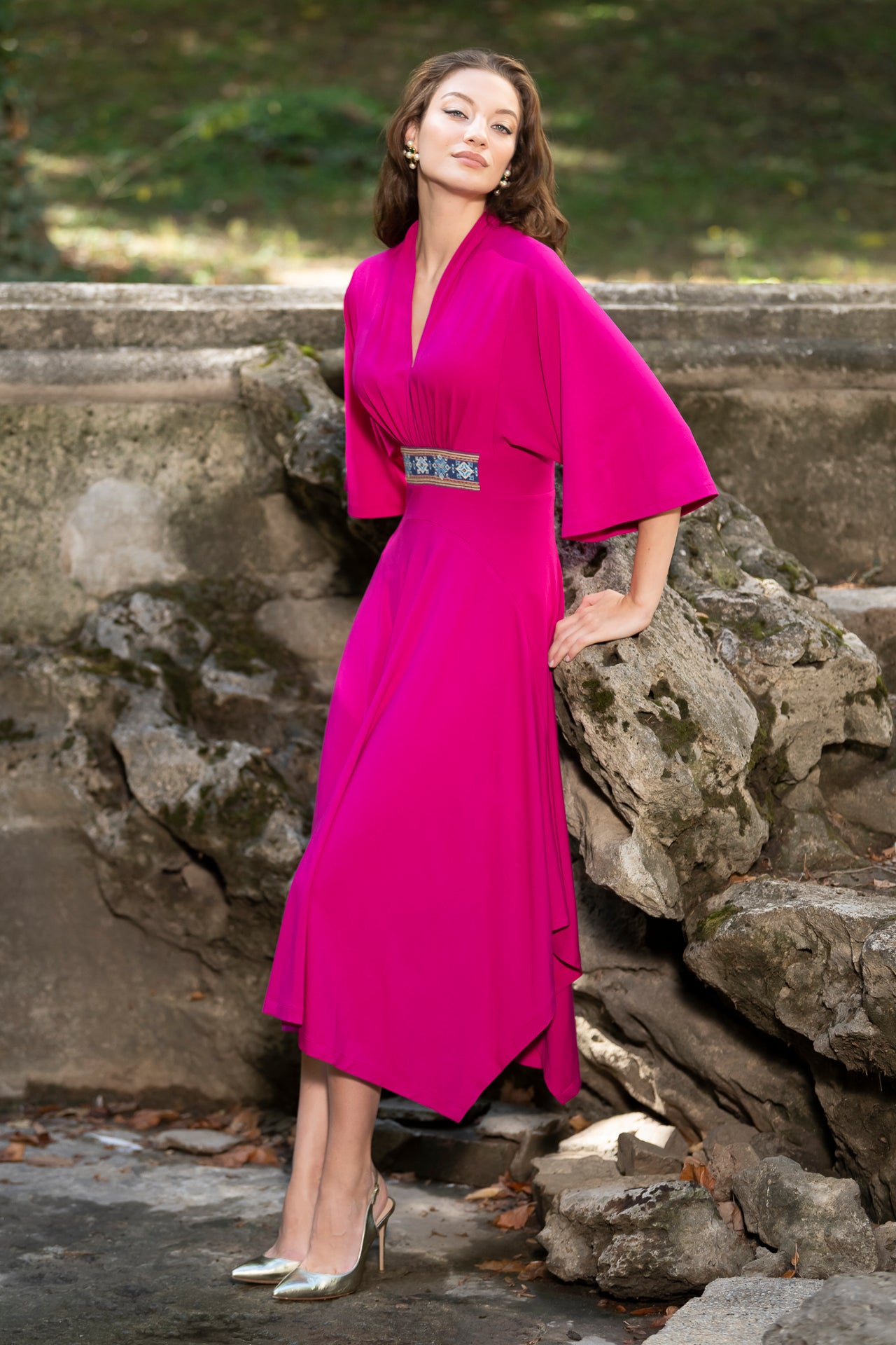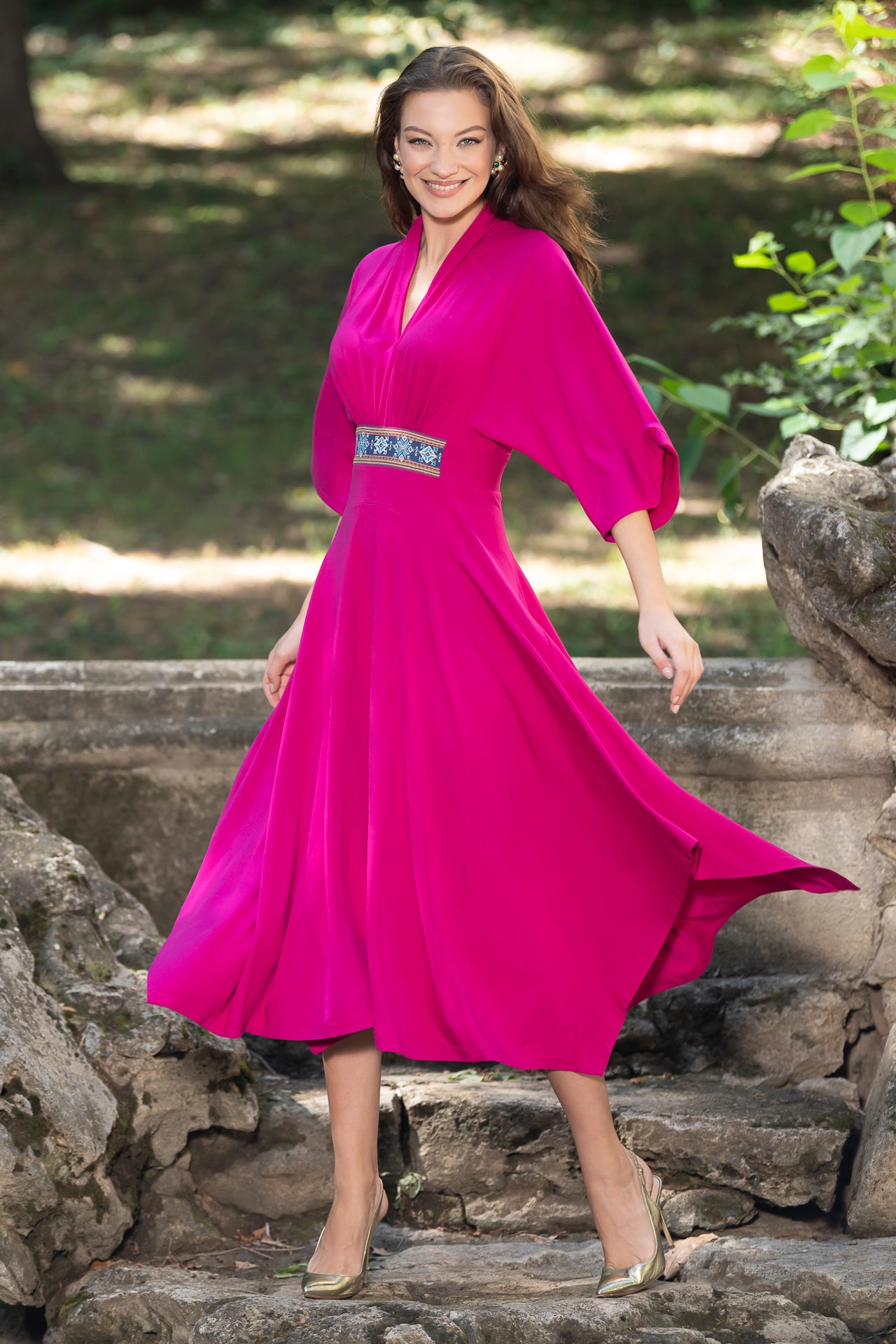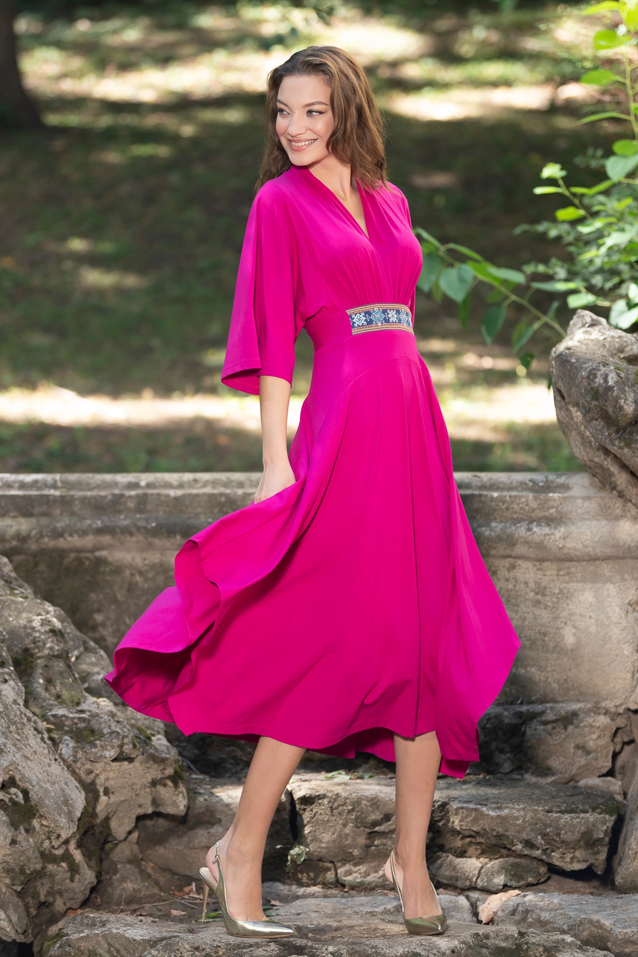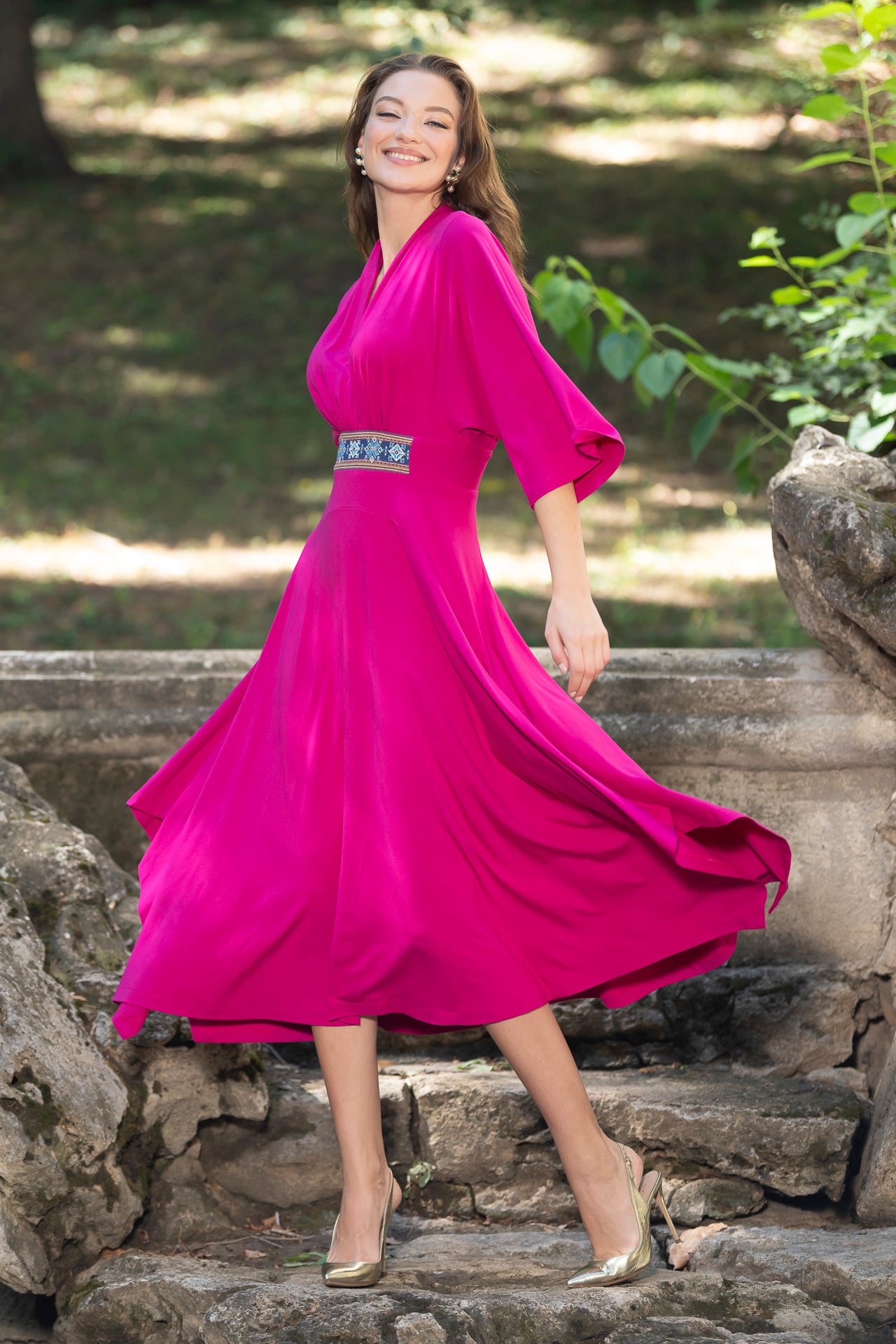 Rochia roz are un croi versatil și sofisticat, cu talia marcată de jacquardul țesut și fusta în colțuri cu corseletă.