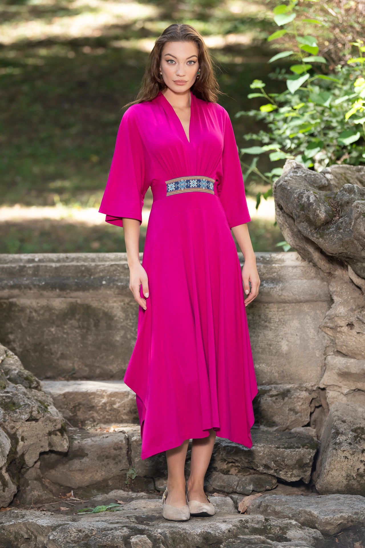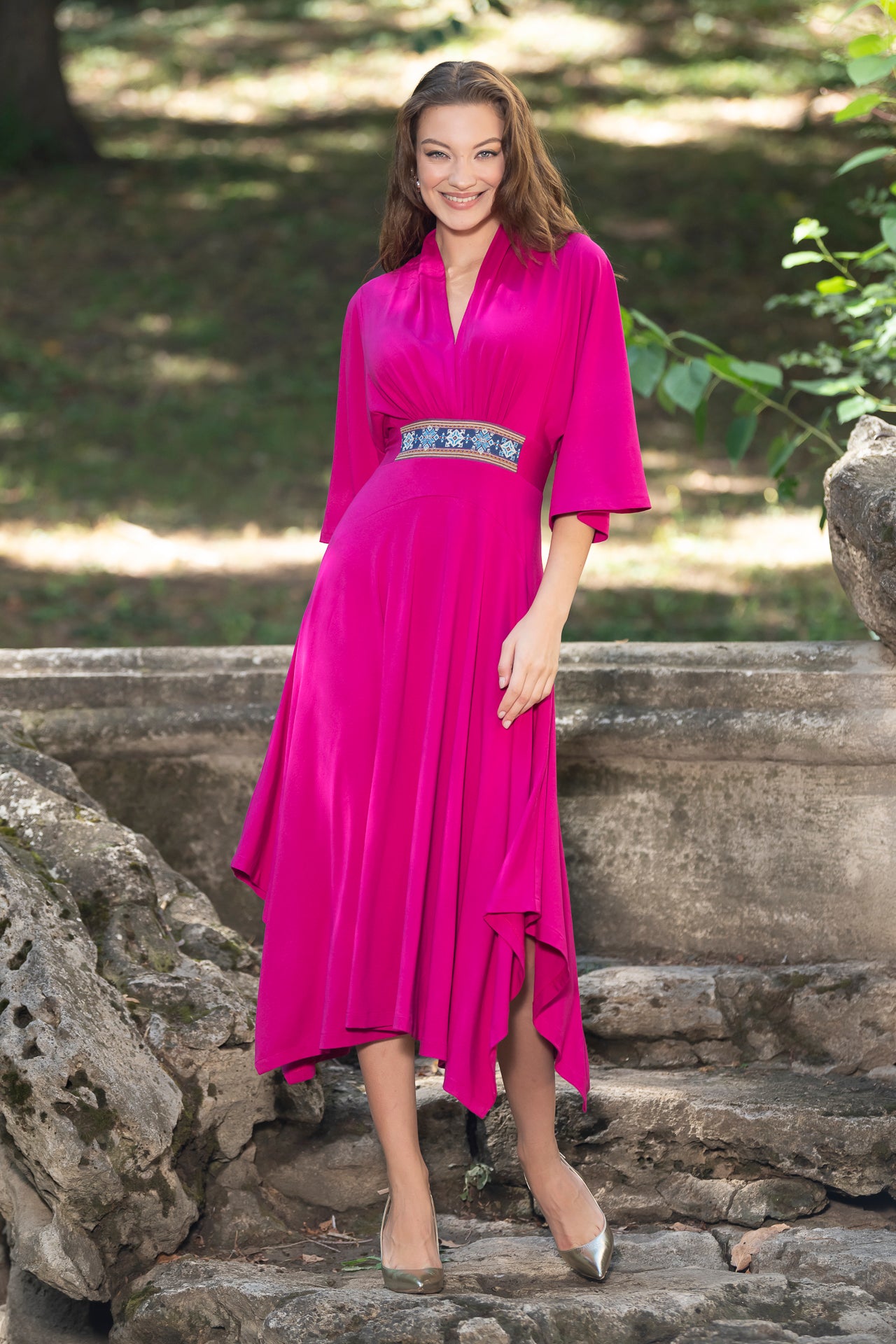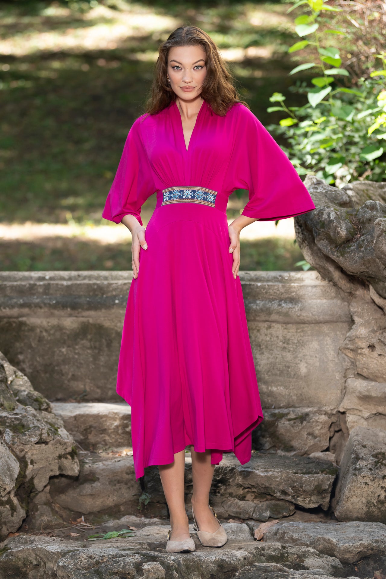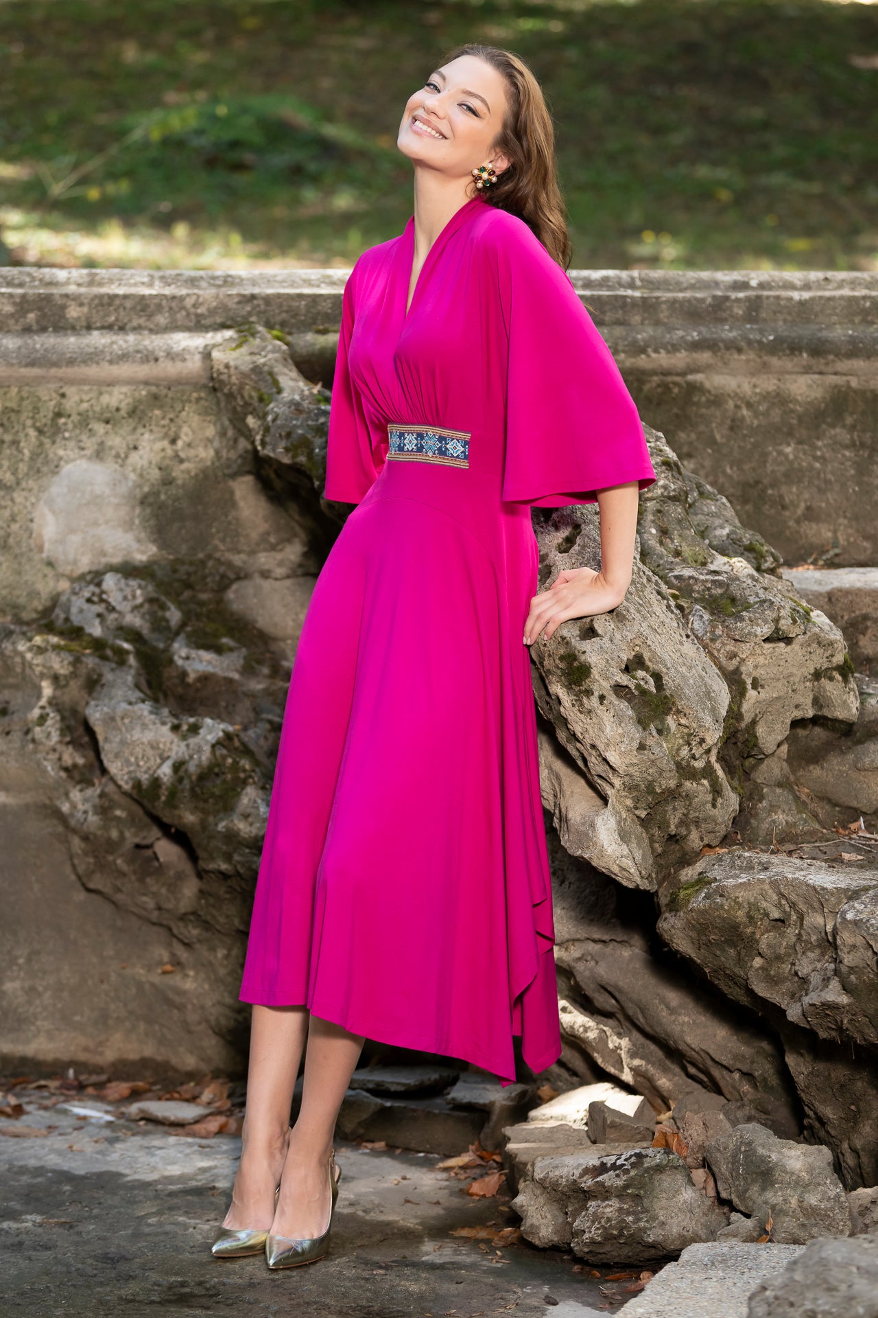 Rochia roz are un croi versatil și sofisticat, cu talia marcată de jacquardul țesut și fusta în colțuri cu corseletă.
