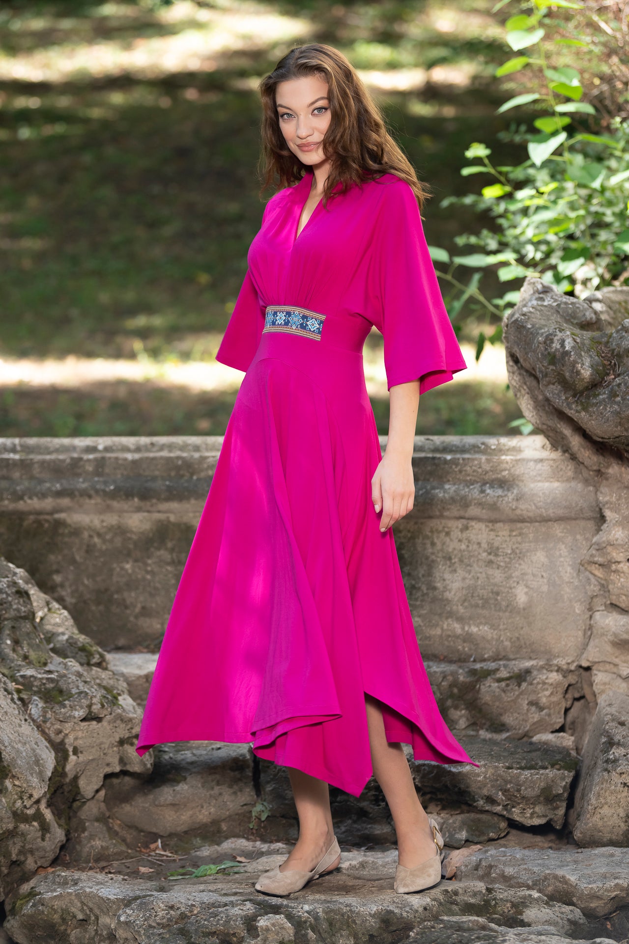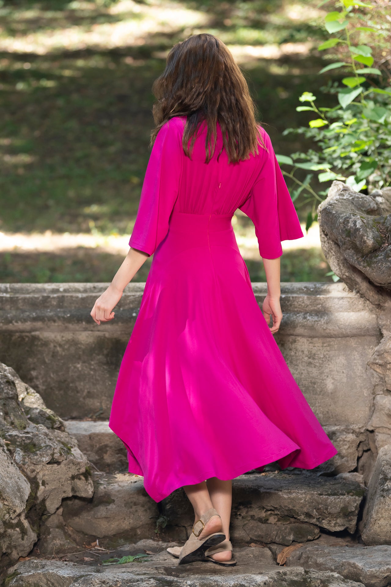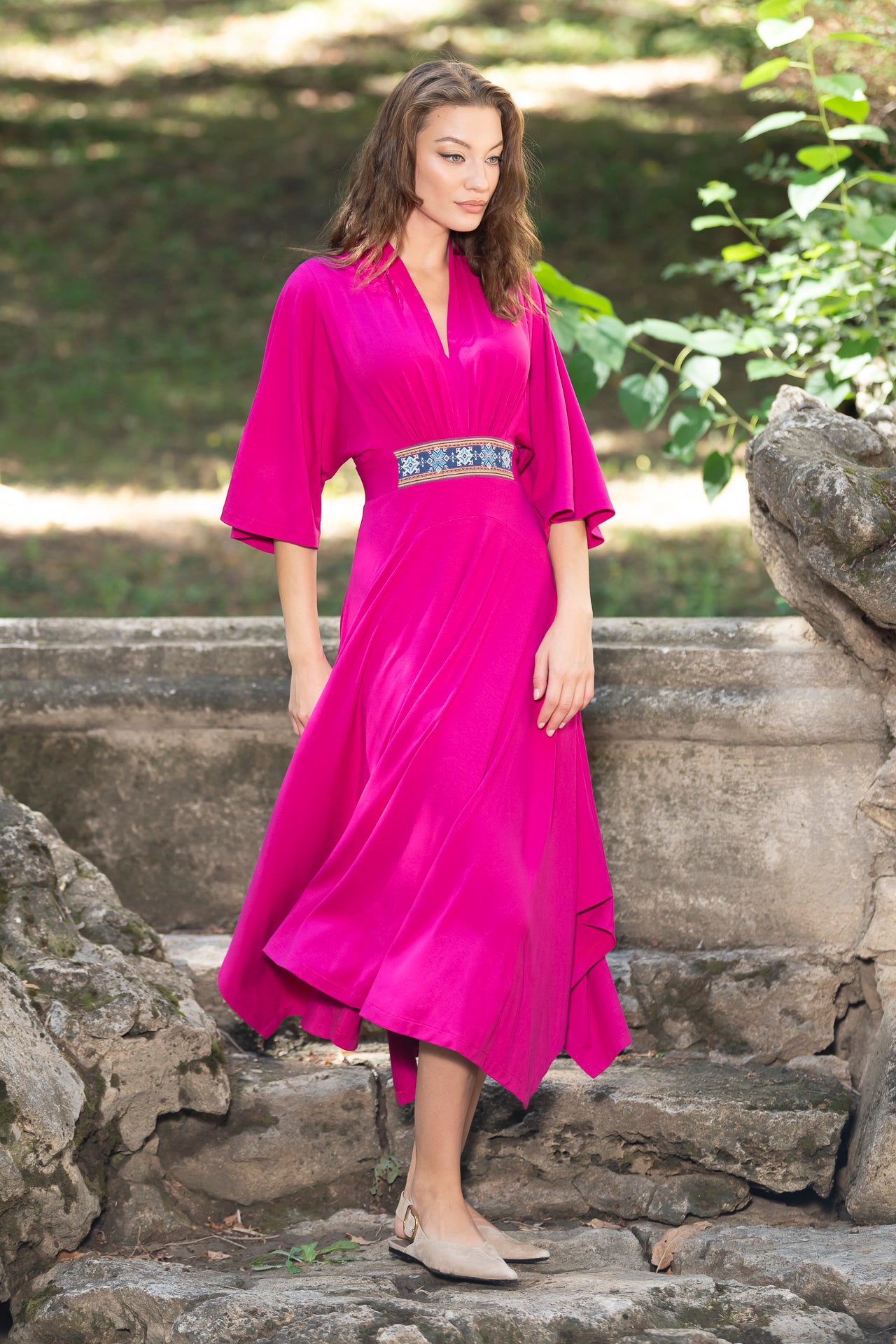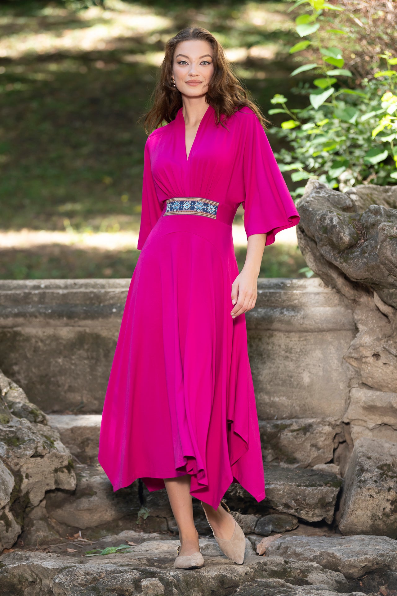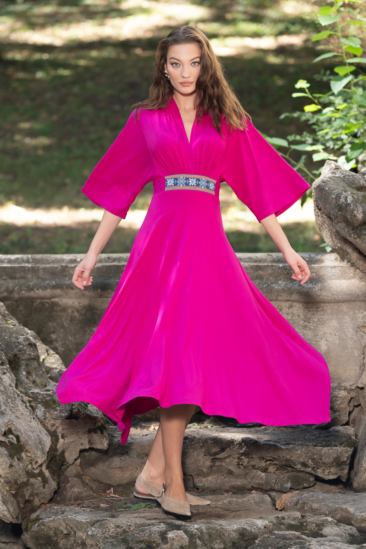 Rochia roz are un croi versatil și sofisticat, cu talia marcată de jacquardul țesut și fusta în colțuri cu corseletă.