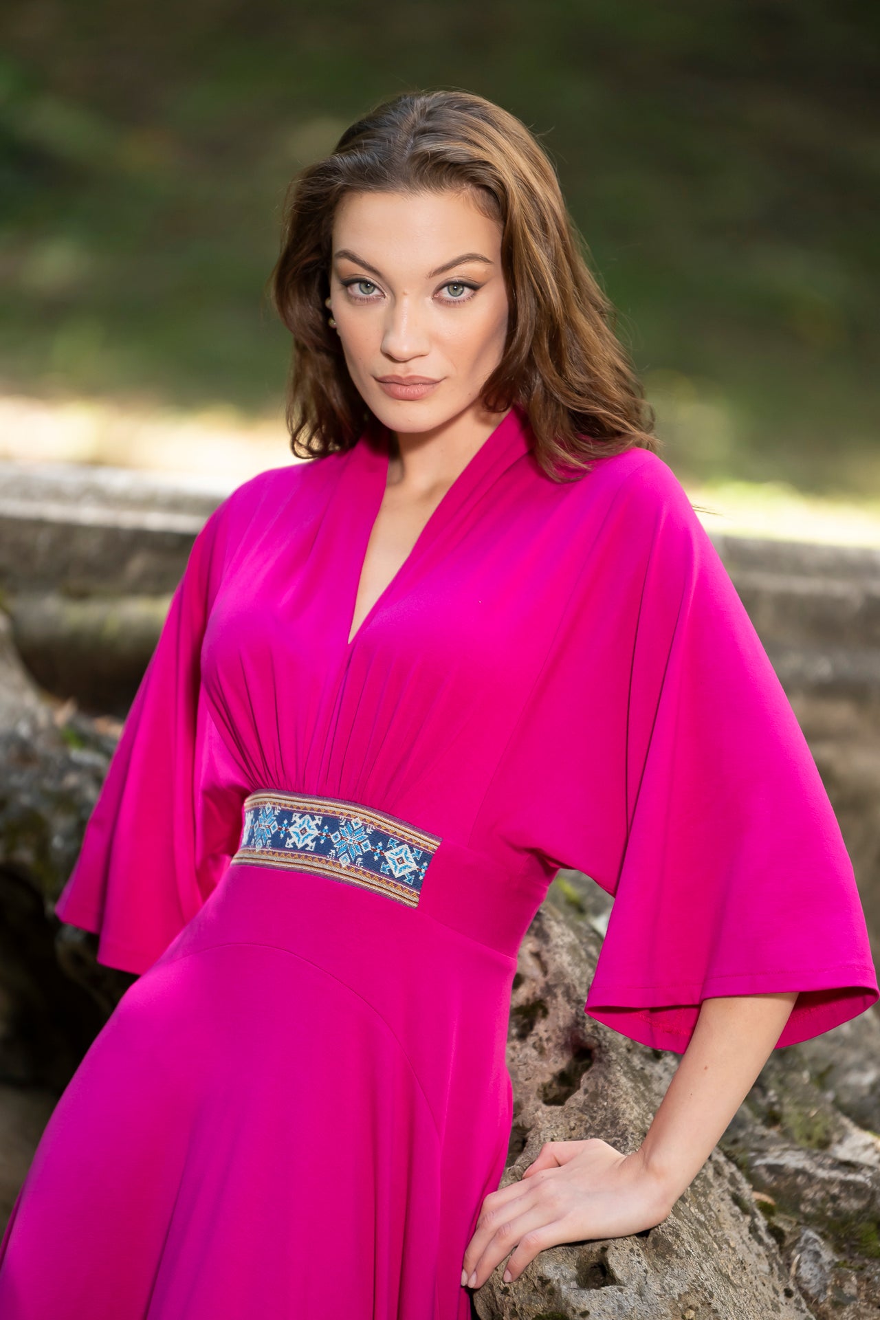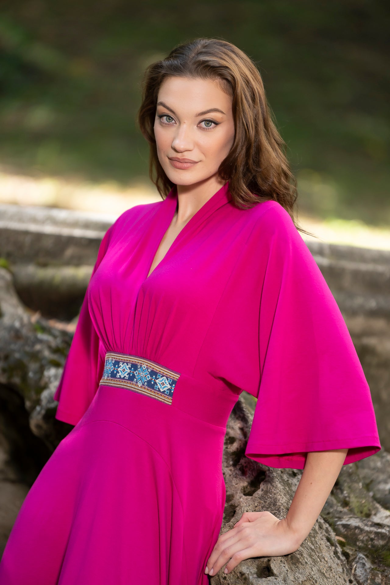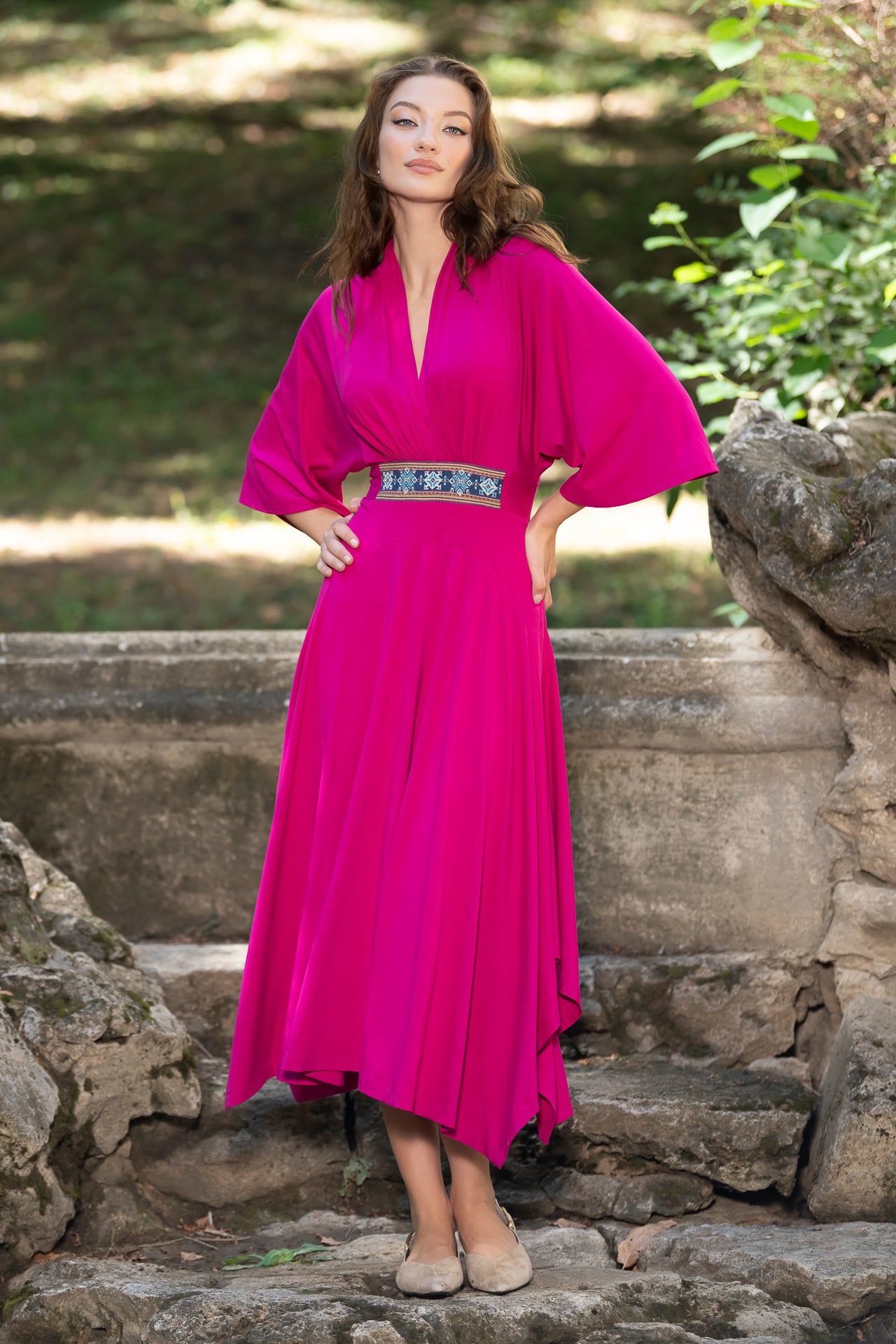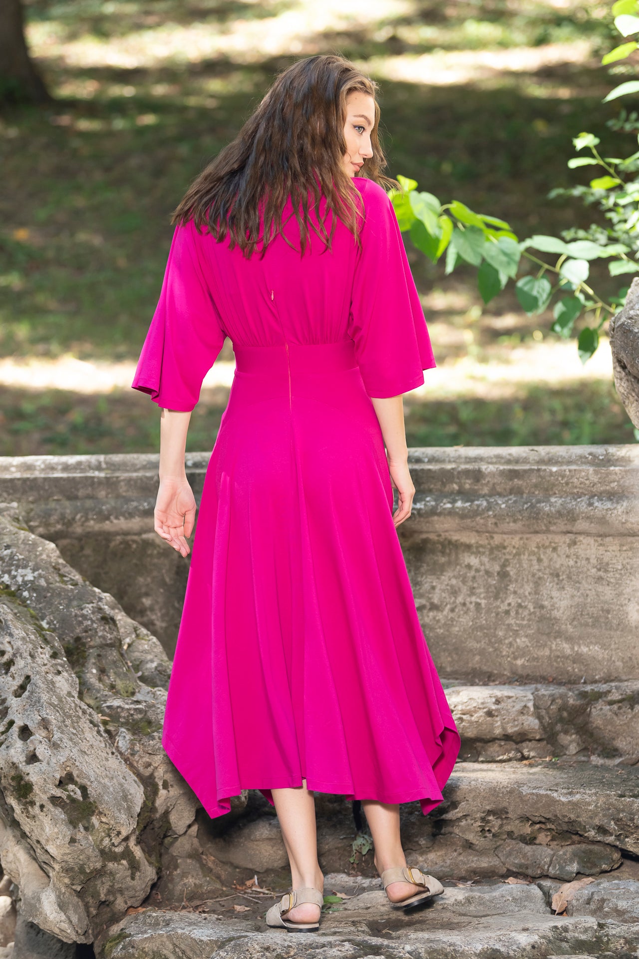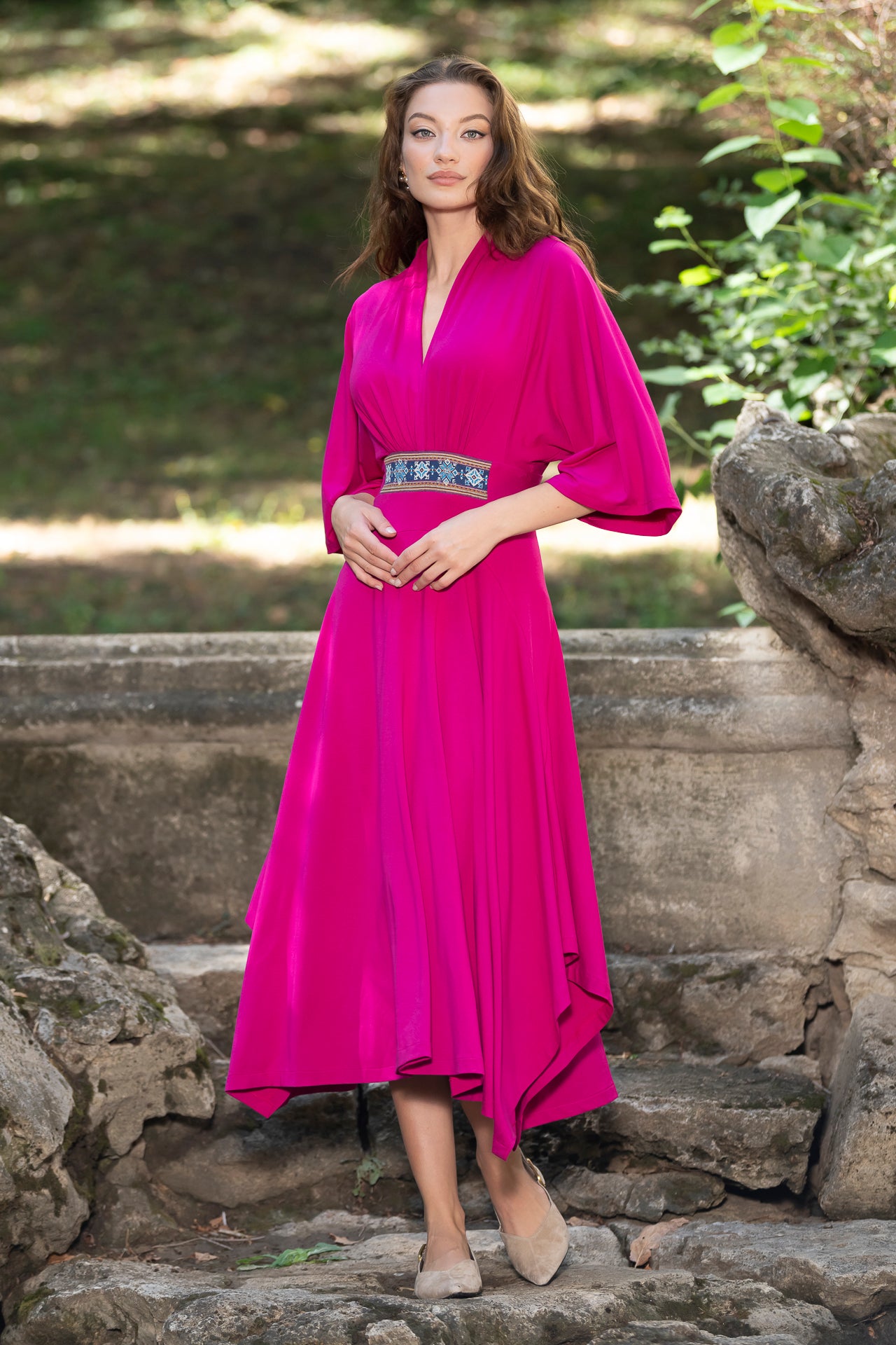 Rochia roz are un croi versatil și sofisticat, cu talia marcată de jacquardul țesut și fusta în colțuri cu corseletă.