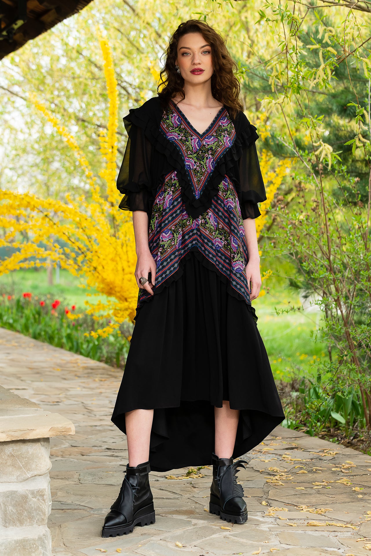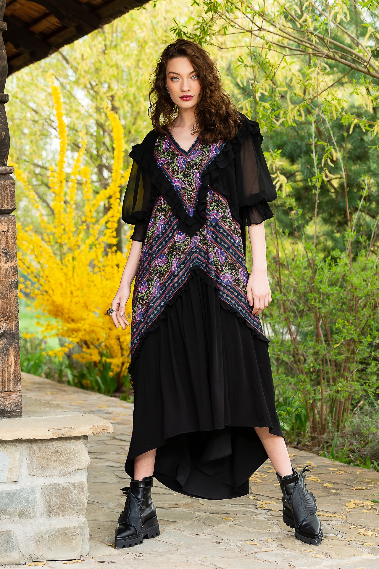 Este lejeră și practică, designul modern este completat de volanele negre care paspoalează anchiorul și volanul floral.