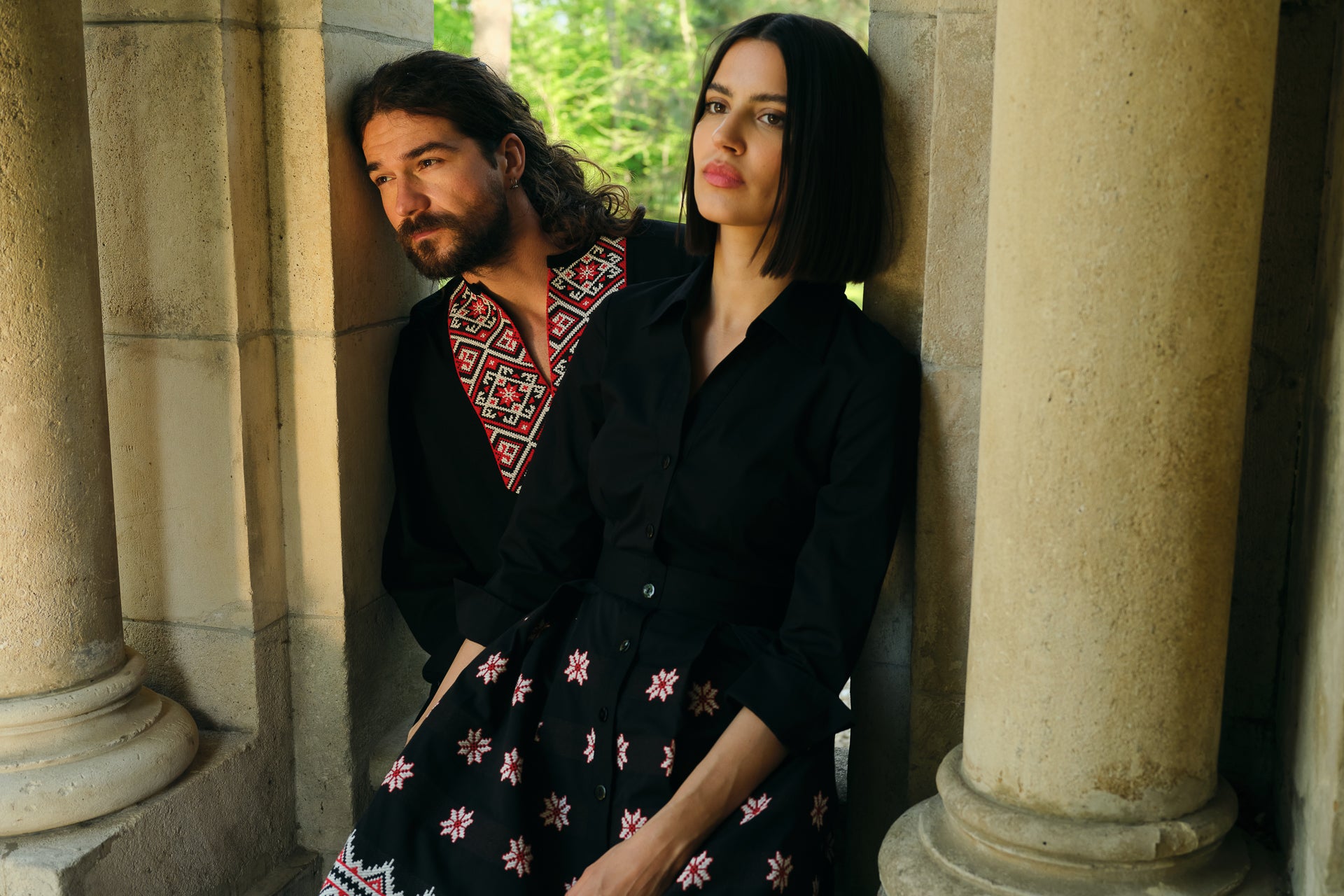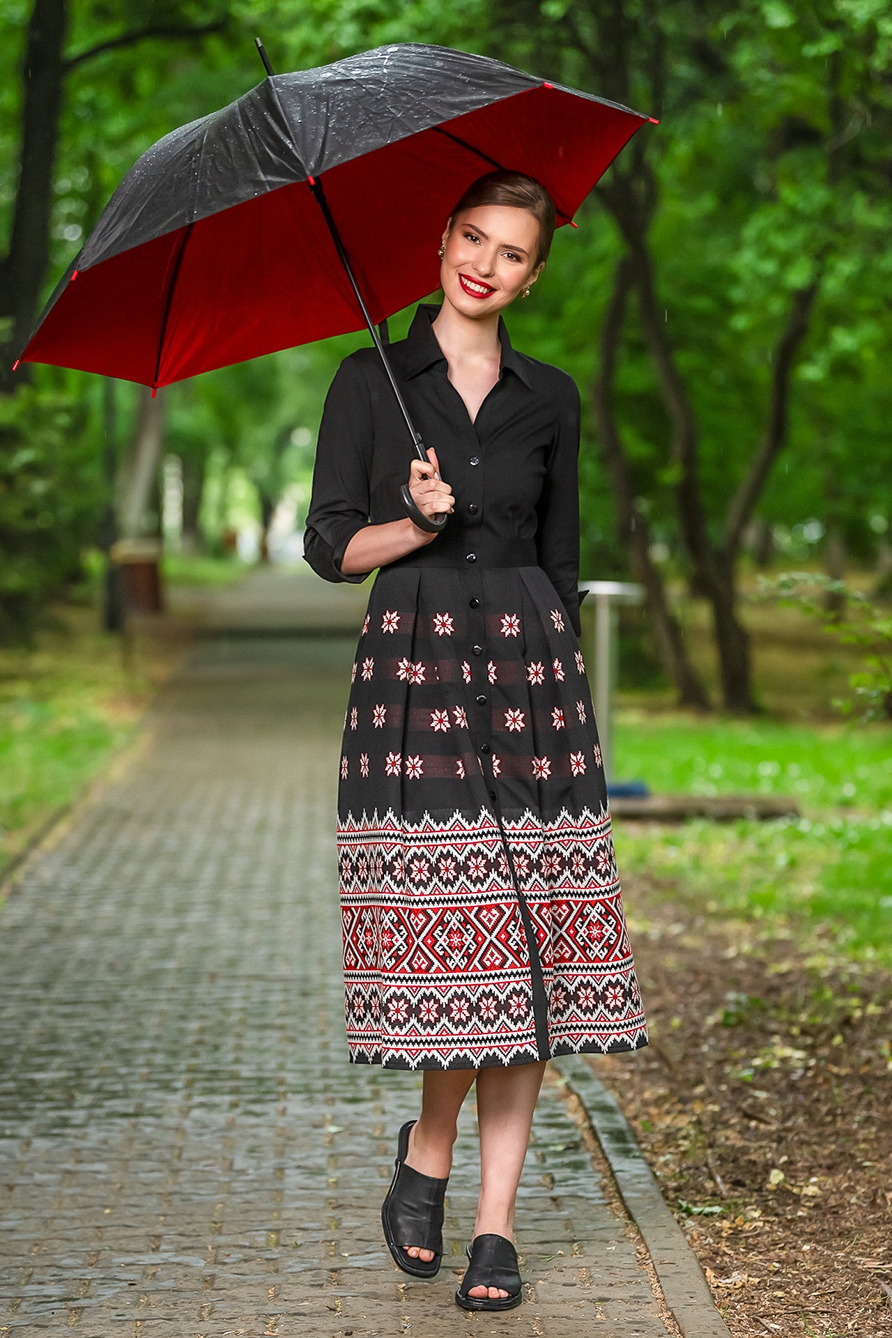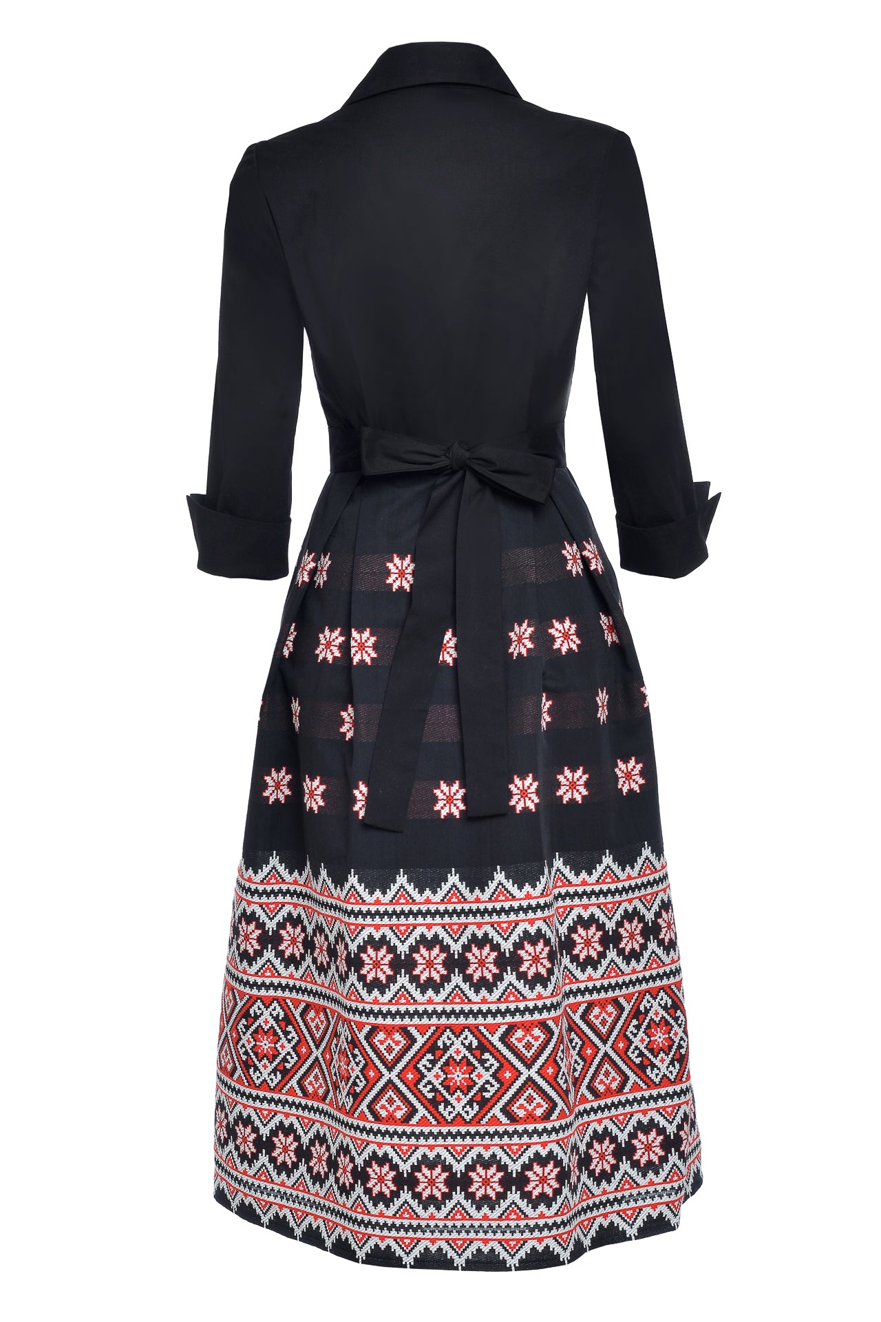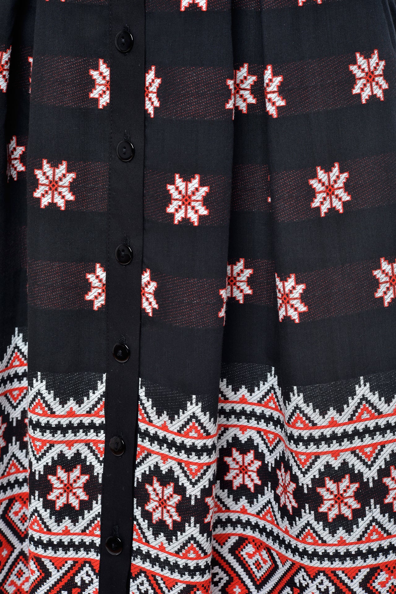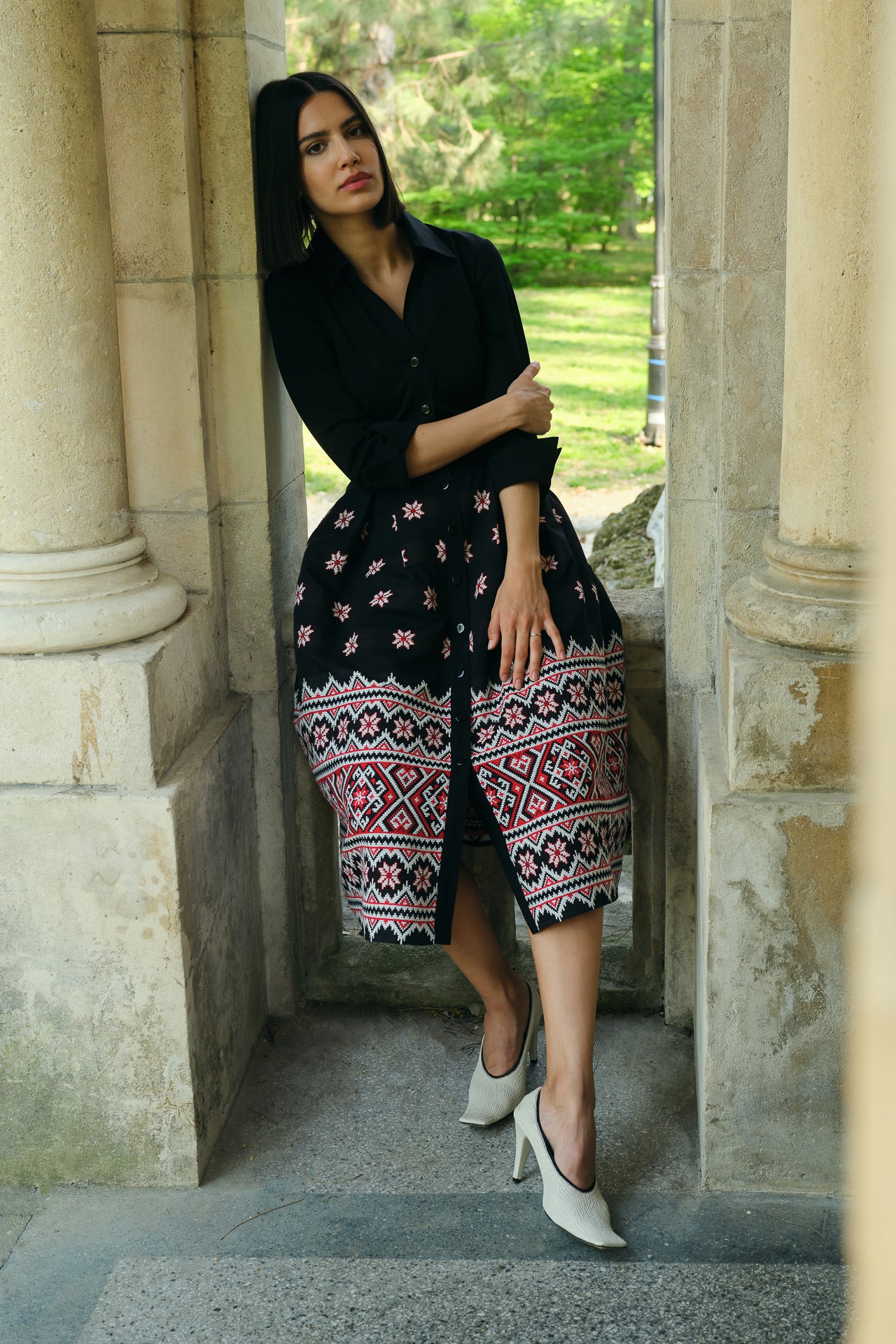 Rochia tip cămașă Isadora este confecționată din poplin cu elastan și fustă din jacquard etnic țesut în contextură cu motive populare.