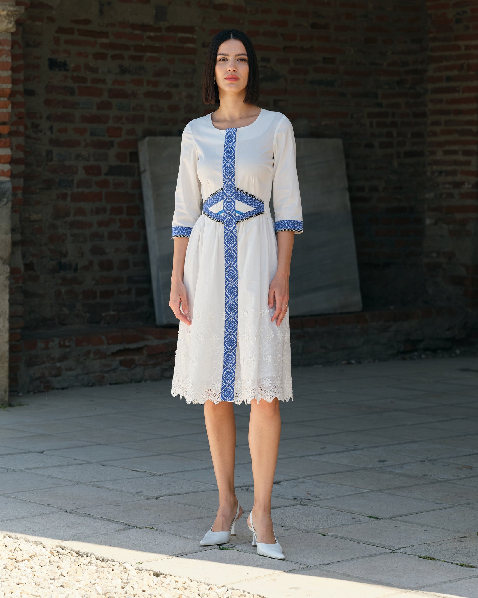 Rochia tip cămașă midi Ralu este confecționată din bumbac cu elastan și jacquard etnic albastru, țesut în contextură (NU prin vopsirea sau printarea materialului).