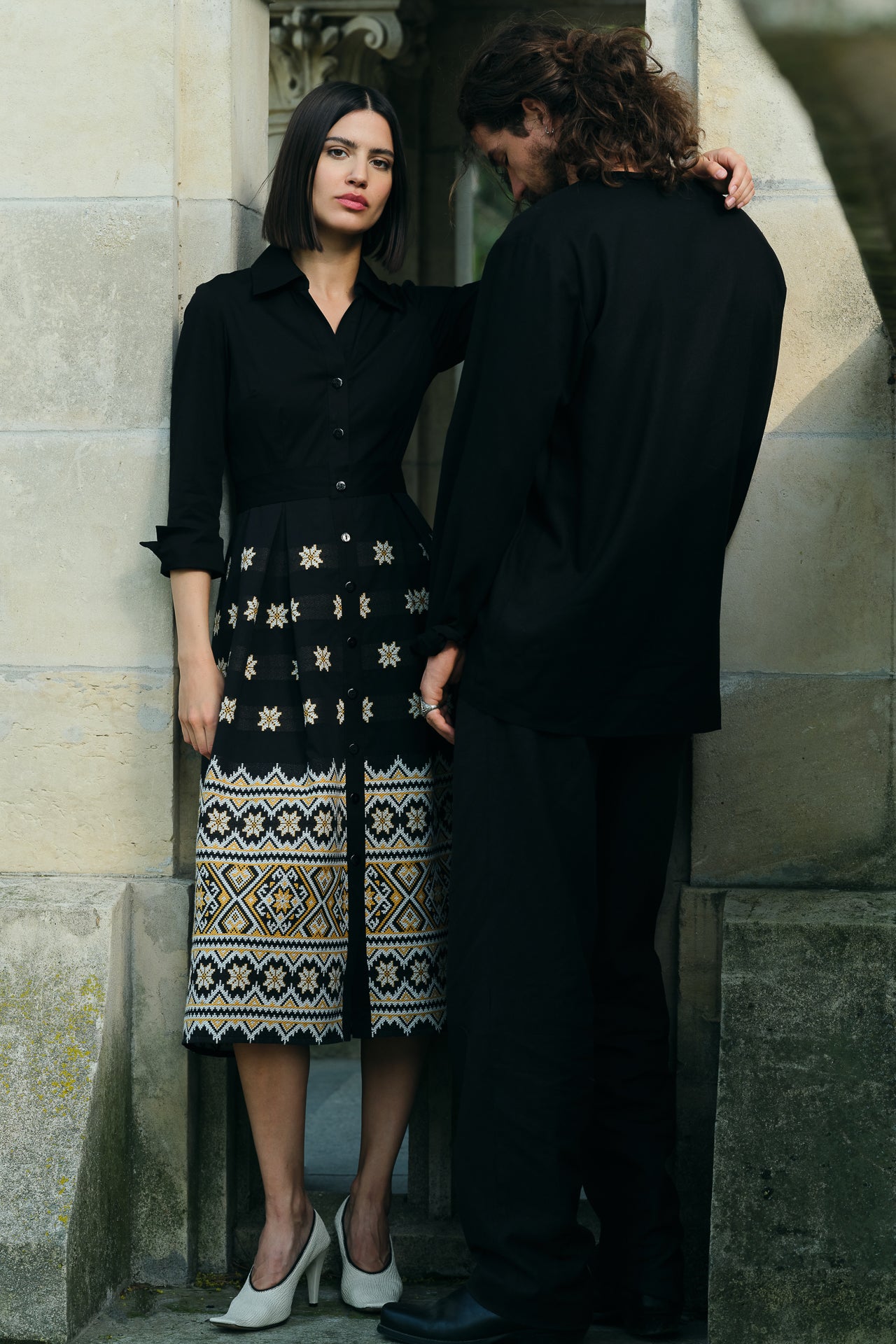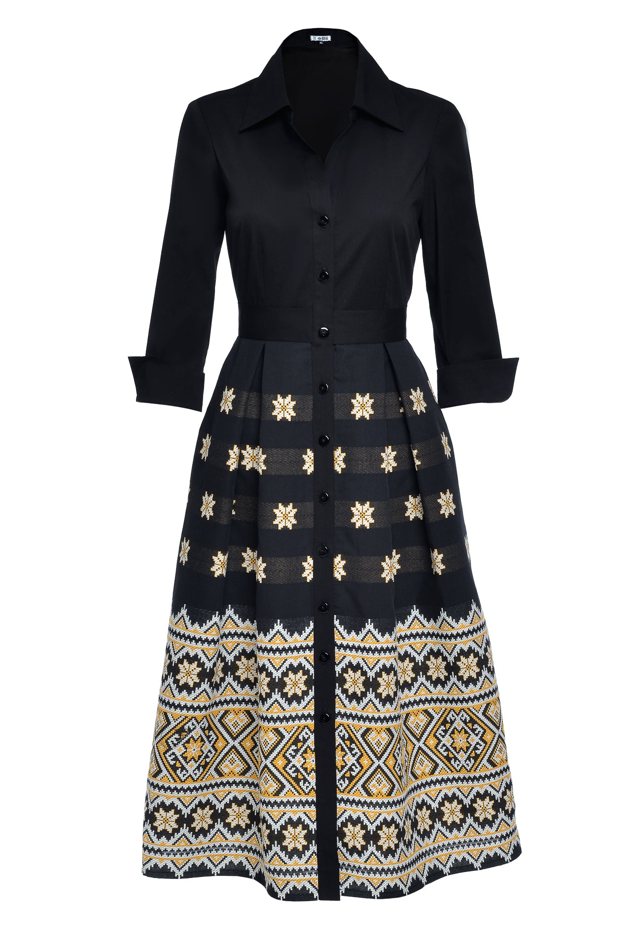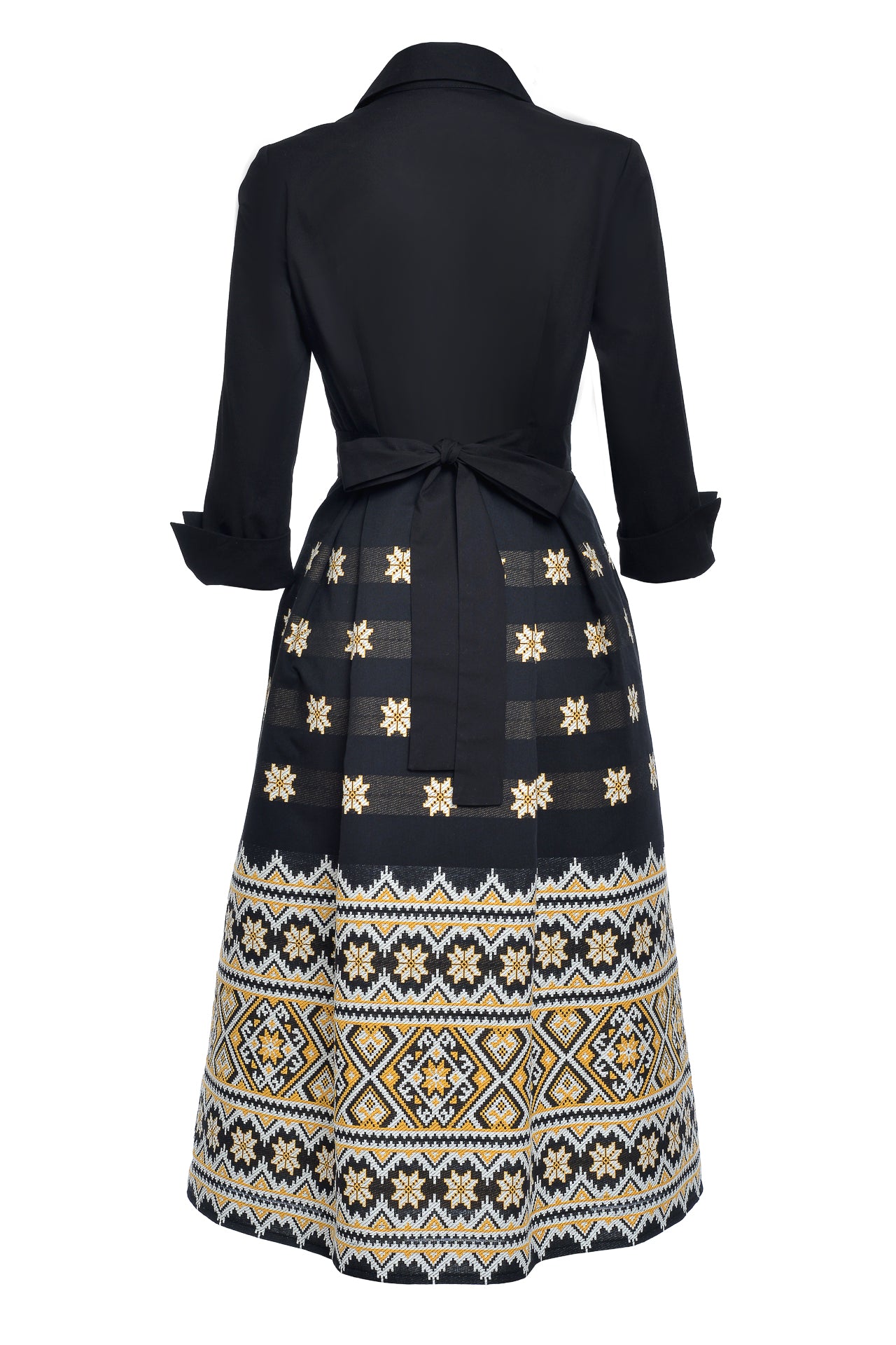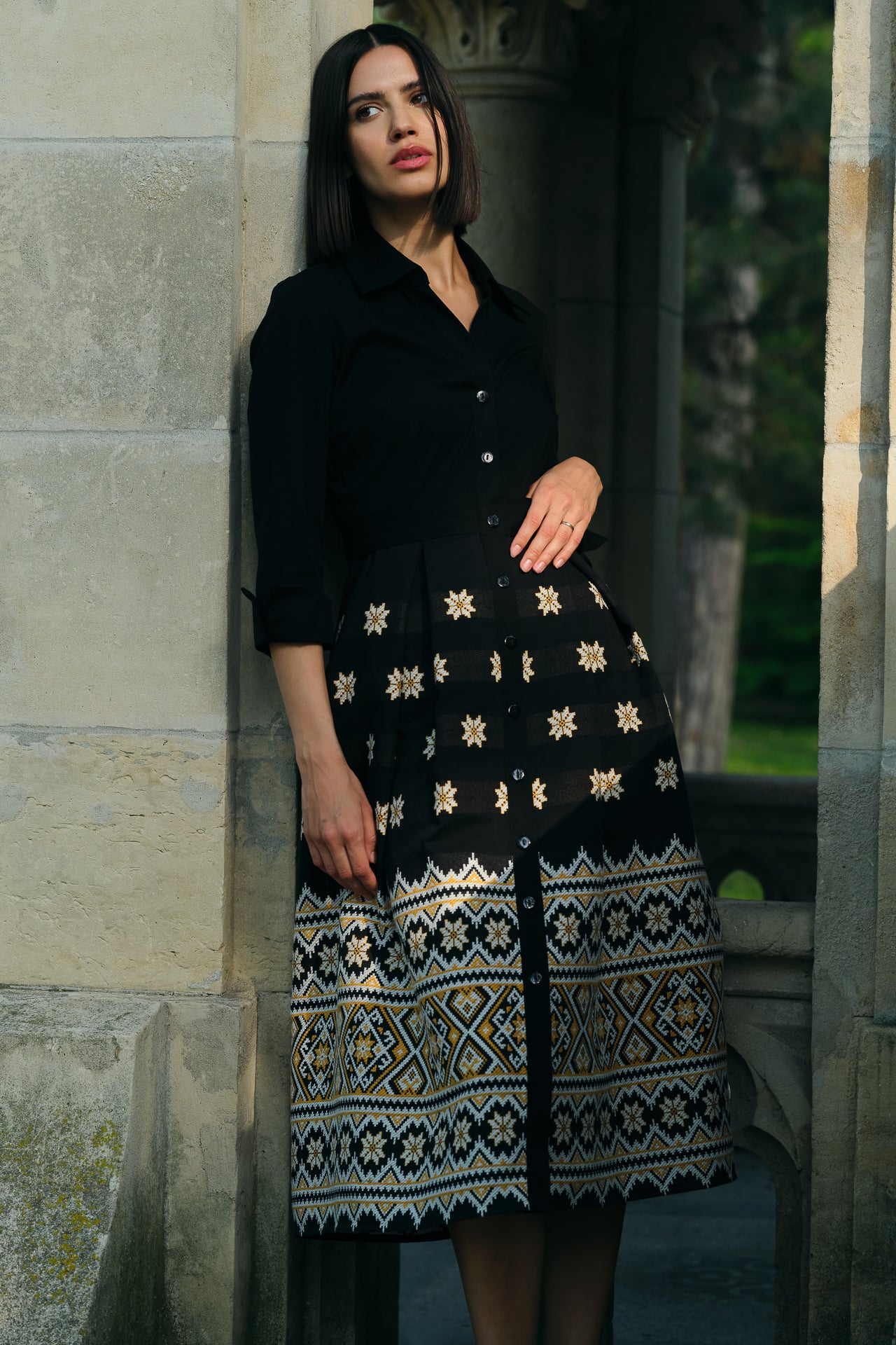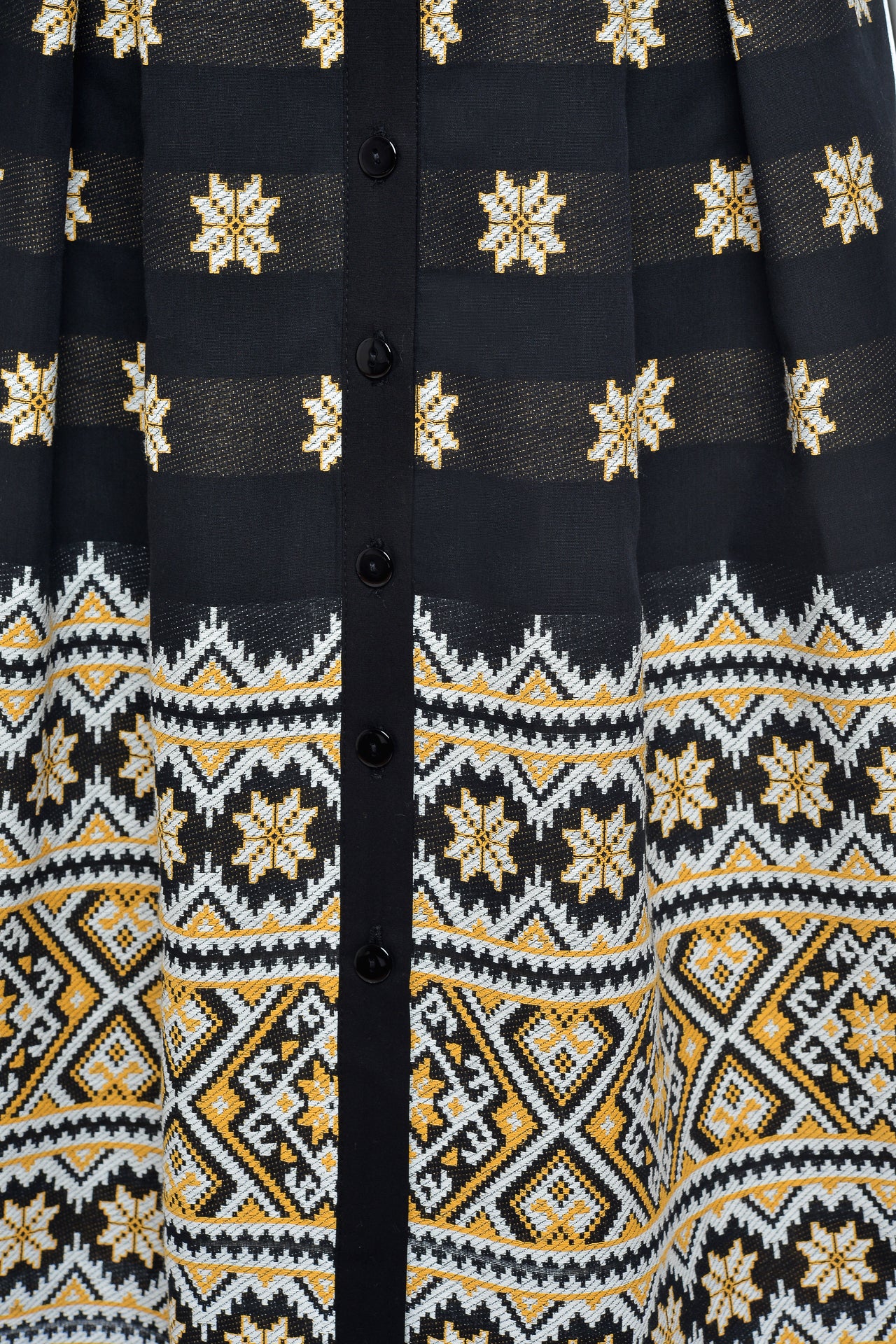 Rochia tip cămașă Varvara este confecționată din poplin cu elastan și fustă din jacquard etnic țesut în contextură cu motive populare.