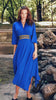 Rochia turcoaz are un croi versatil și sofisticat, cu talia marcată de jacquardul țesut și fusta în colțuri cu corseletă.