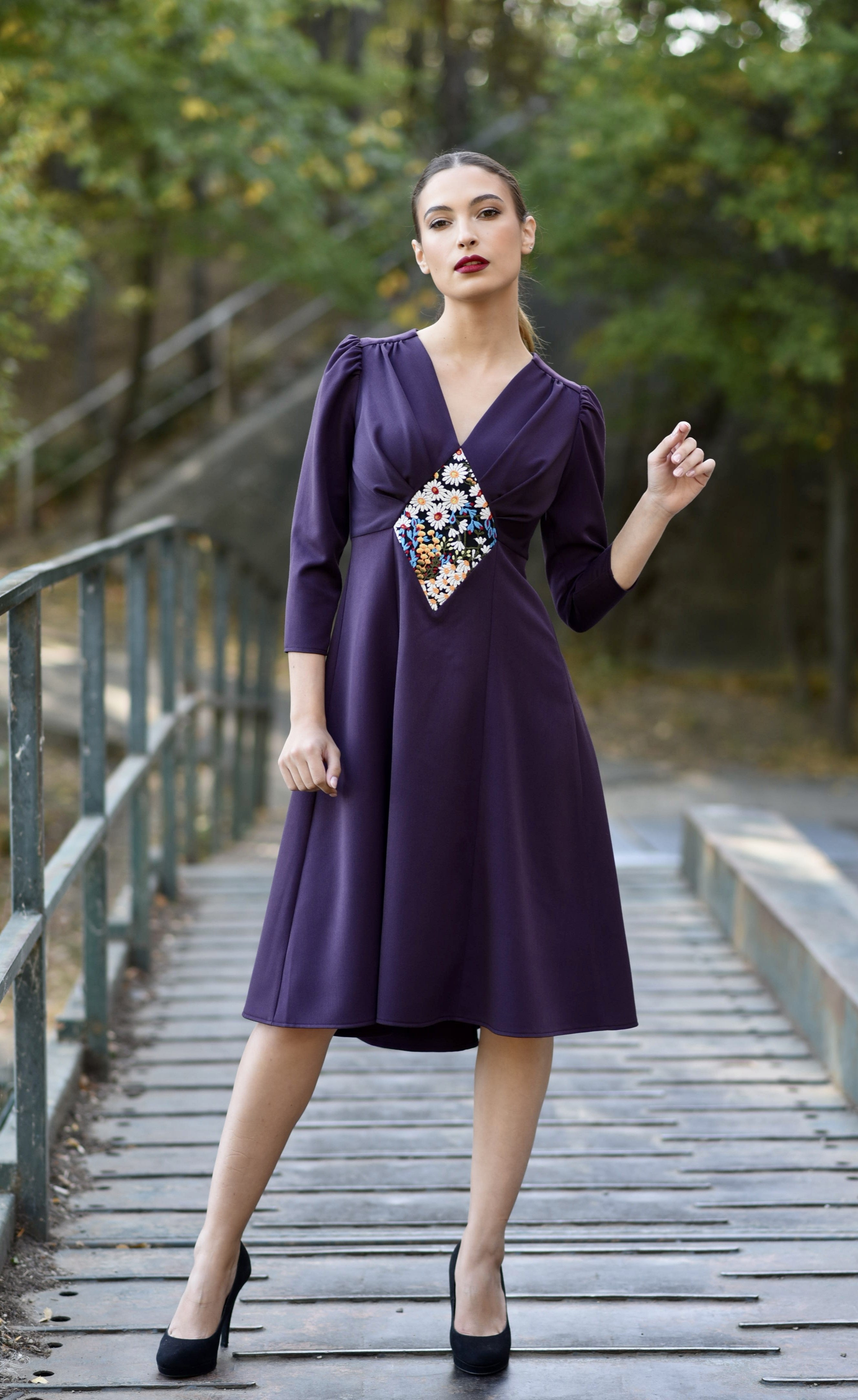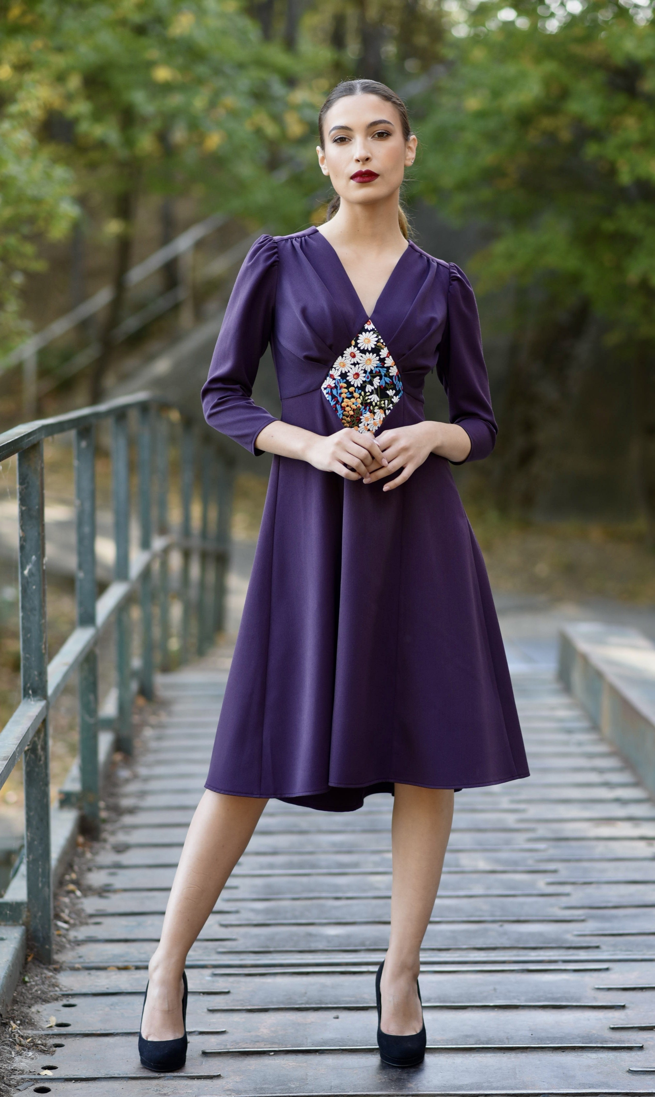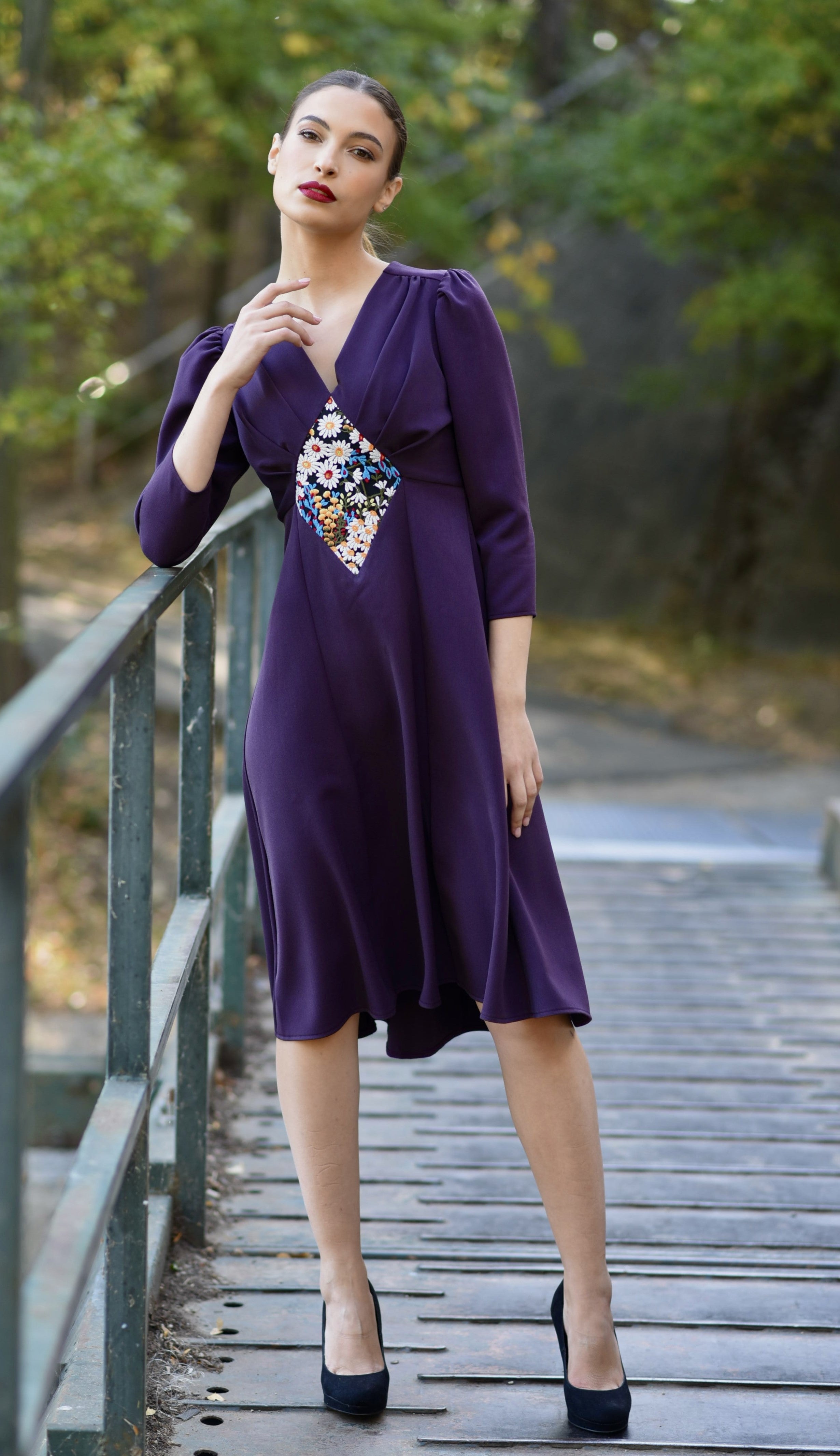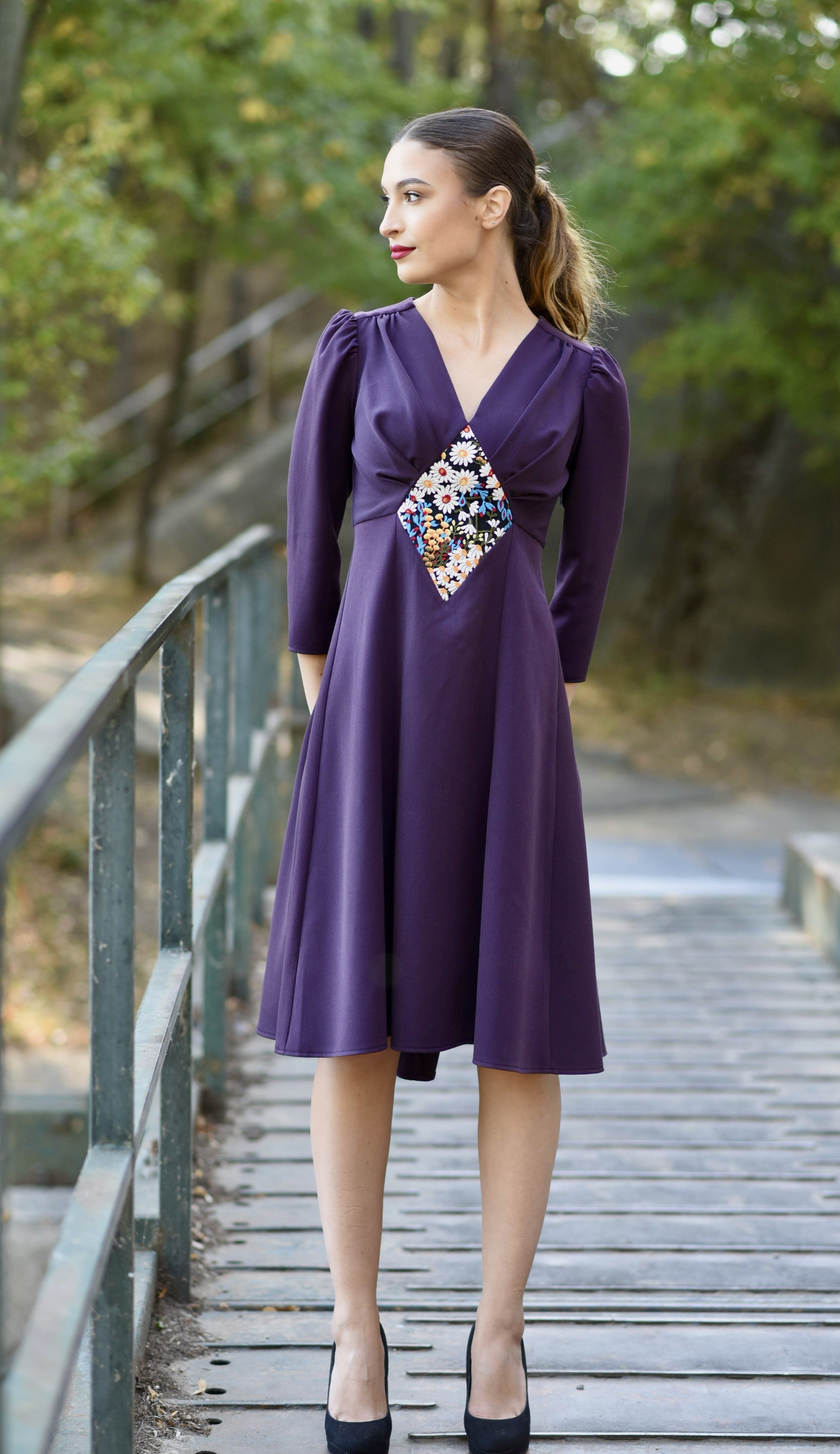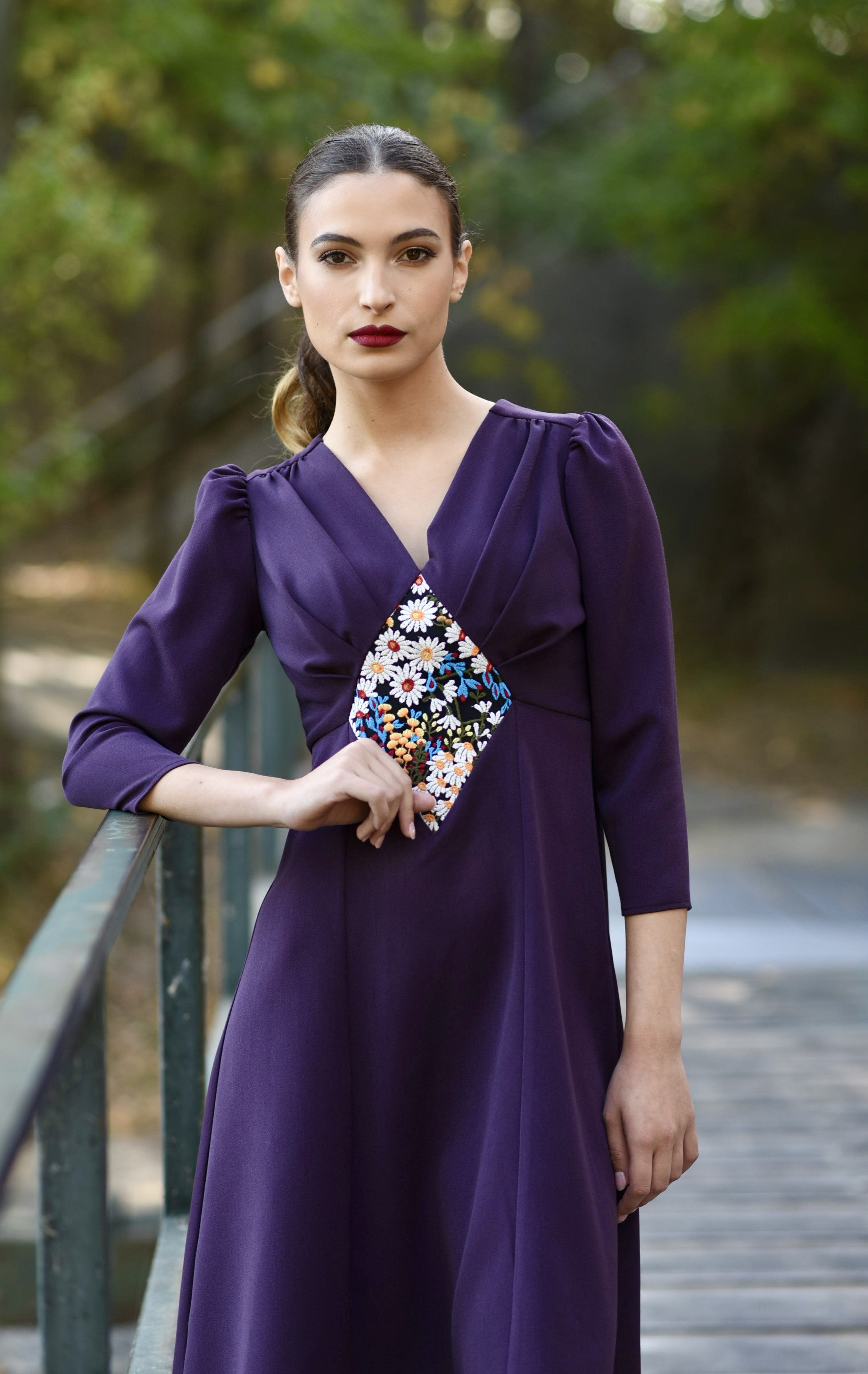 viscoză violet închis și elastan, cu detaliu floral brodat, și are un croi midi elegant
