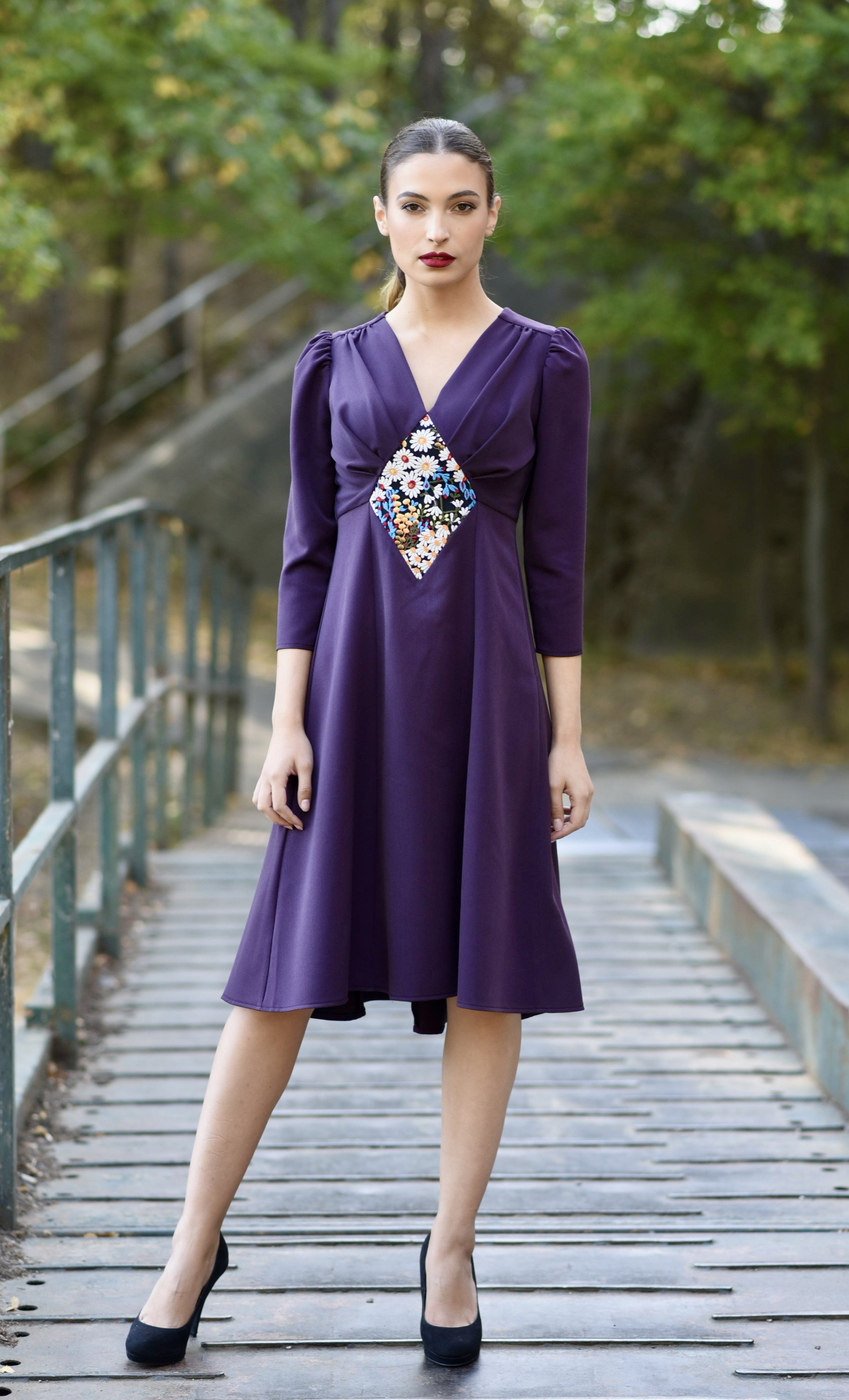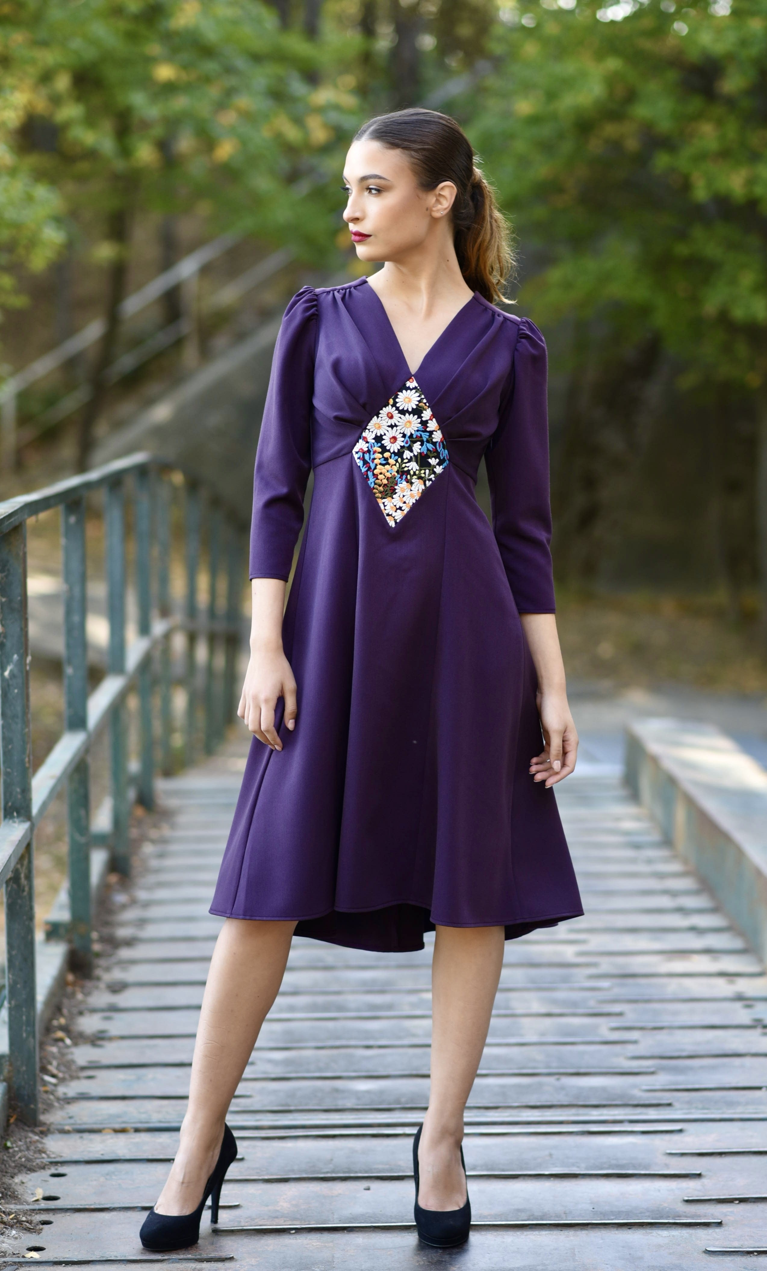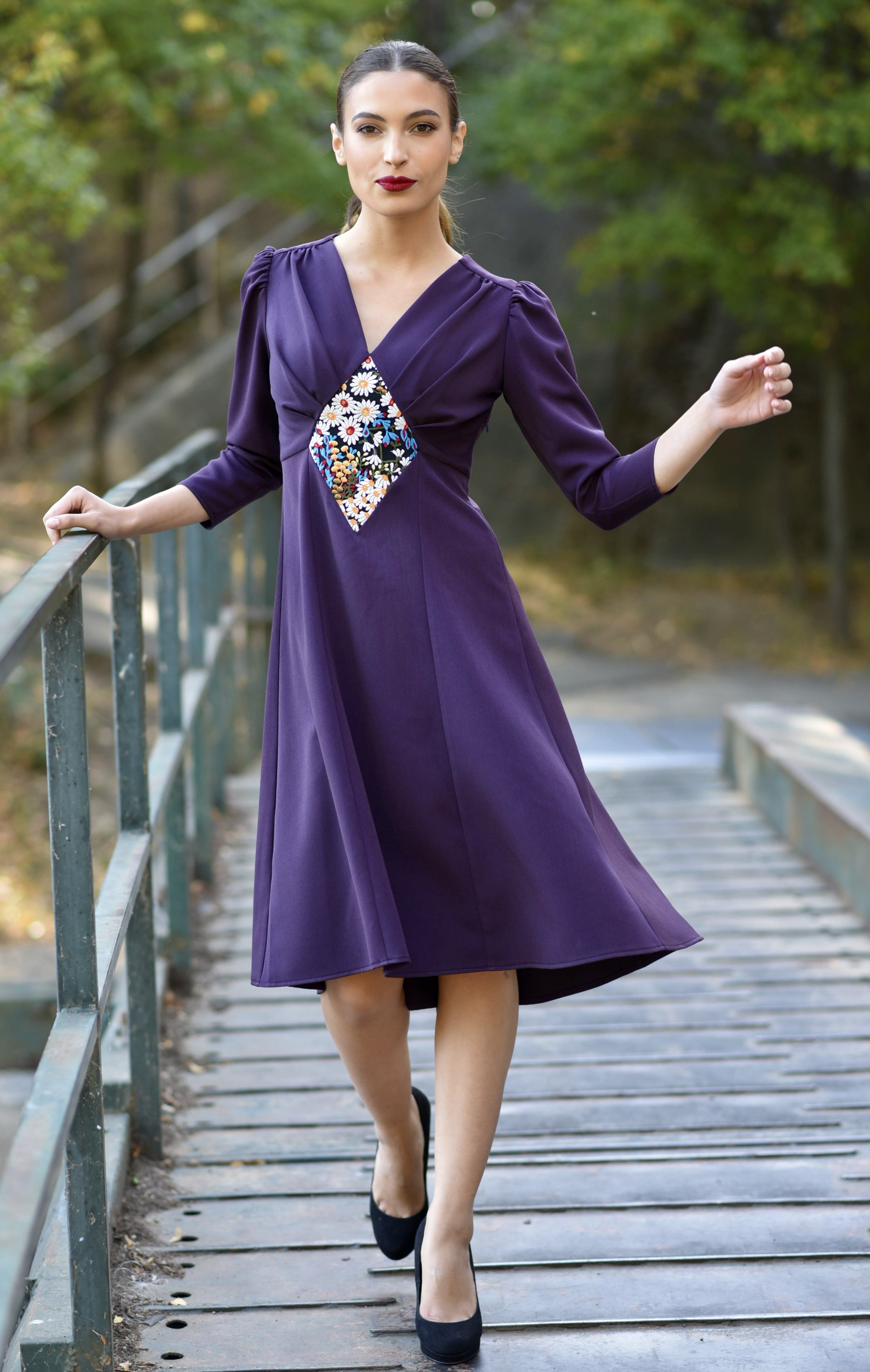 Rochia din stofa violet Medeea este confecționată din stofă fină de