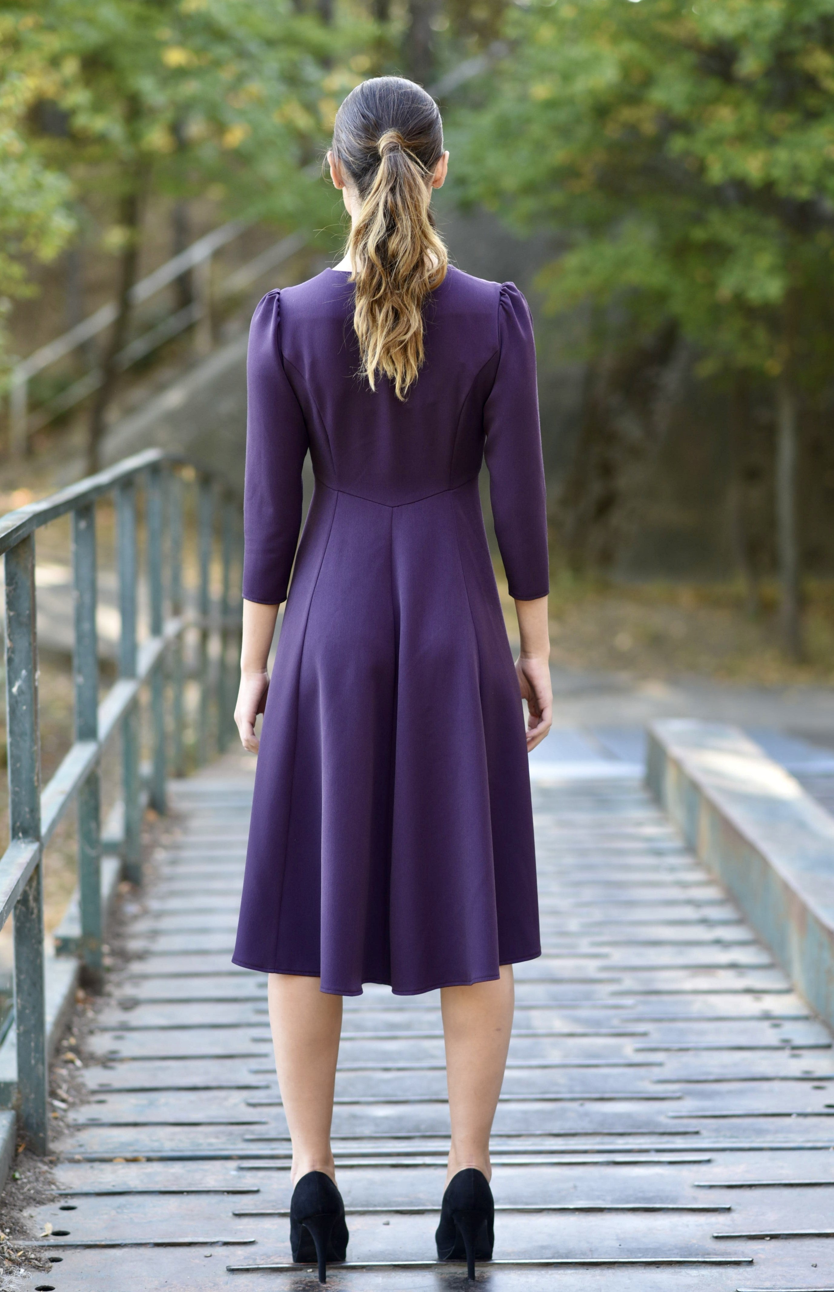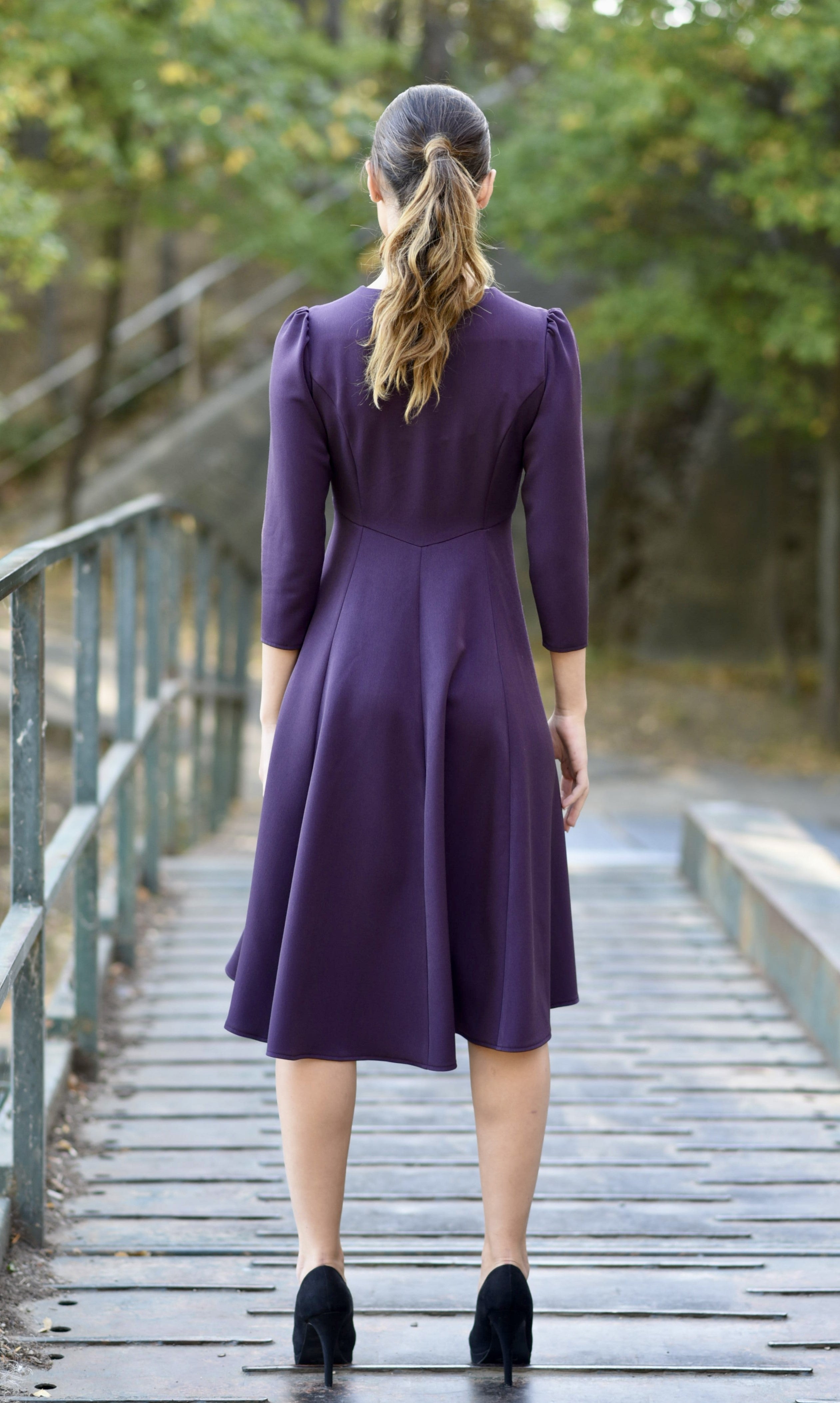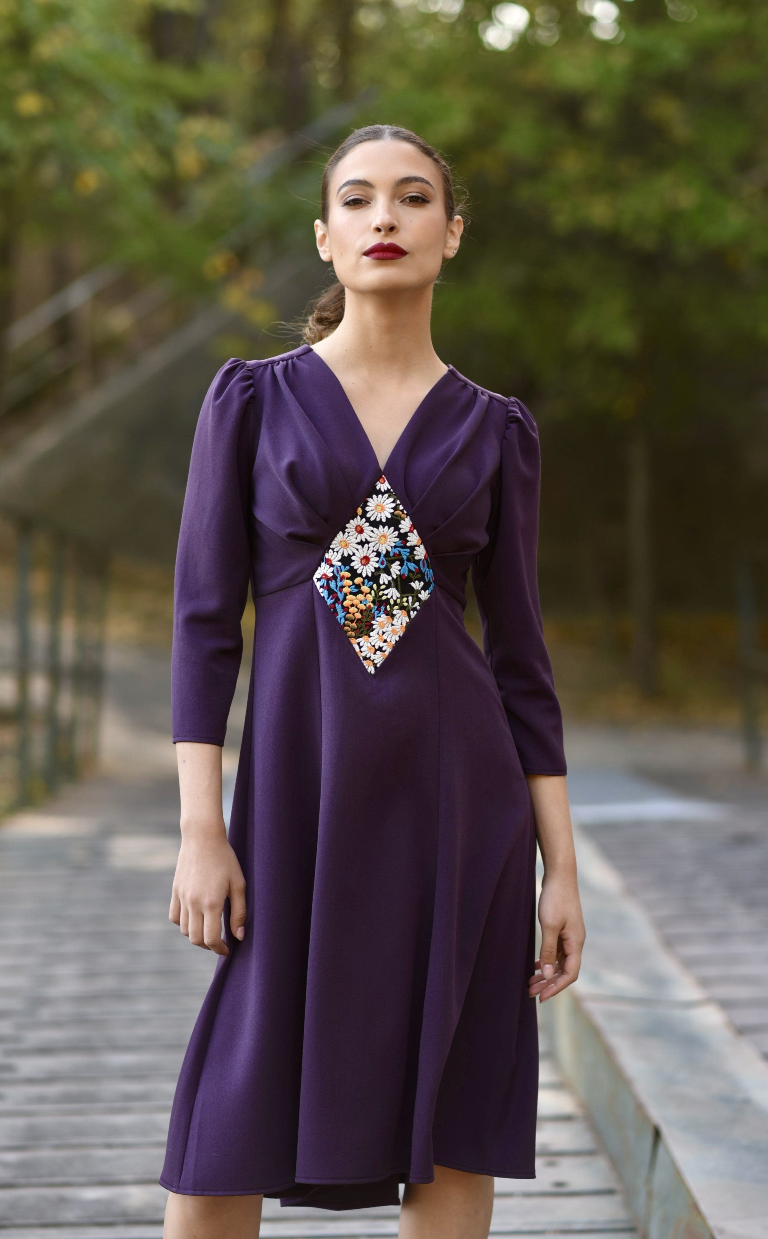 Rochia din stofa violet Medeea este confecționată din stofă fină de