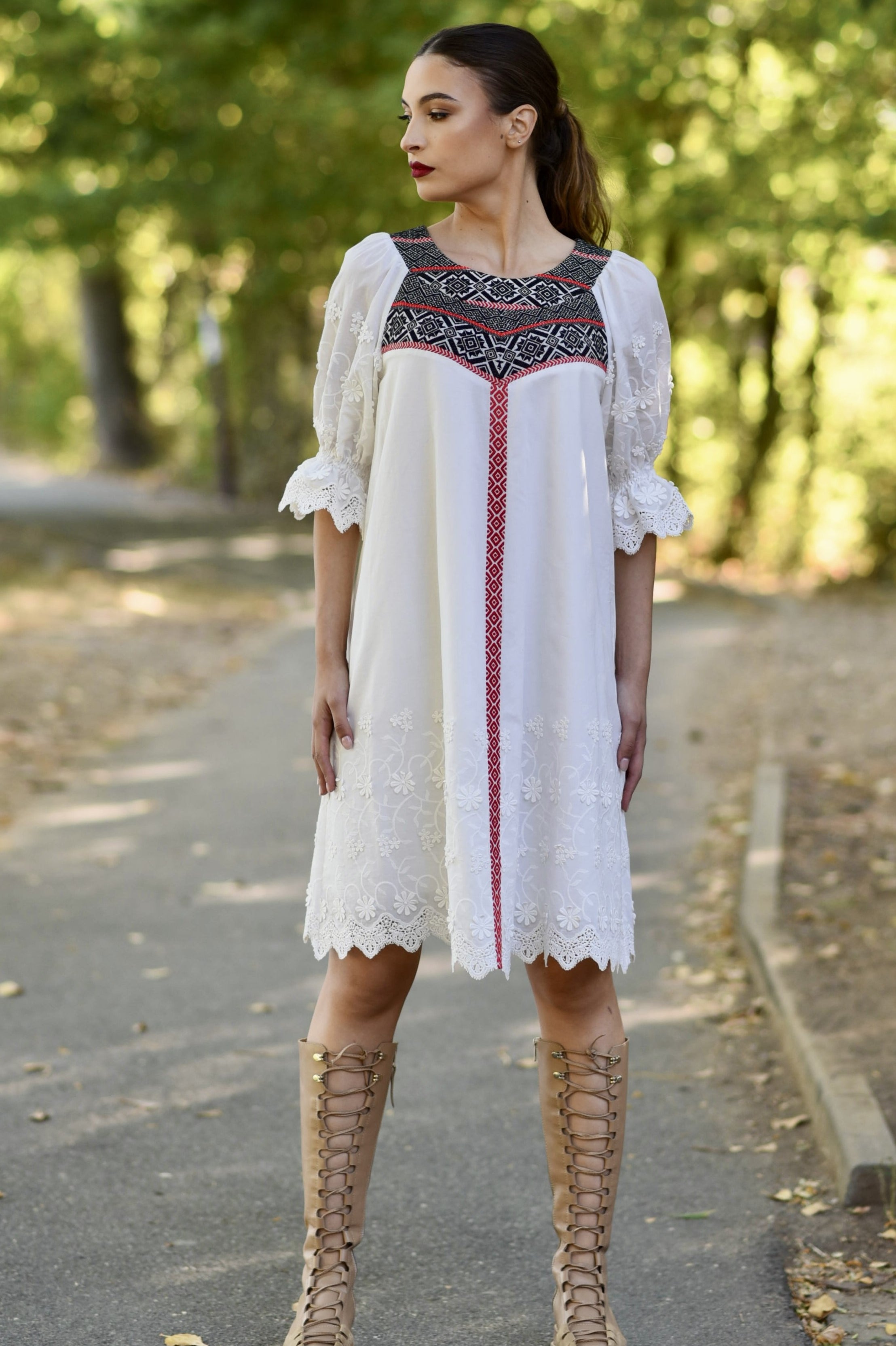 Casual - Cine spune că o variantă tradițională nu poate arăta spectaculos într-o combinație casual? Stilul tău va căpăta o notă fresh, tinerească, dar în același timp extravagantă. Poți adăuga rochiei o pereche de bocanci cu platformă sau de cizme lungi, peste genunchi și o jachetă de piele sau de blugi. Nu uita de accesorii: bijuterii handmade, un rucsac colorat și o pălărie în același ton.