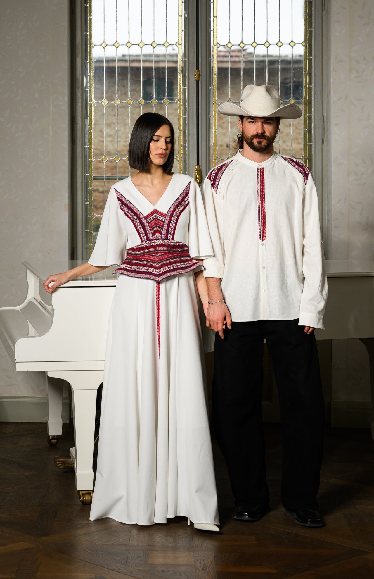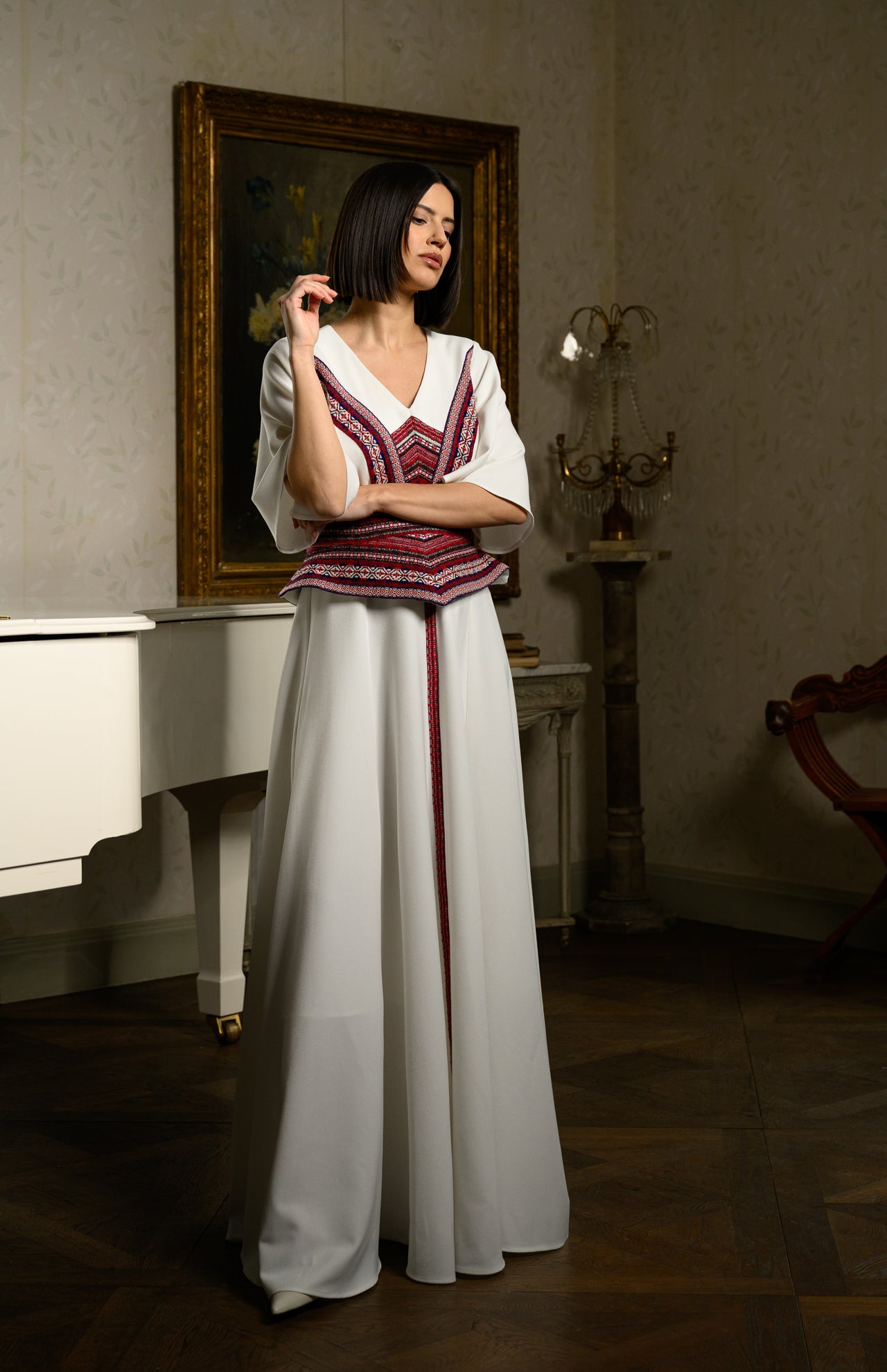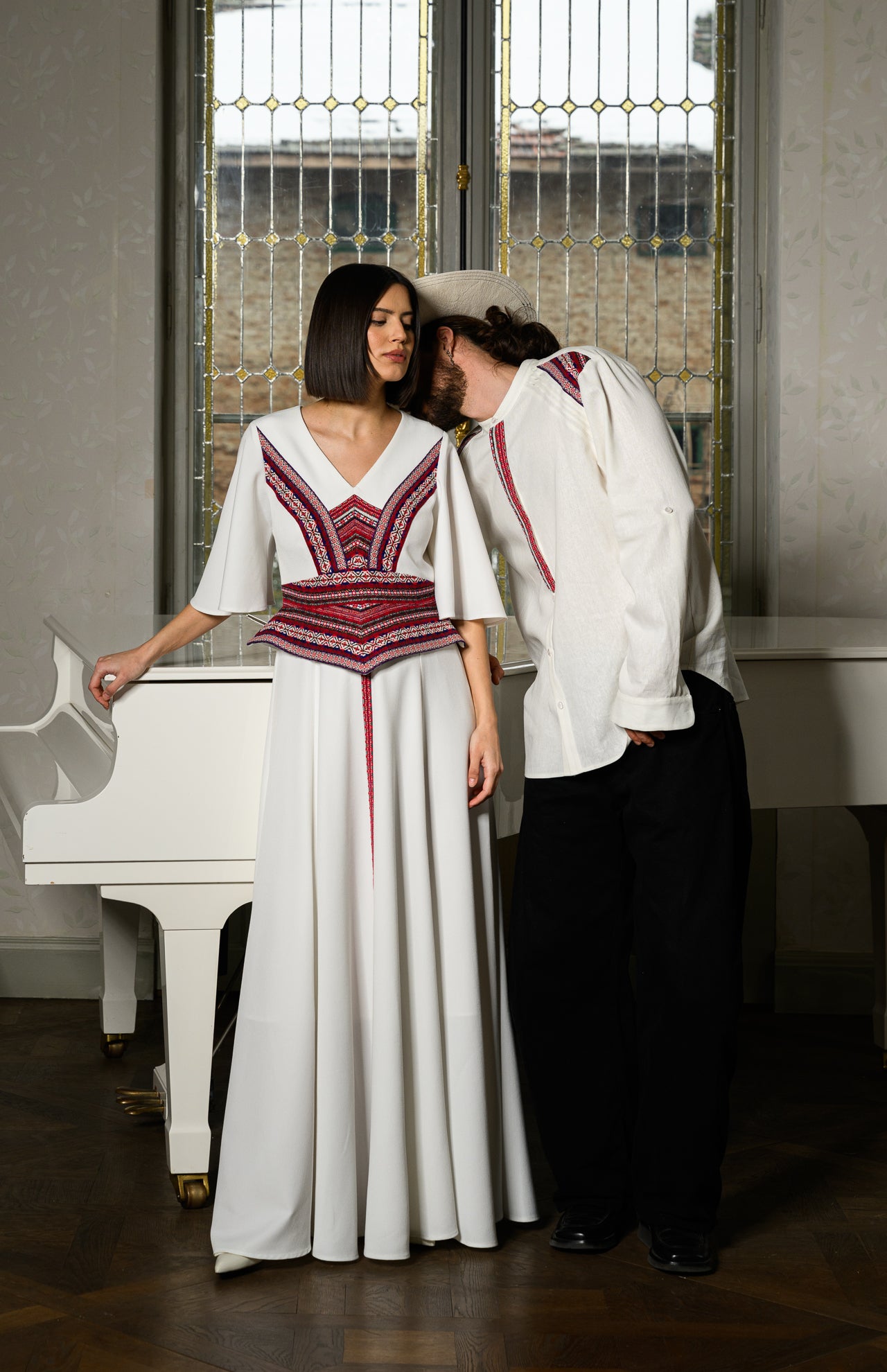 Rochia mireasă stilizată cu motive tradiționale țesute Mara