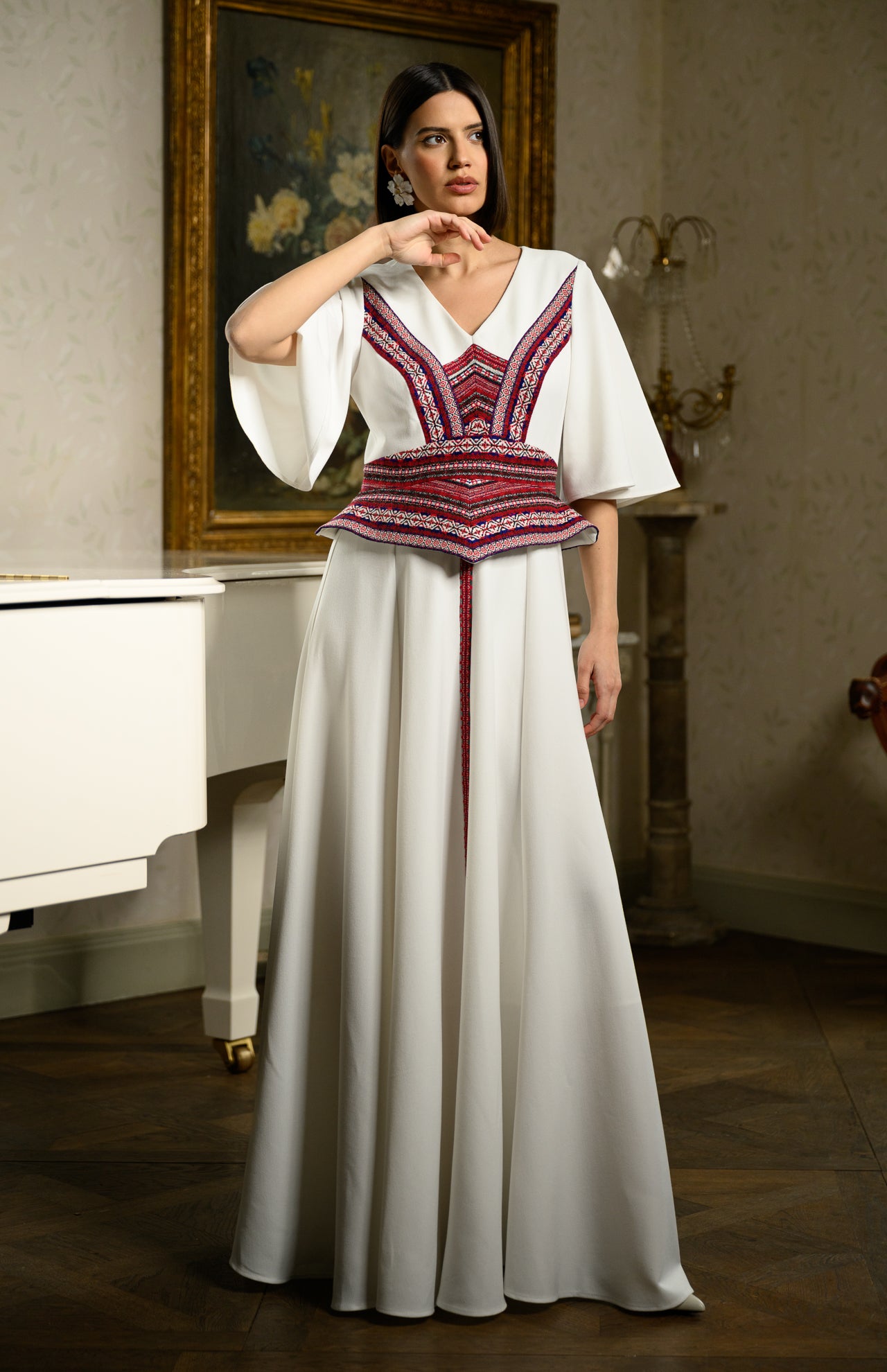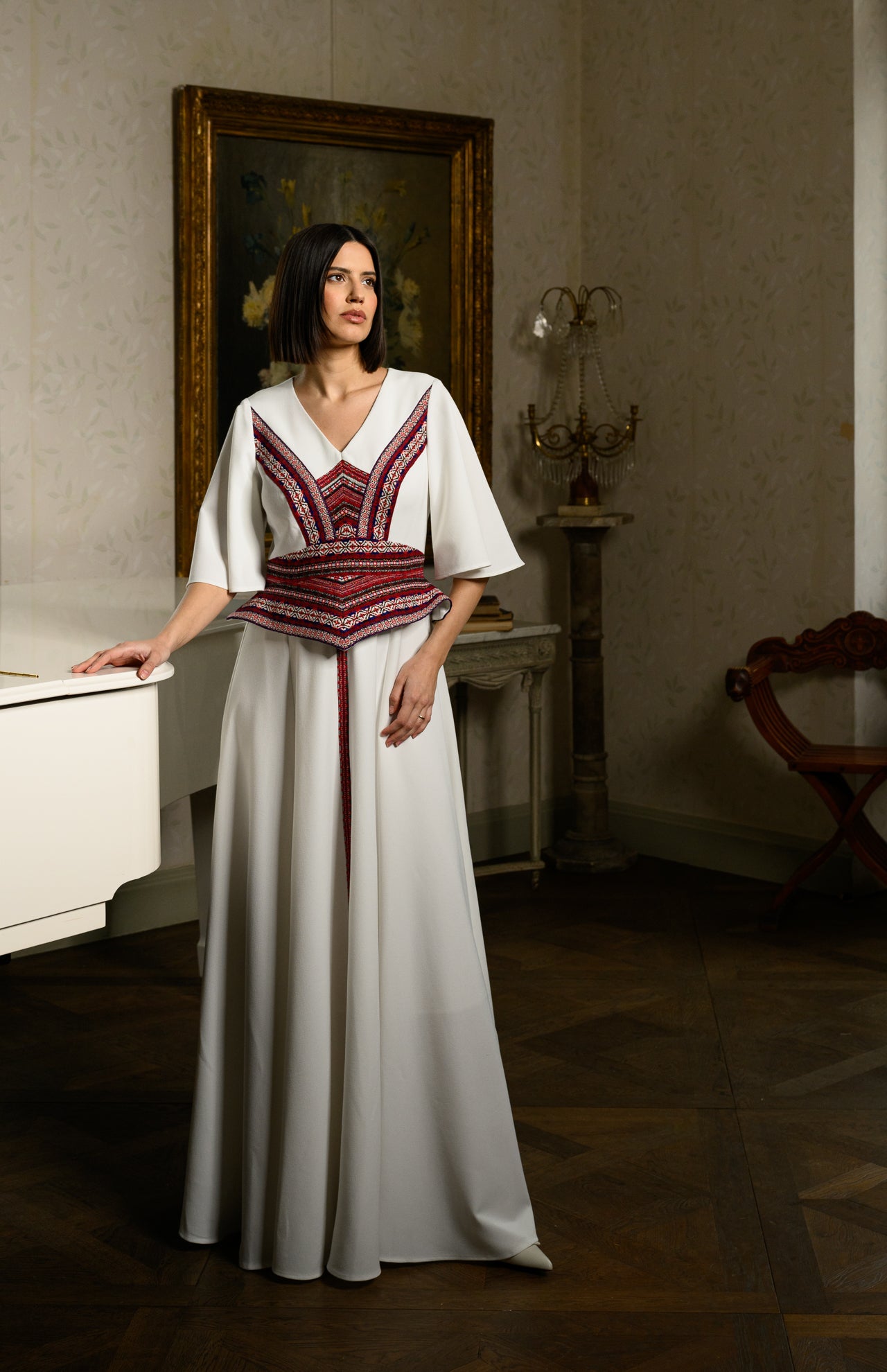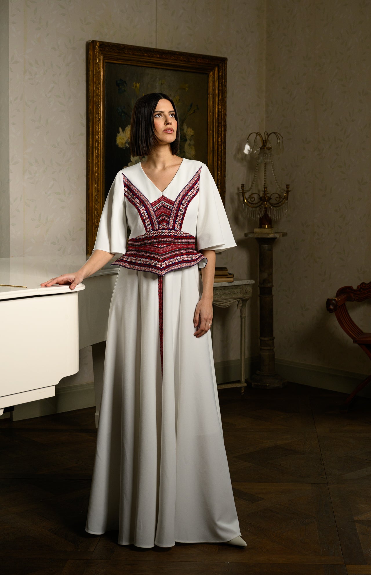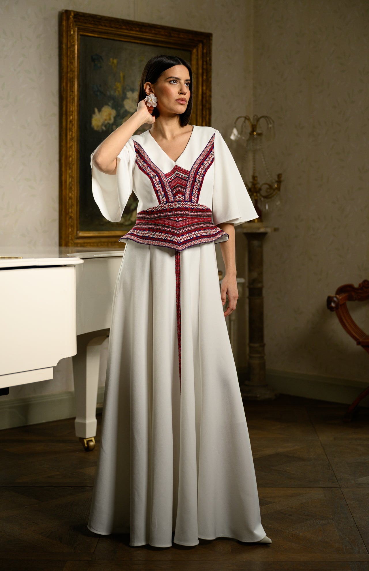 Rochia mireasă stilizată cu motive tradiționale țesute Mara
