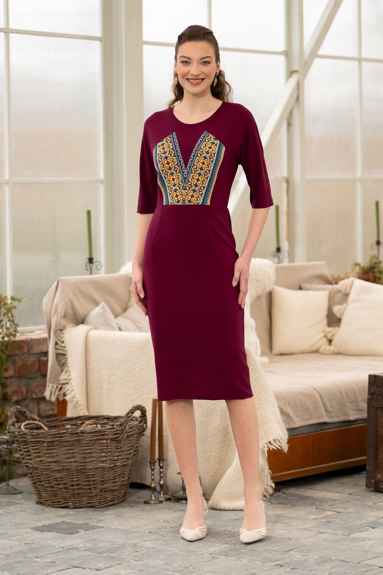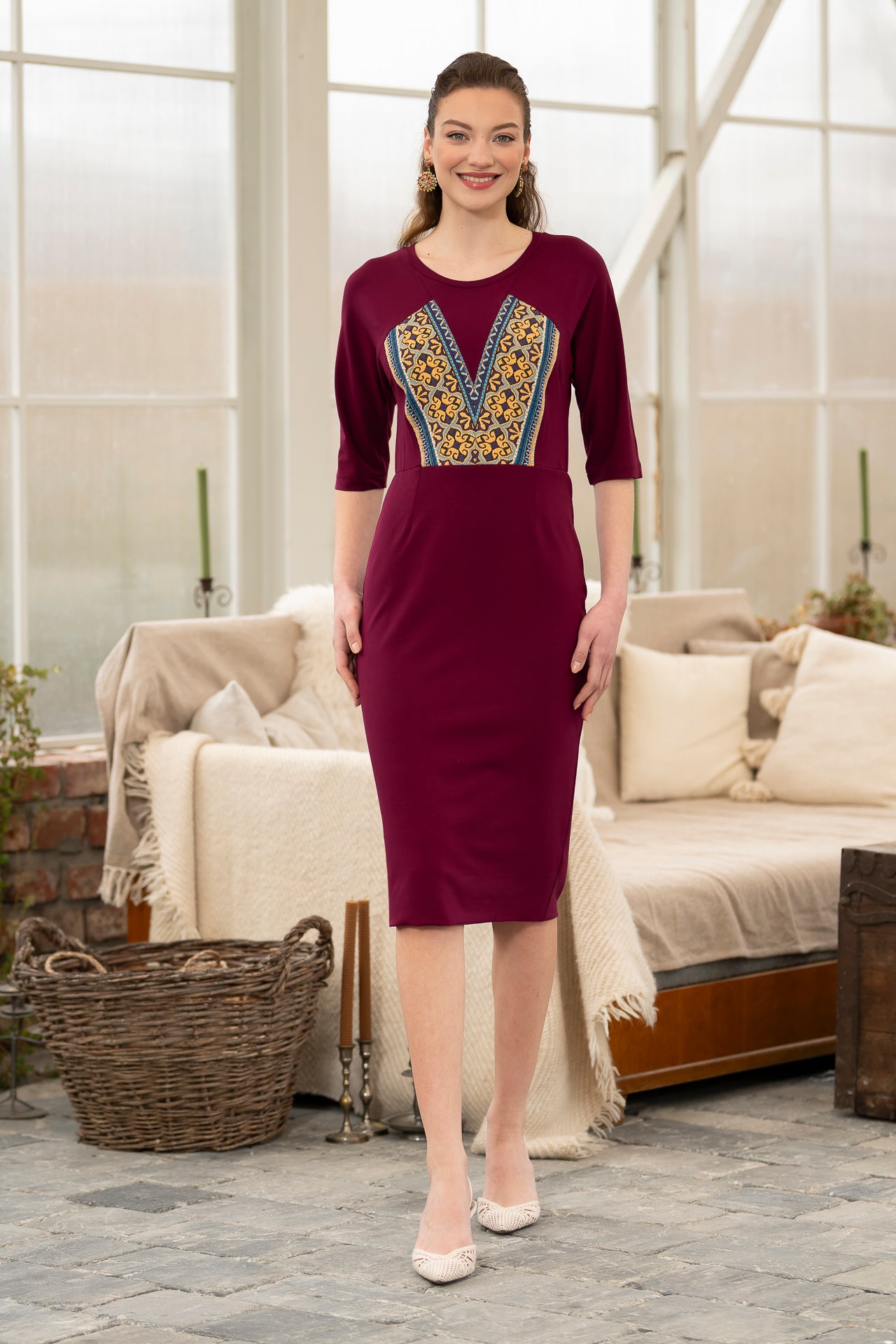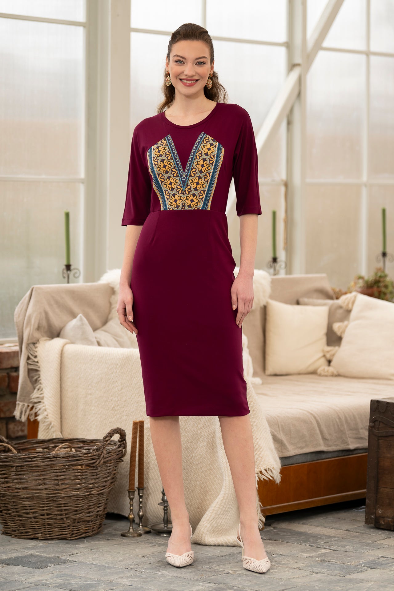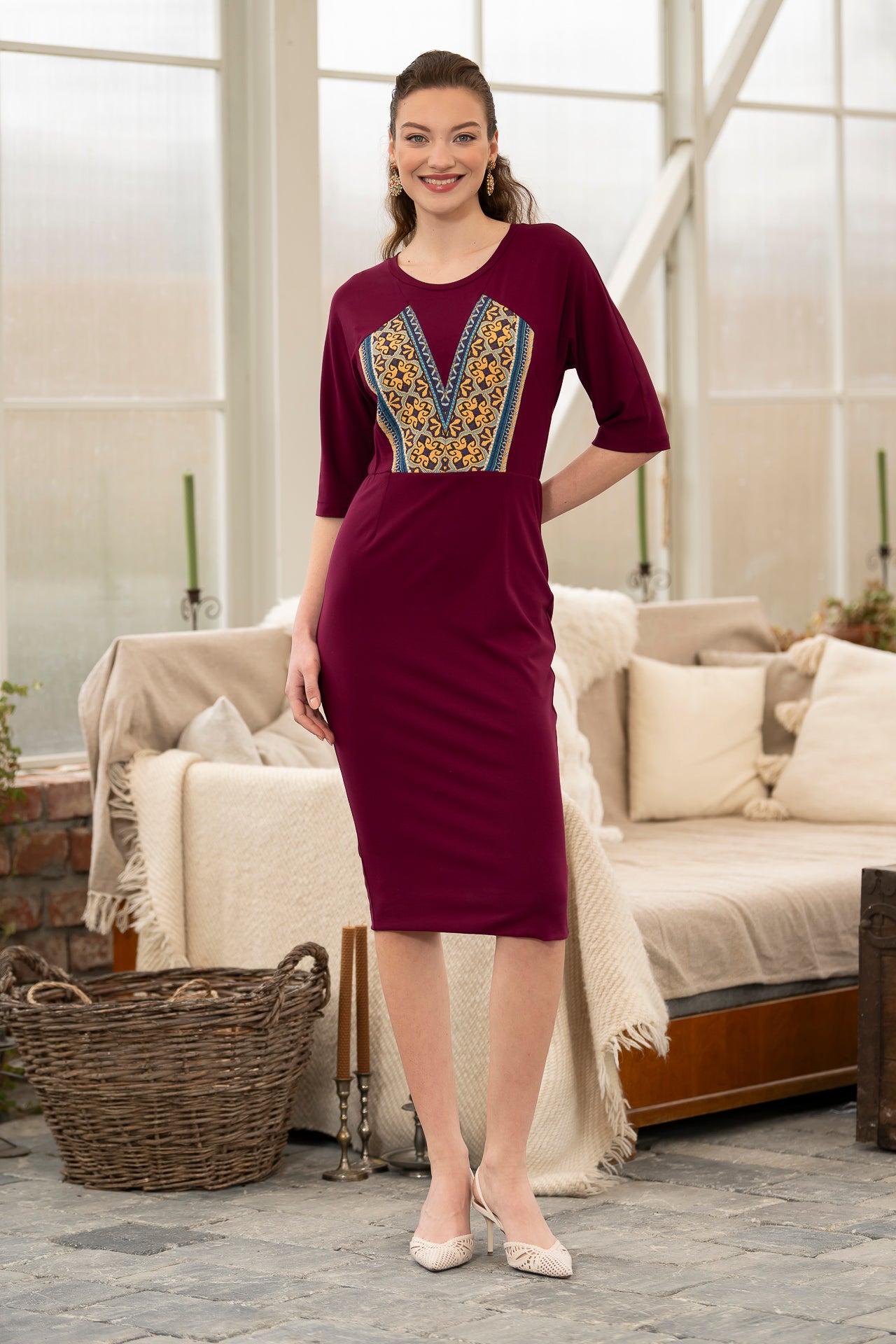 Rochia este confecționată din jerseu burgundi, premium, din viscoză cu elastan și jacquard țesut cu motive florale.