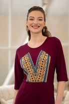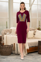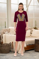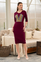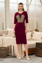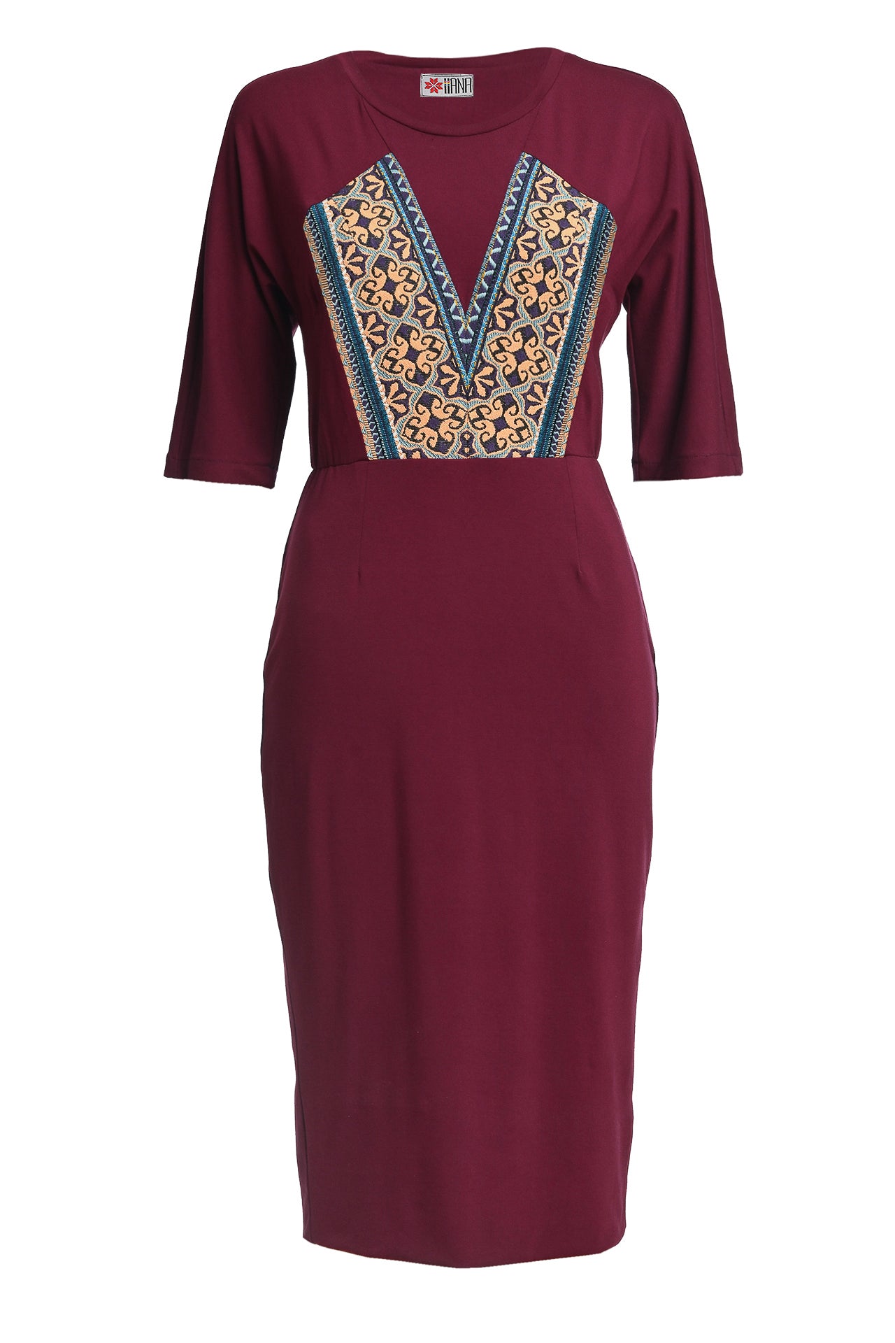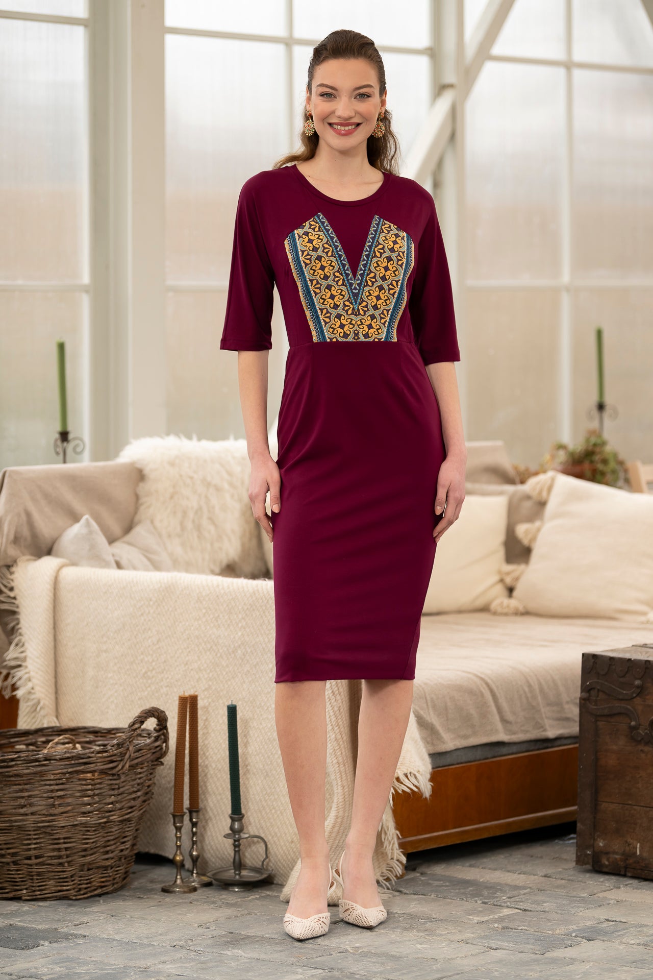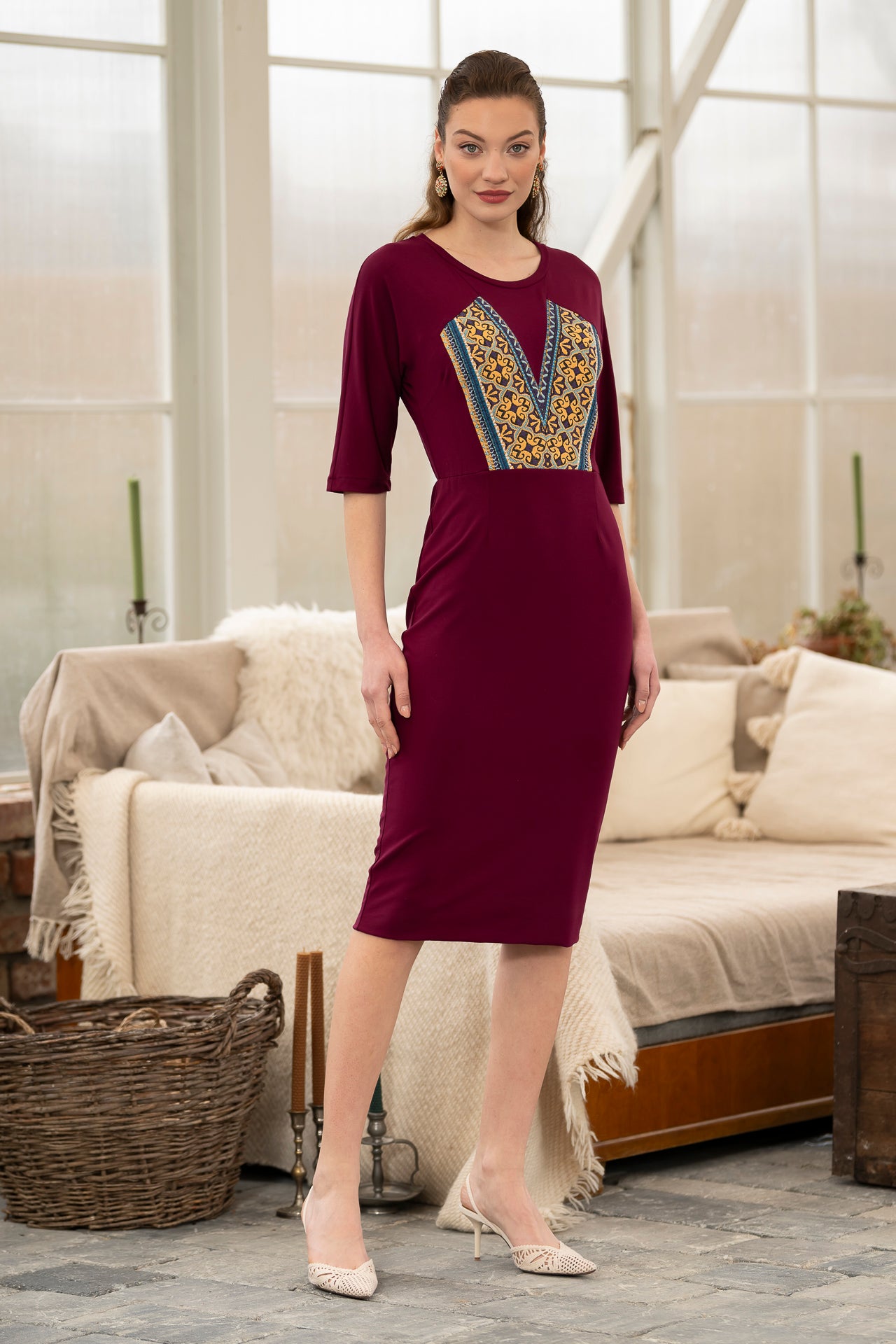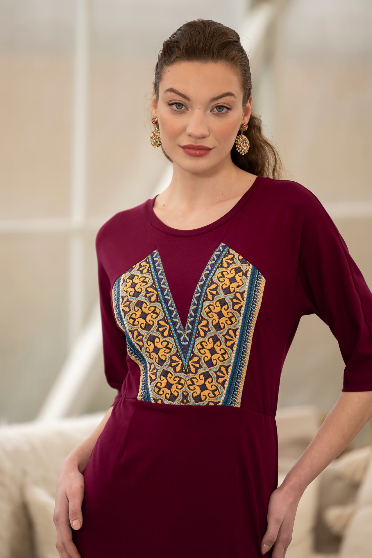 Rochia este confecționată din jerseu burgundi, premium, din viscoză cu elastan și jacquard țesut cu motive florale.