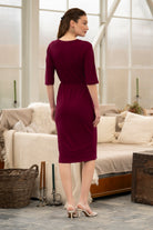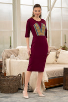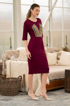 Rochia din jerseu burgundi cu corset este versatilă și avantajază doamnele minione și rubensiene.