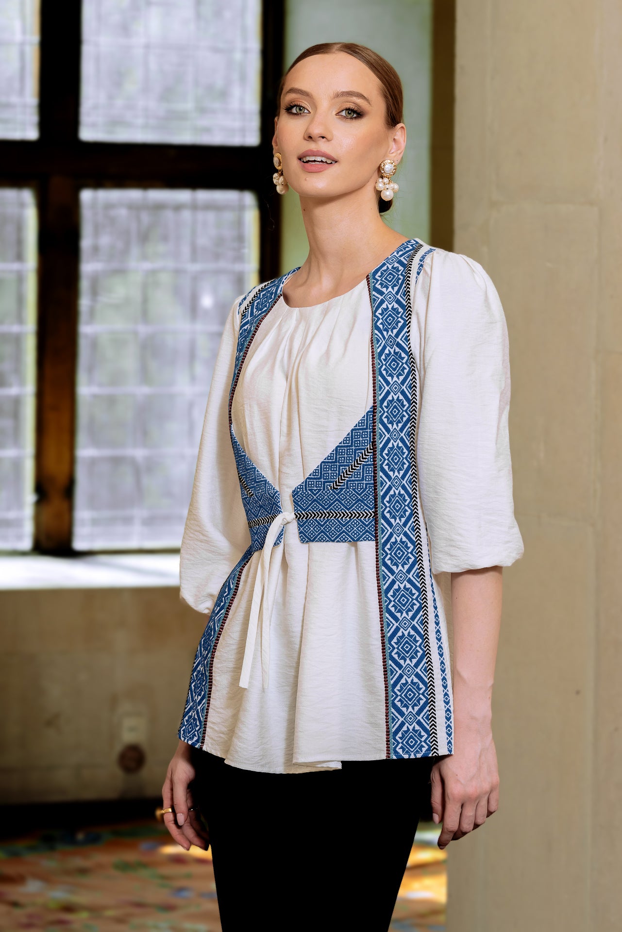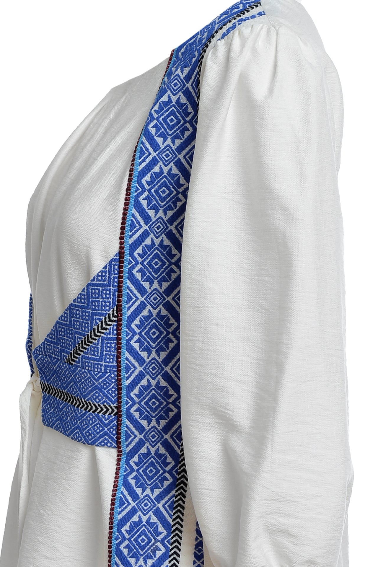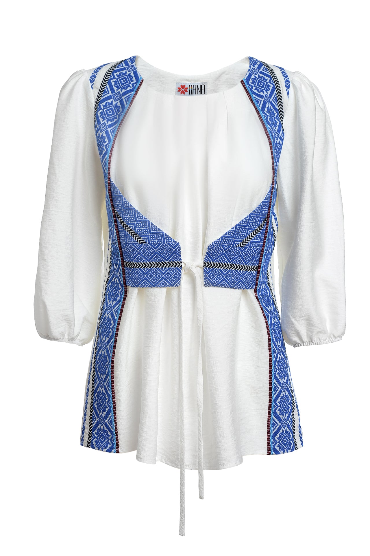 Bluza albă cu pieptar țesut albastru este confecționată din