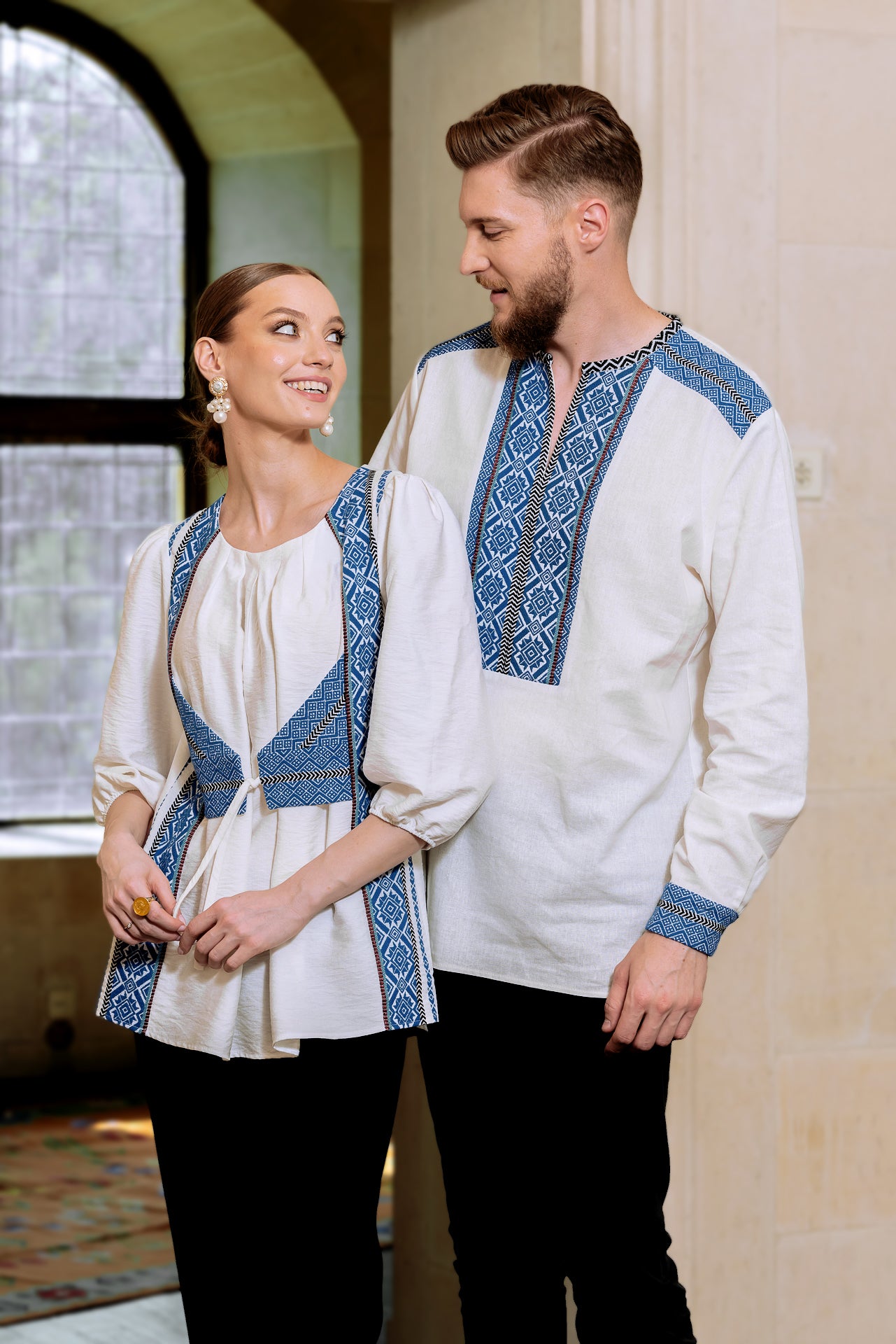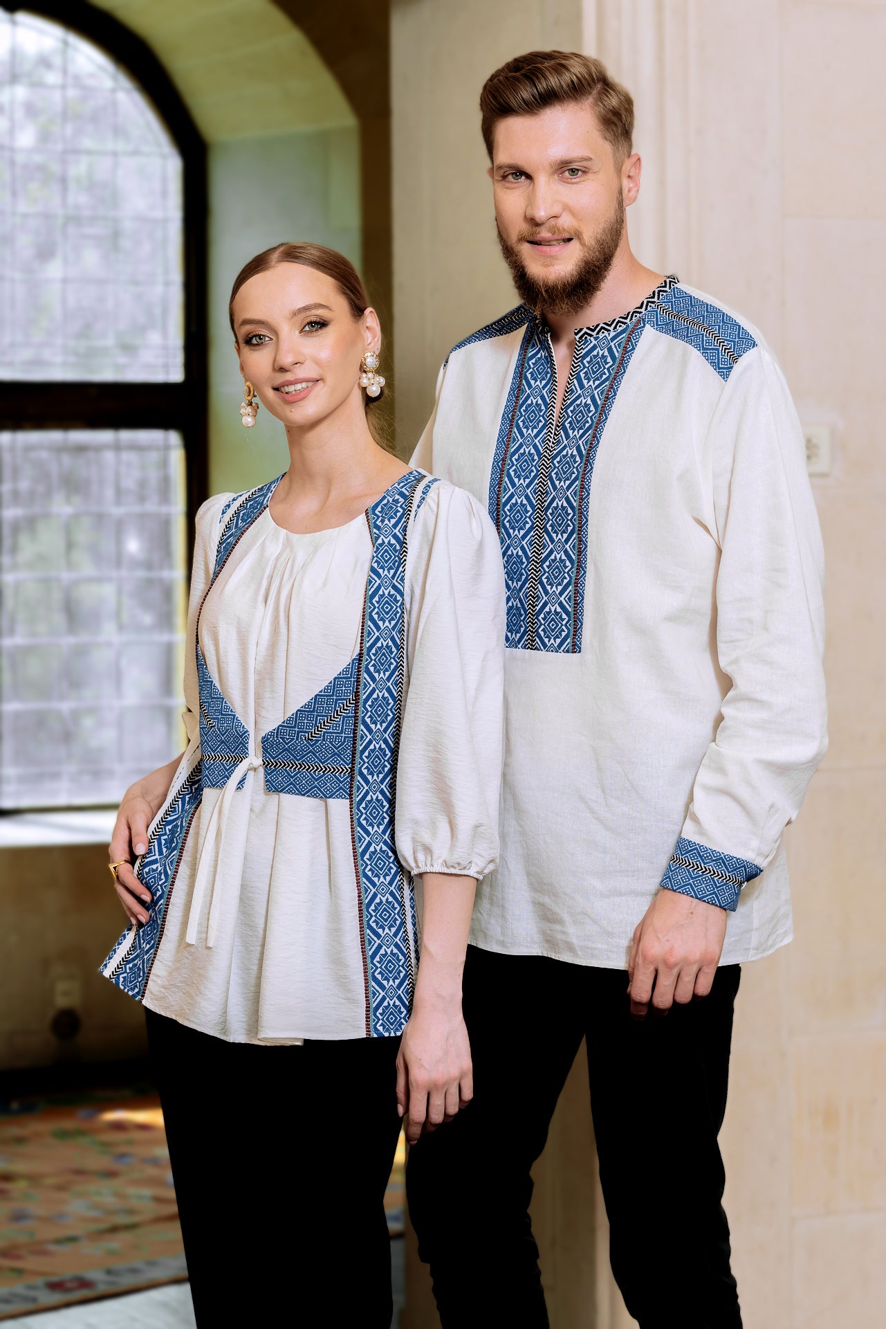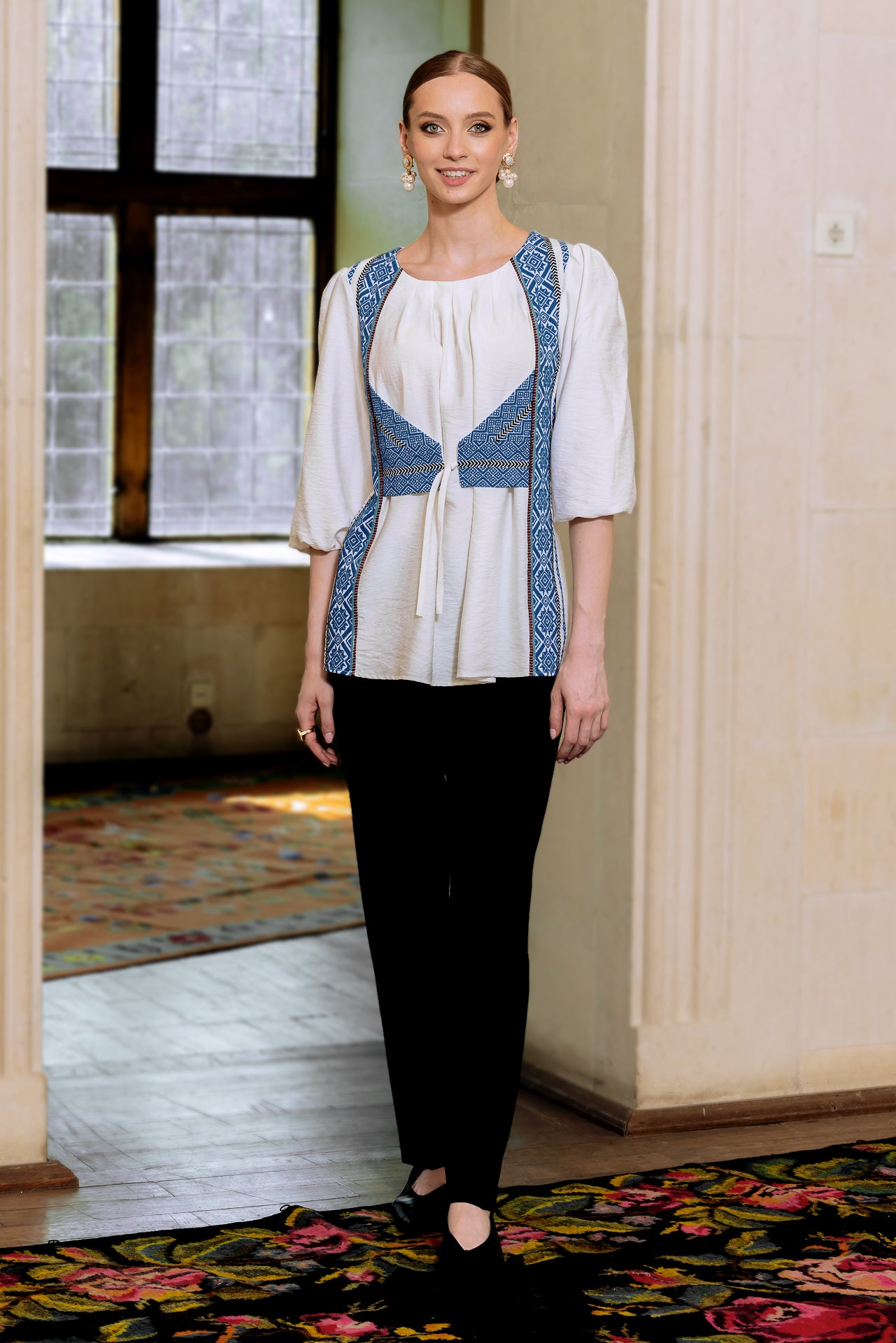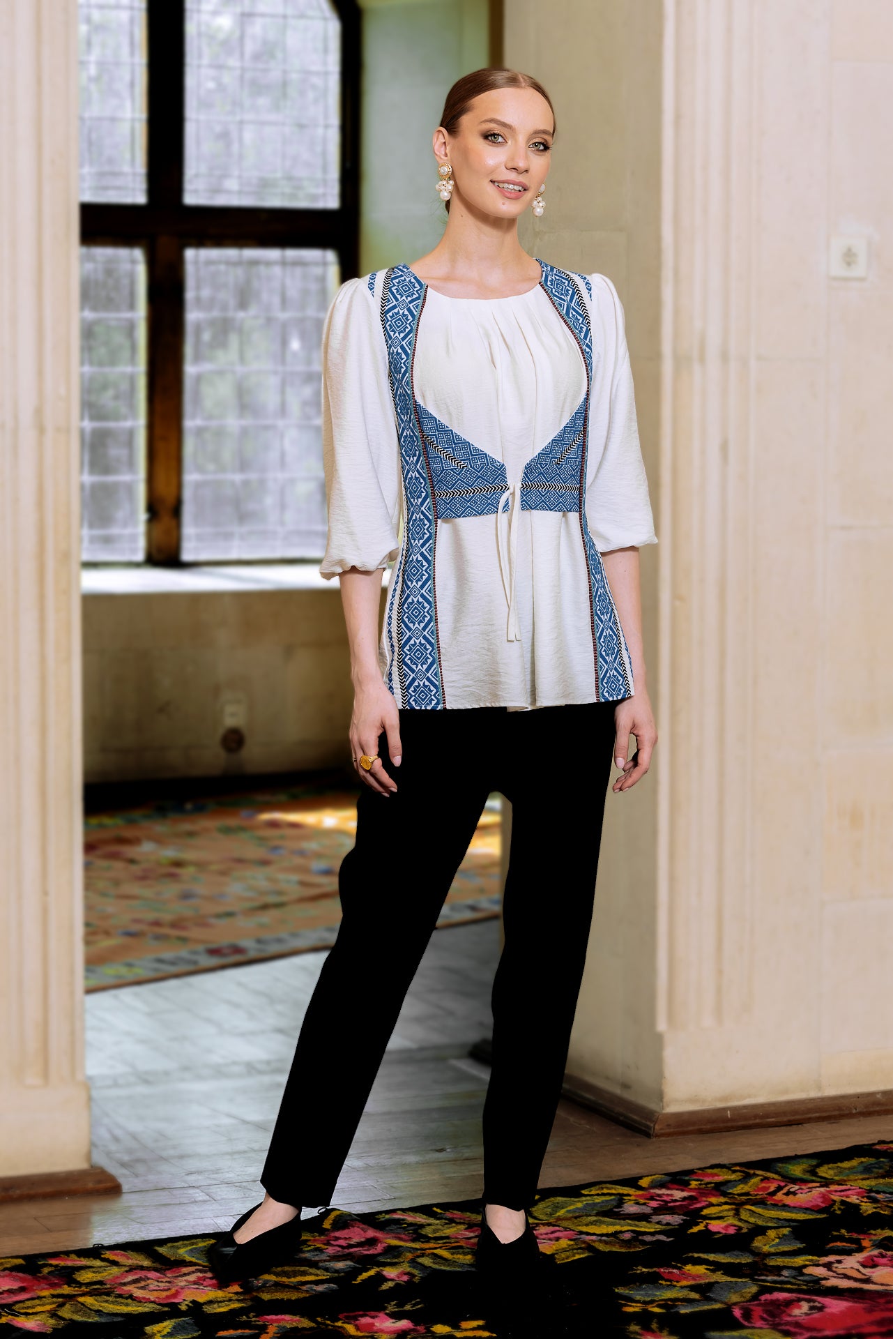 Bluza albă cu pieptar țesut albastru este confecționată din