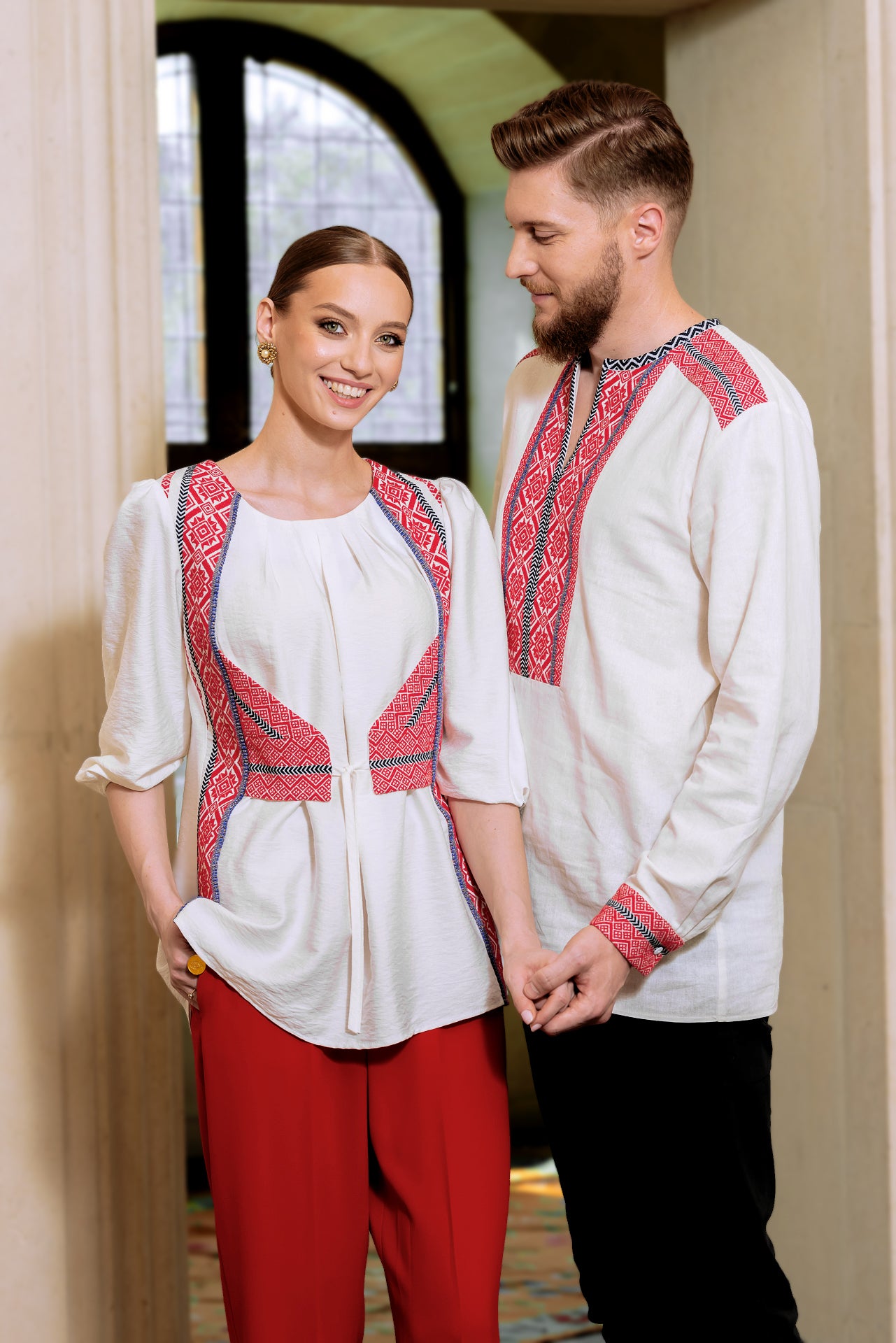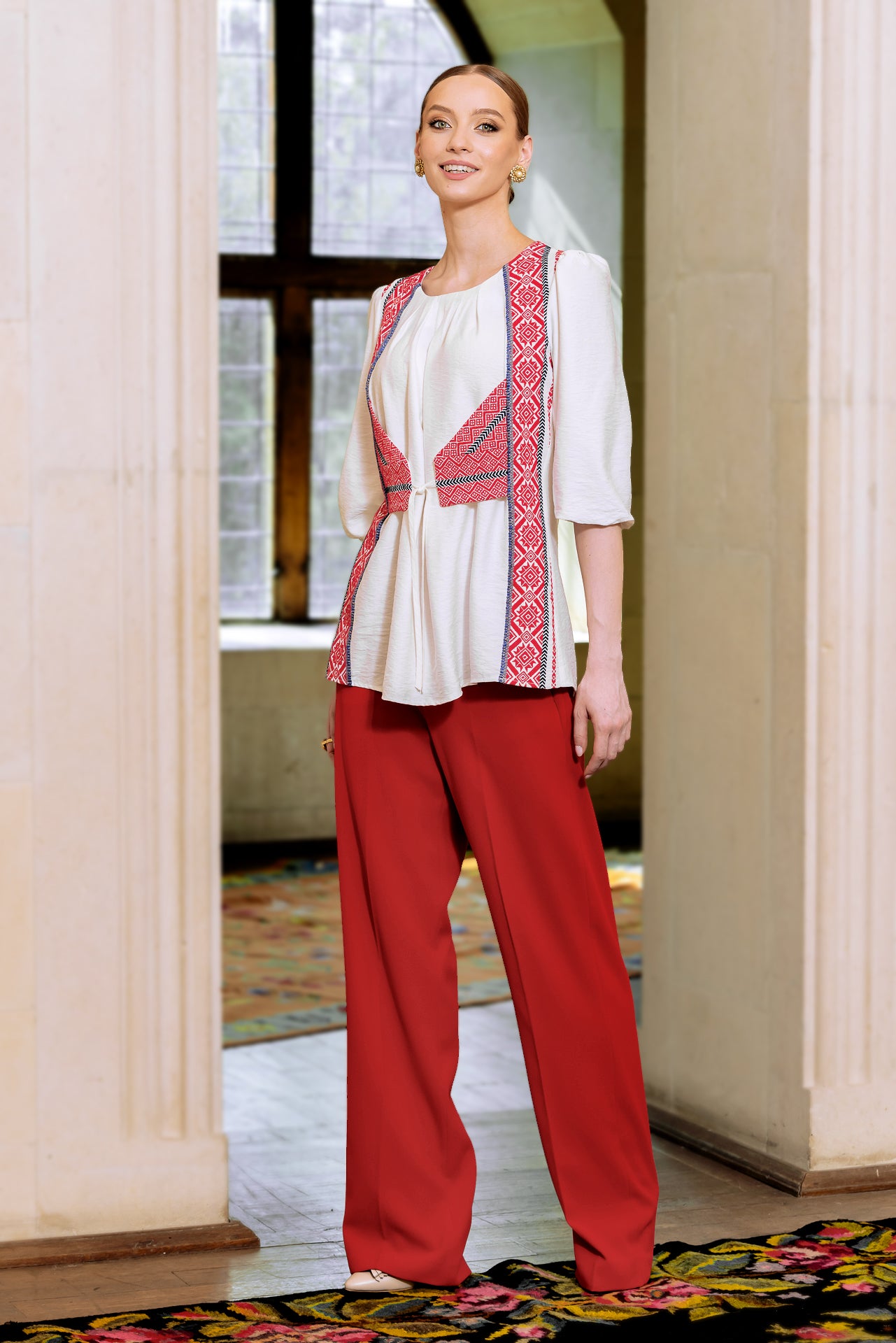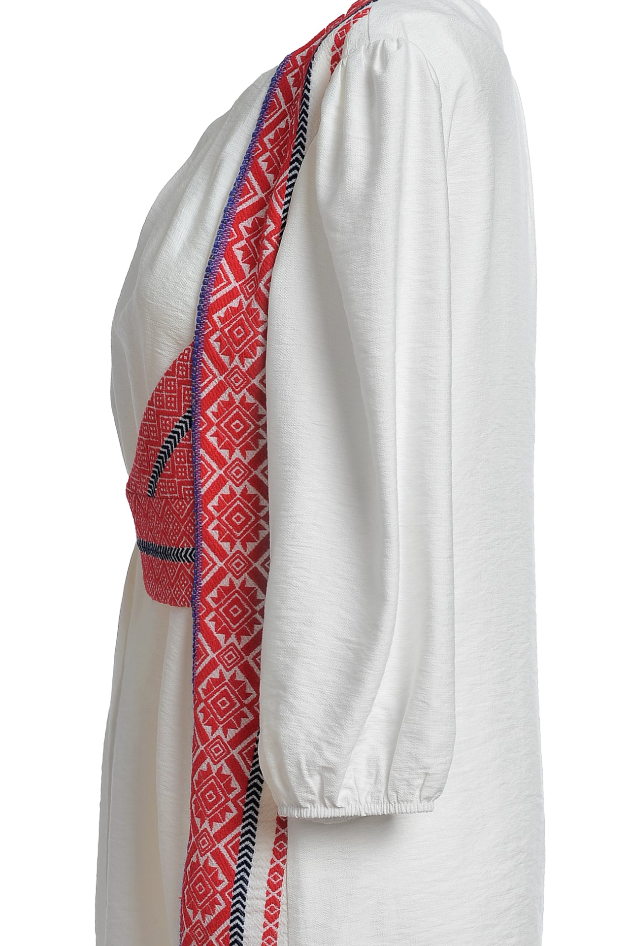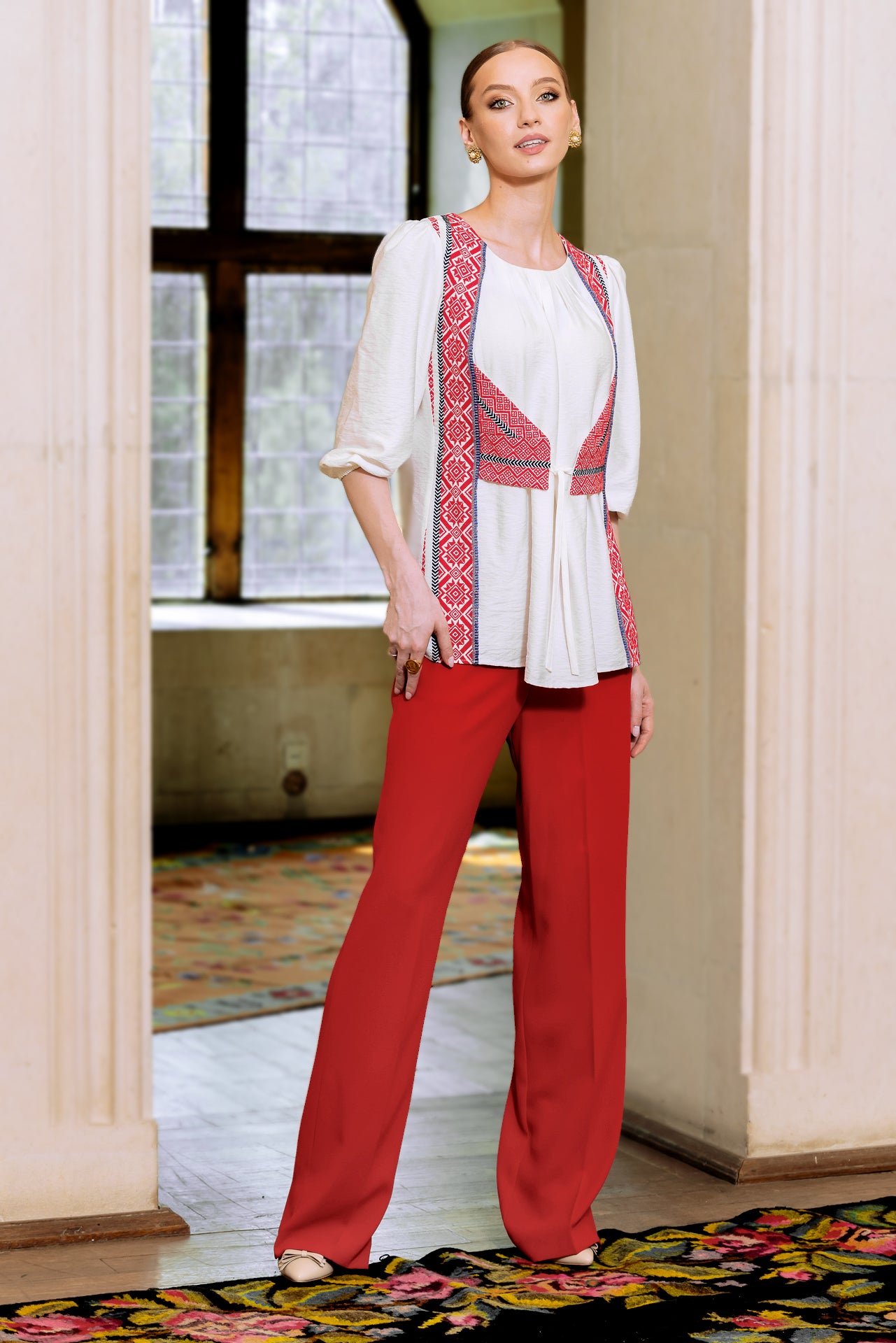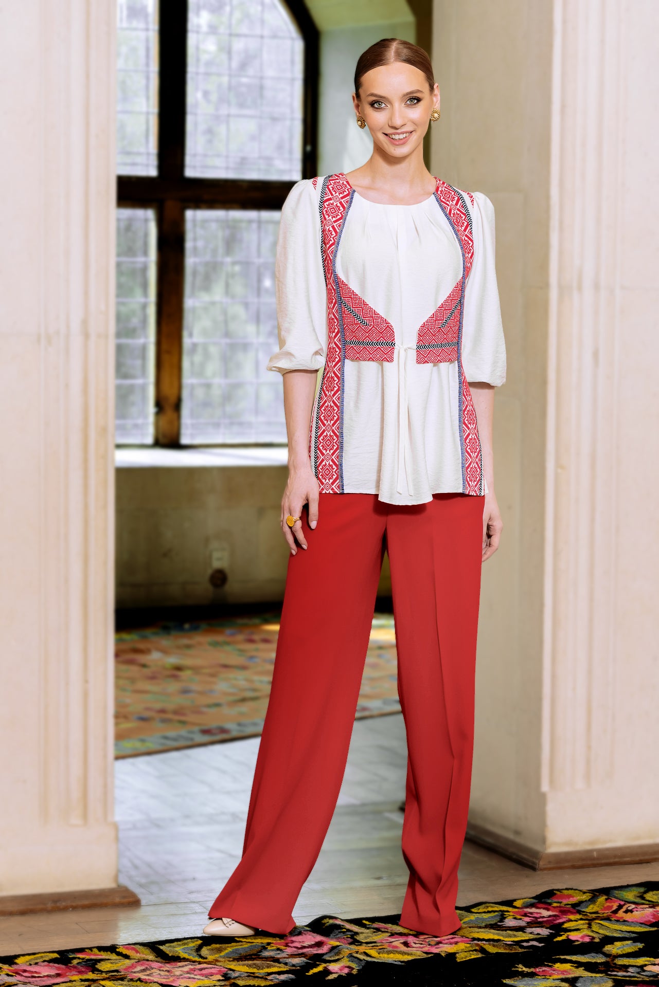Bluza albă cu pieptar țesut roșu este confecționată din