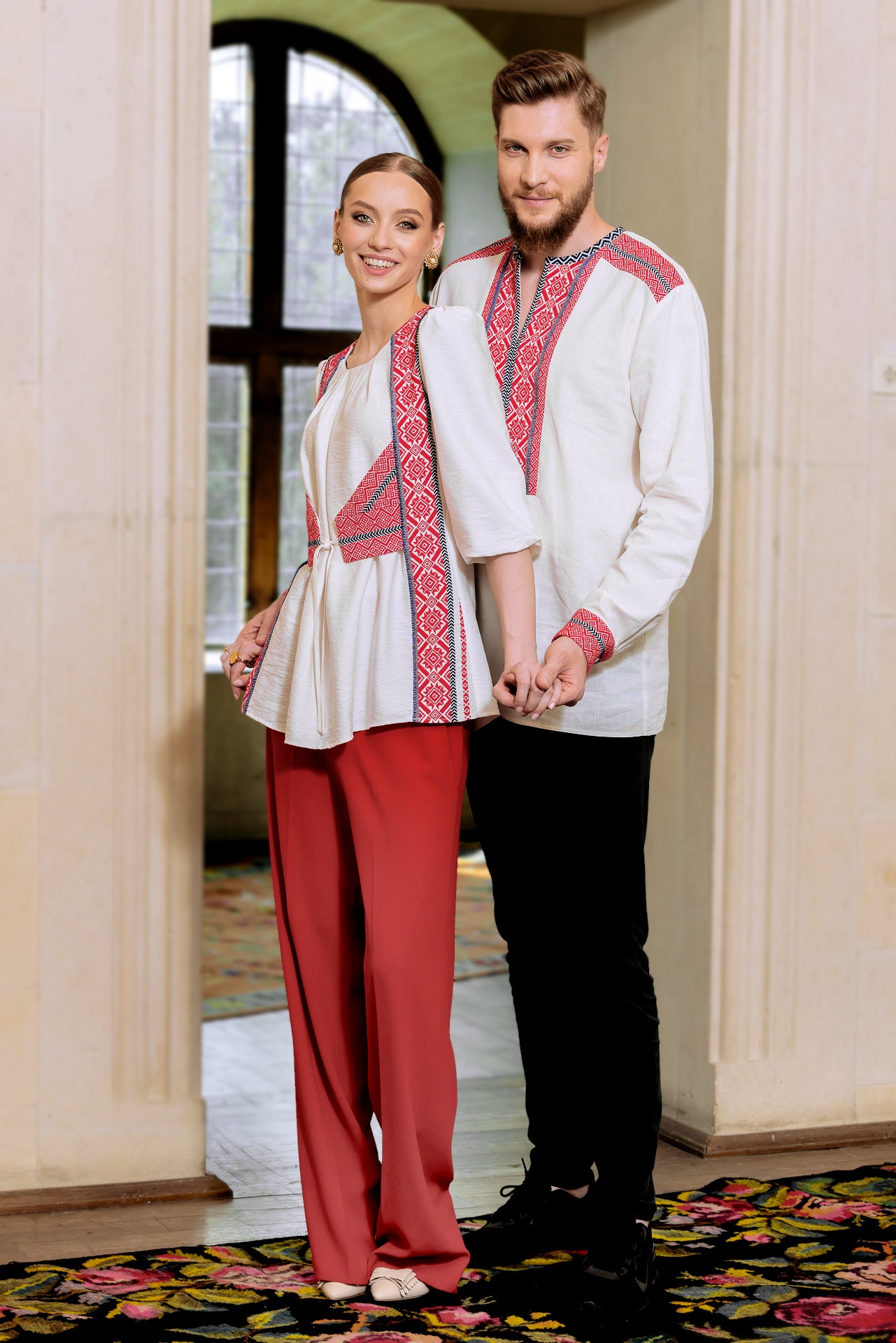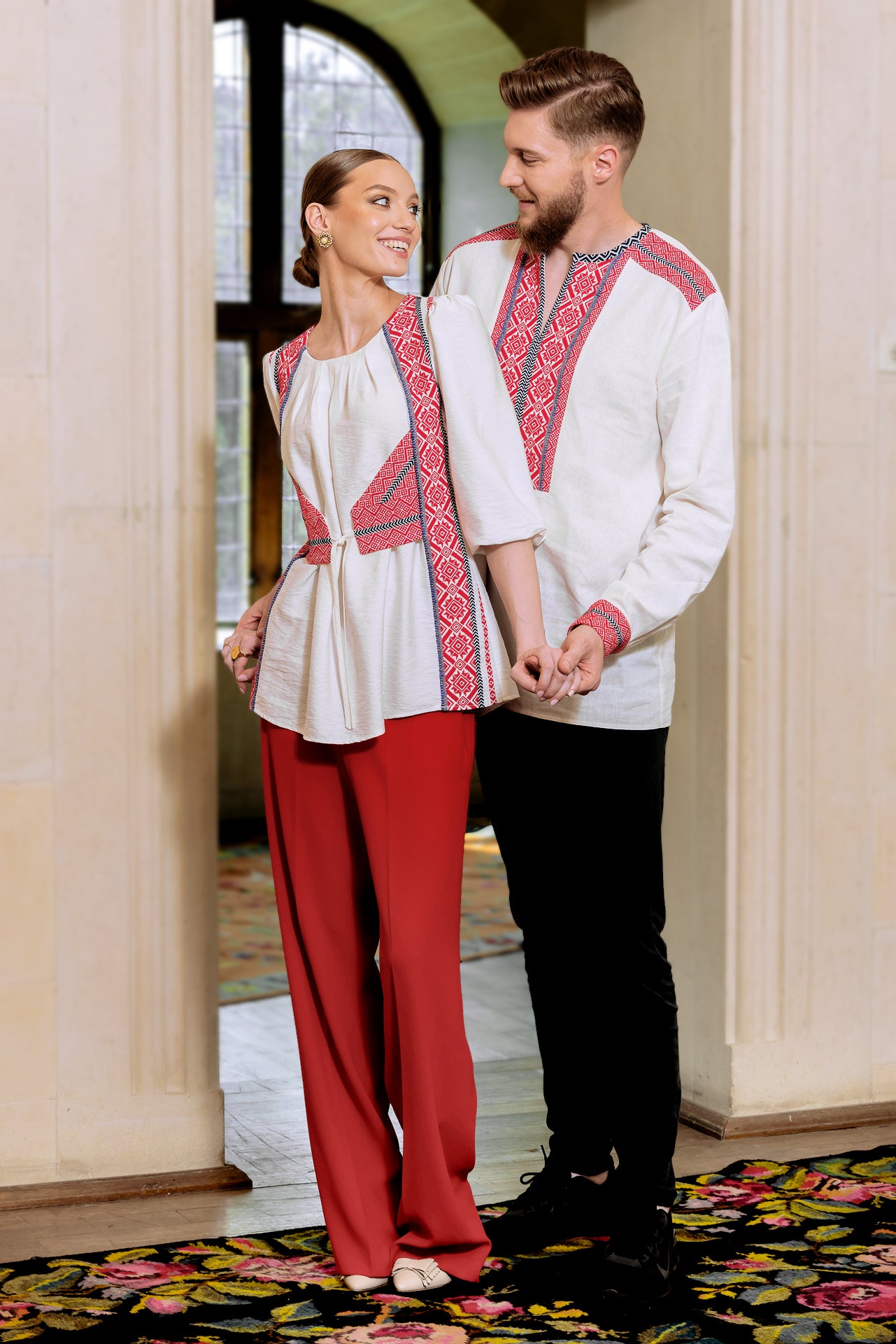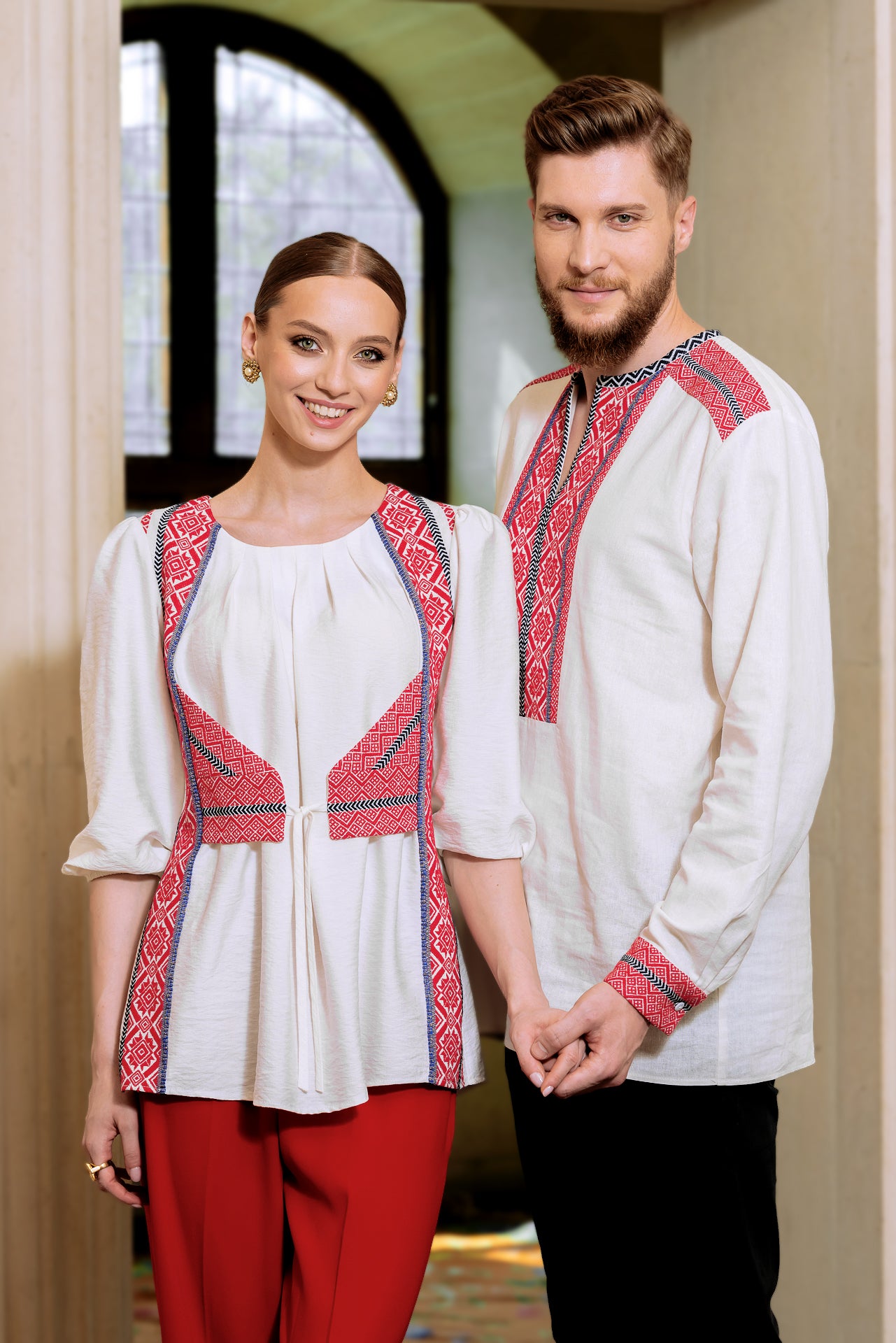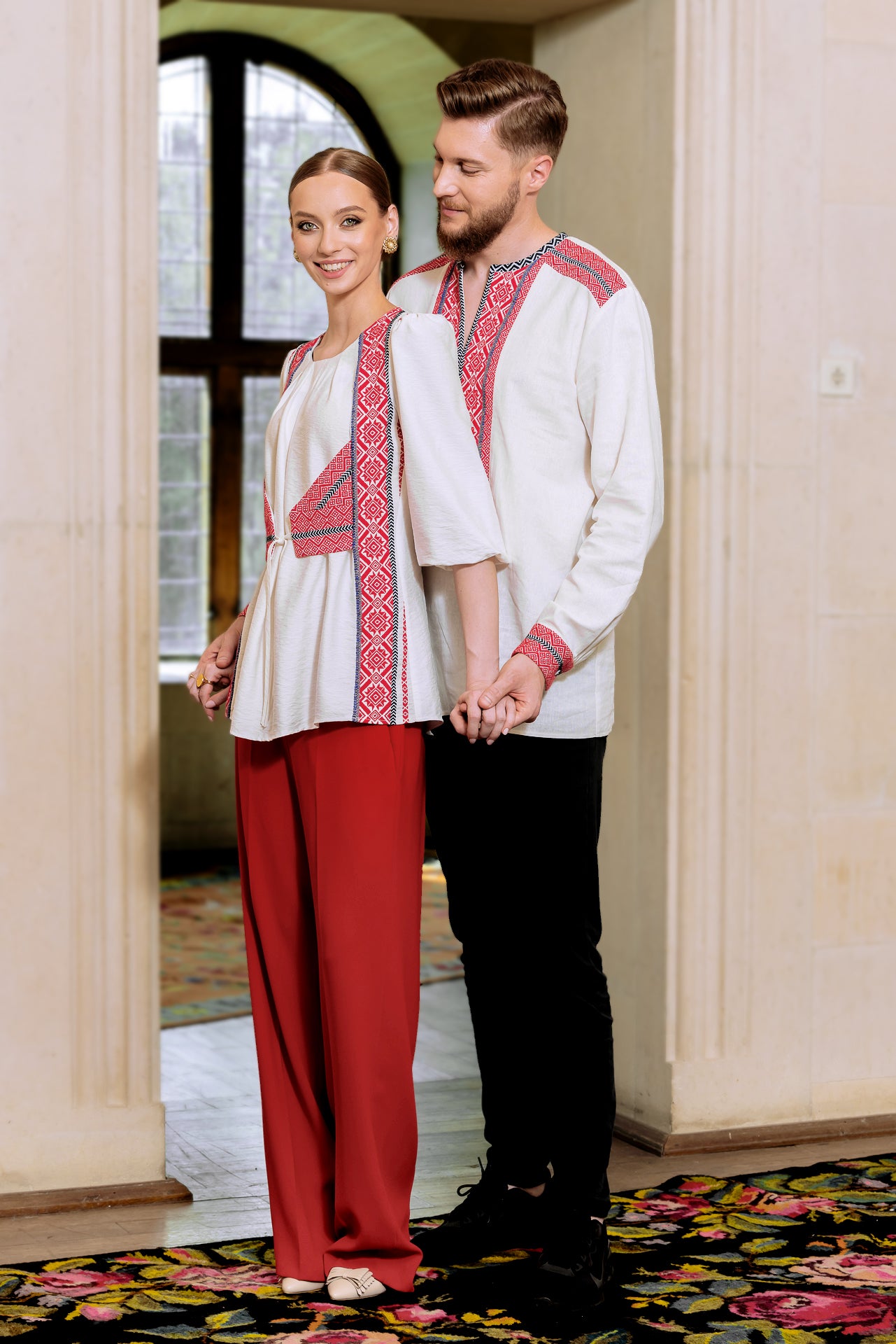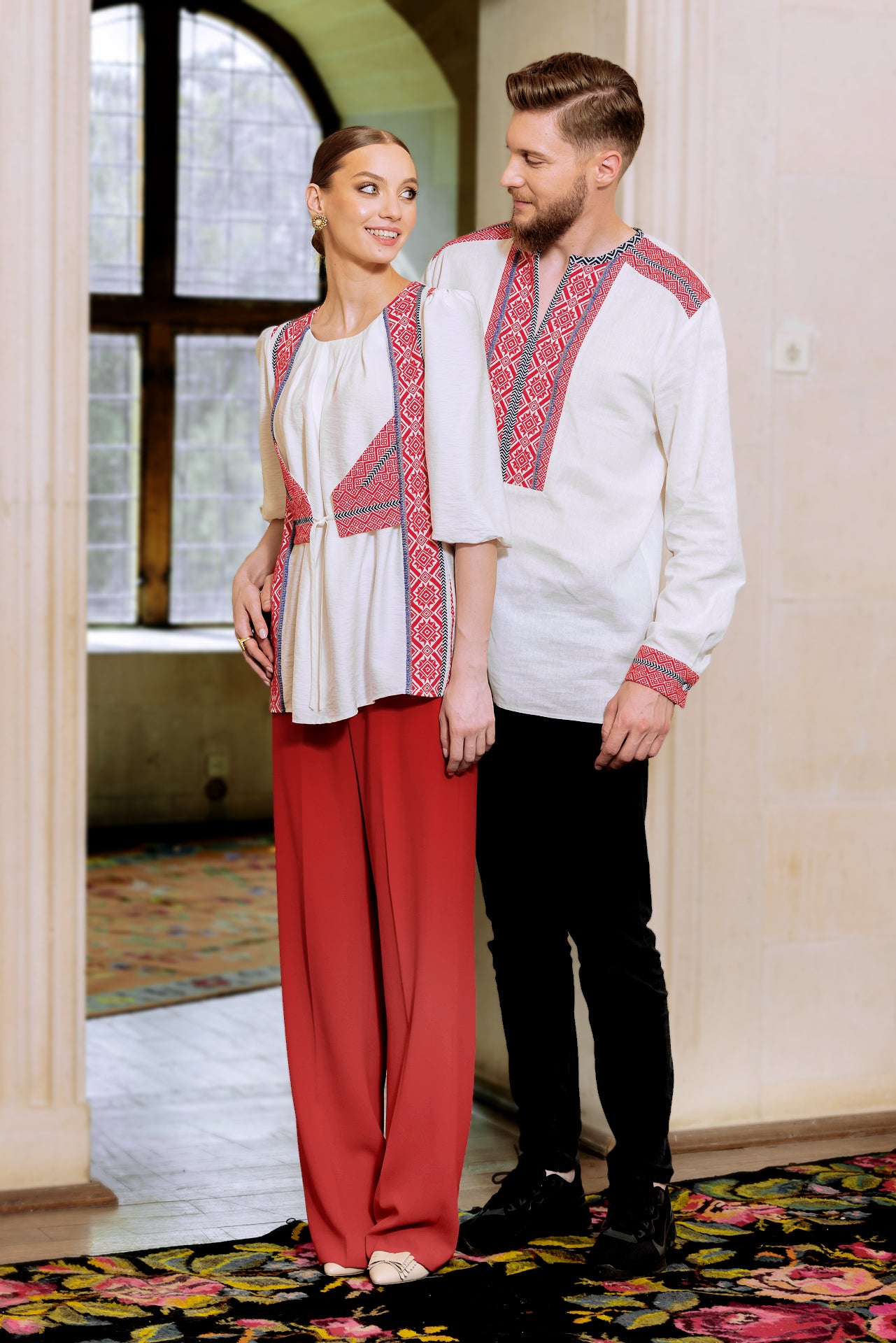 Bluza albă cu pieptar țesut roșu este confecționată din