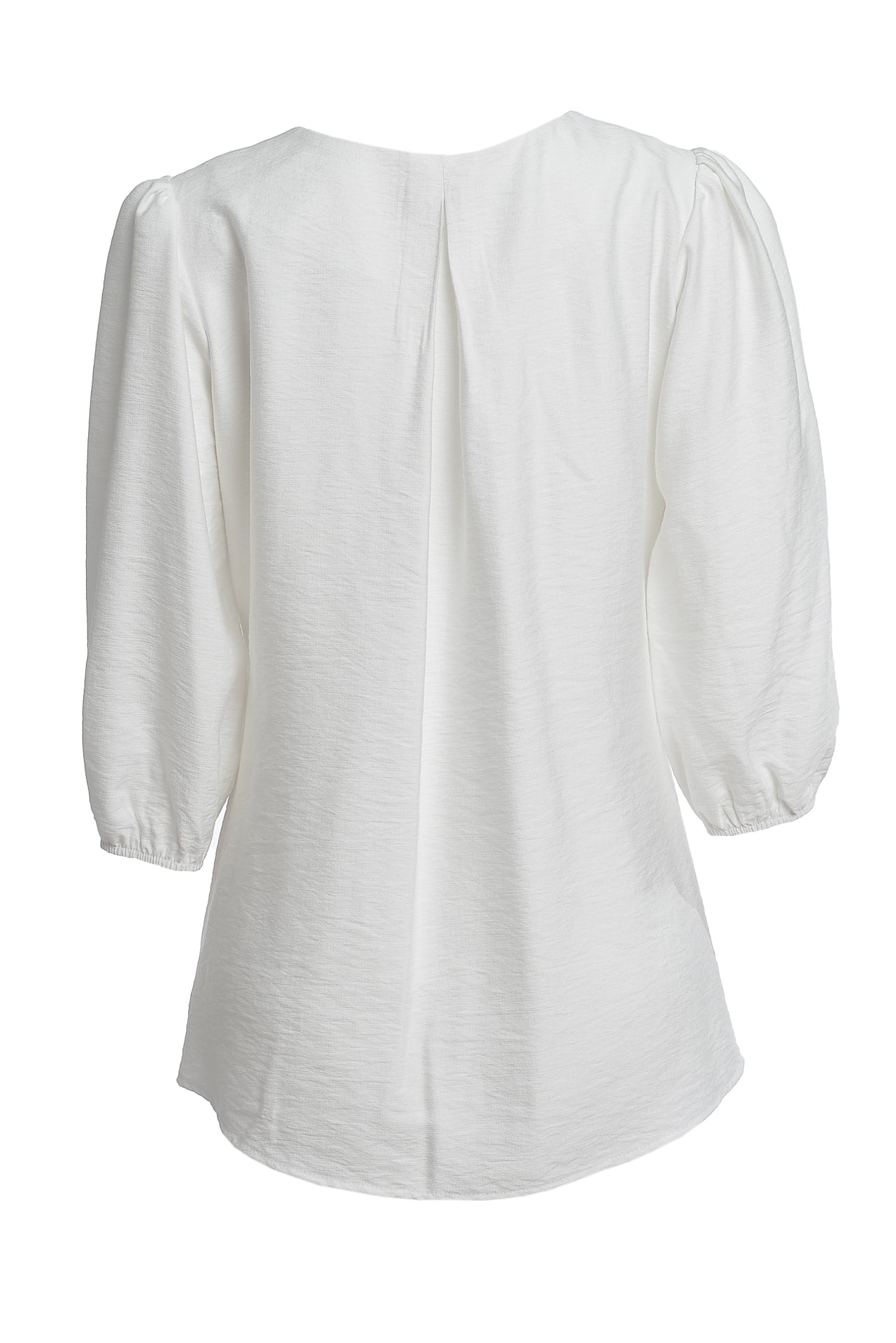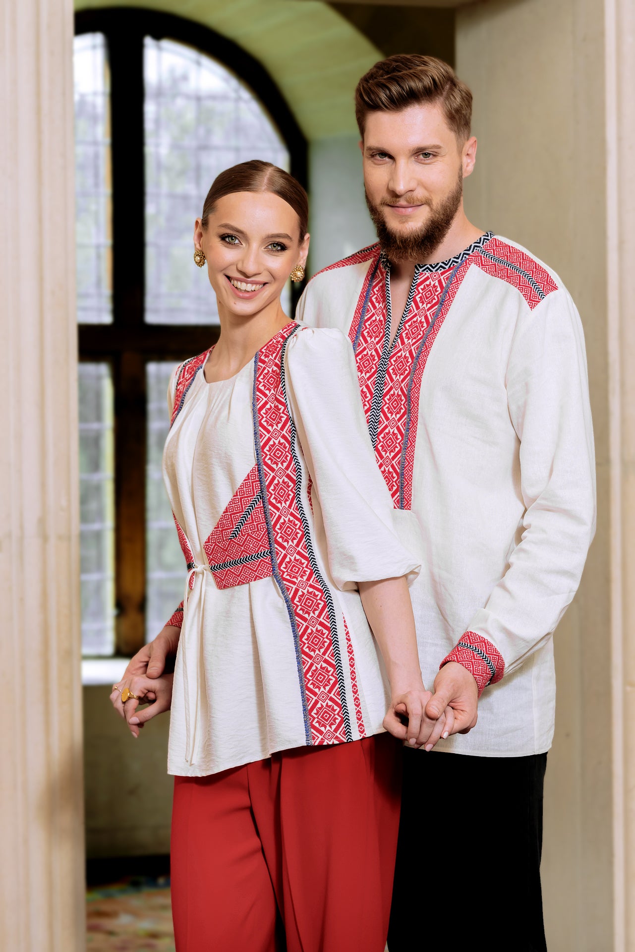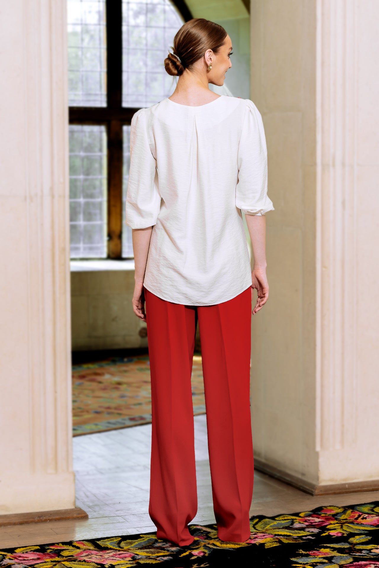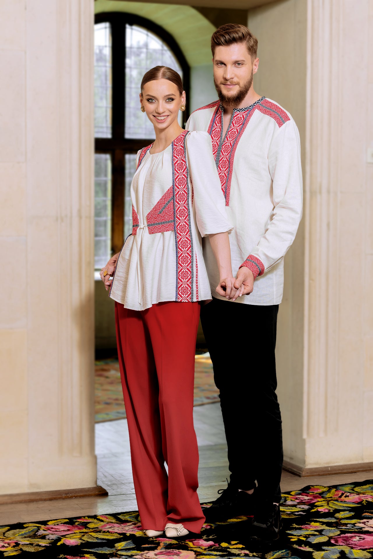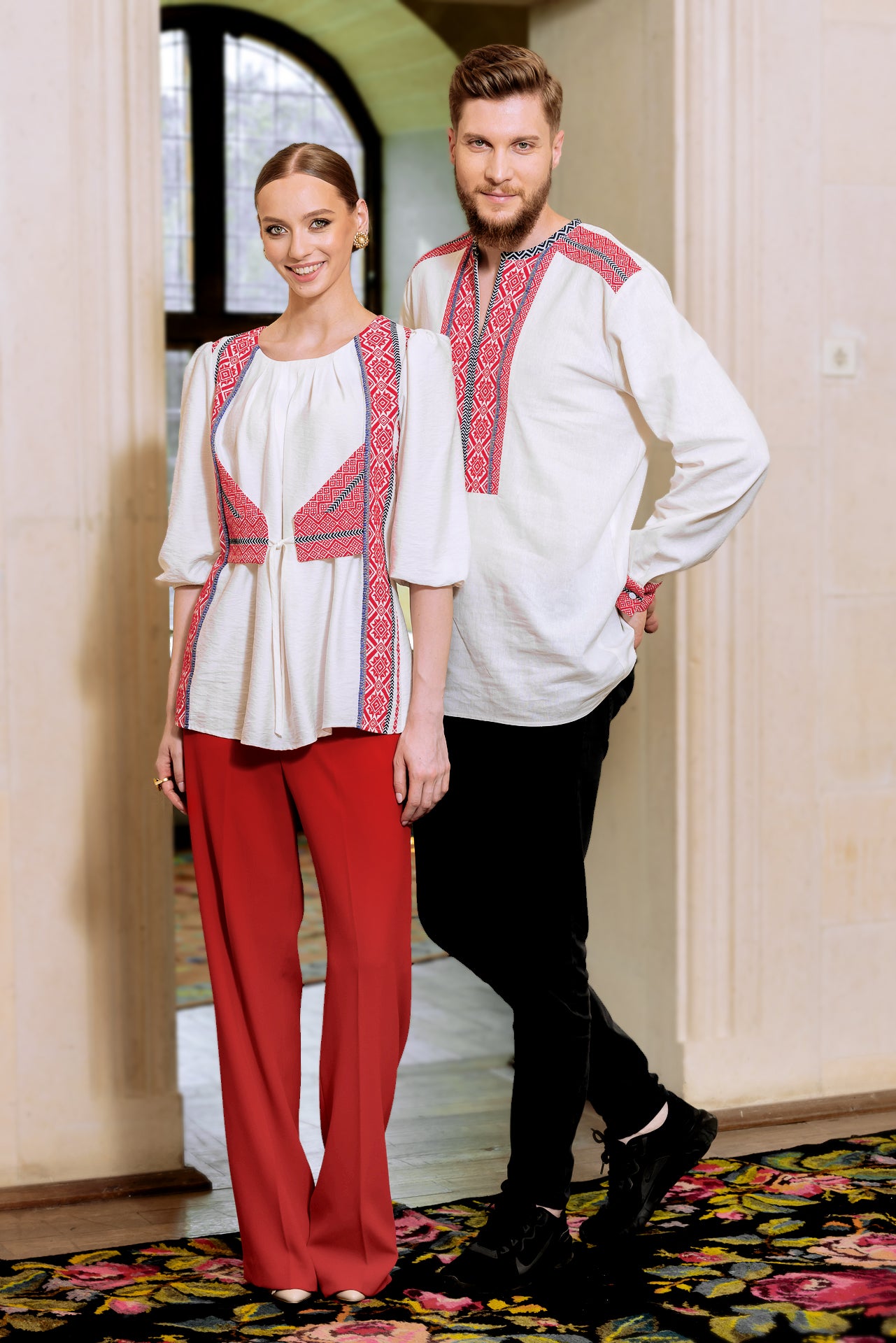 Bluza albă cu pieptar țesut roșu este confecționată din