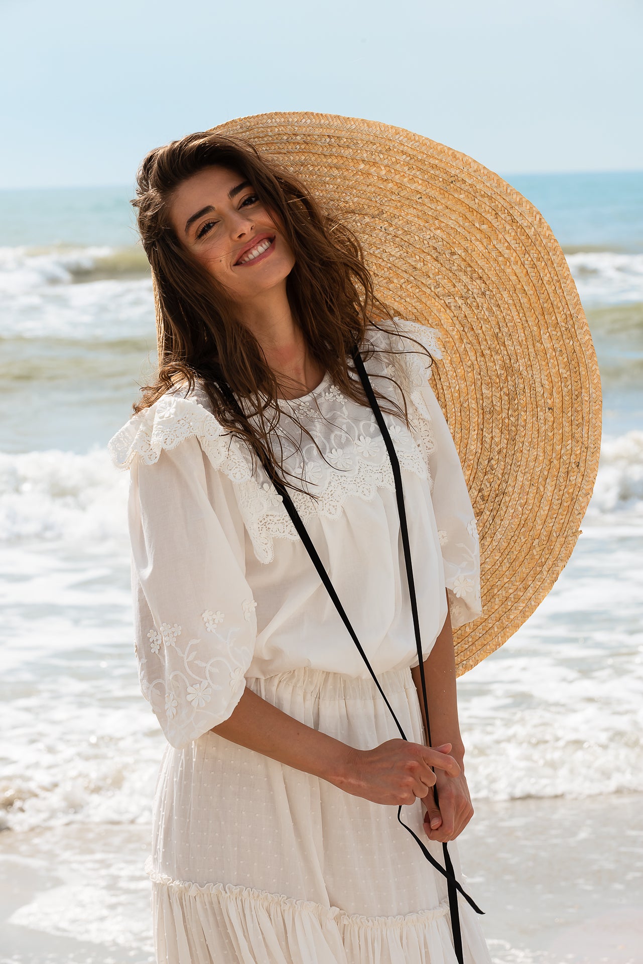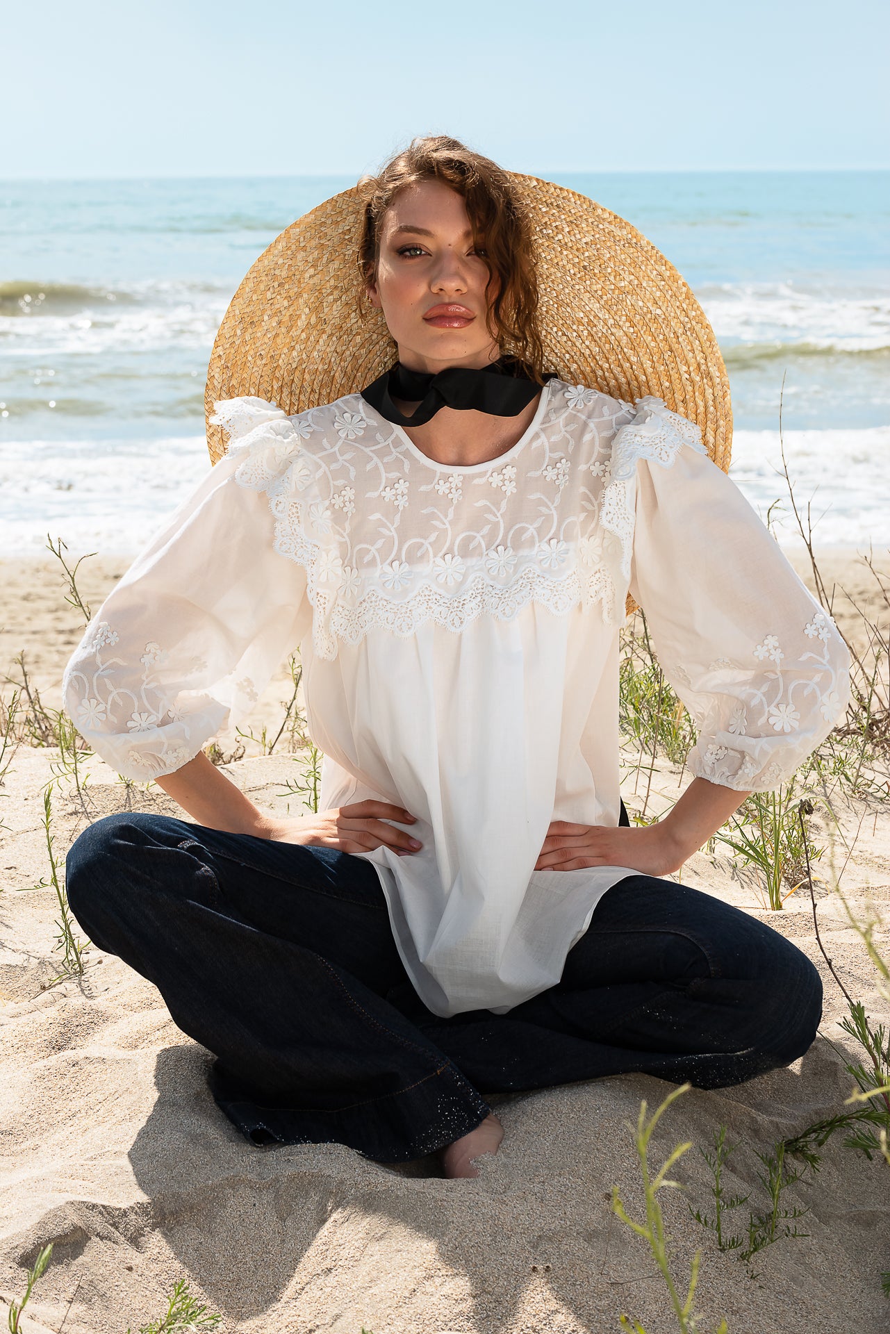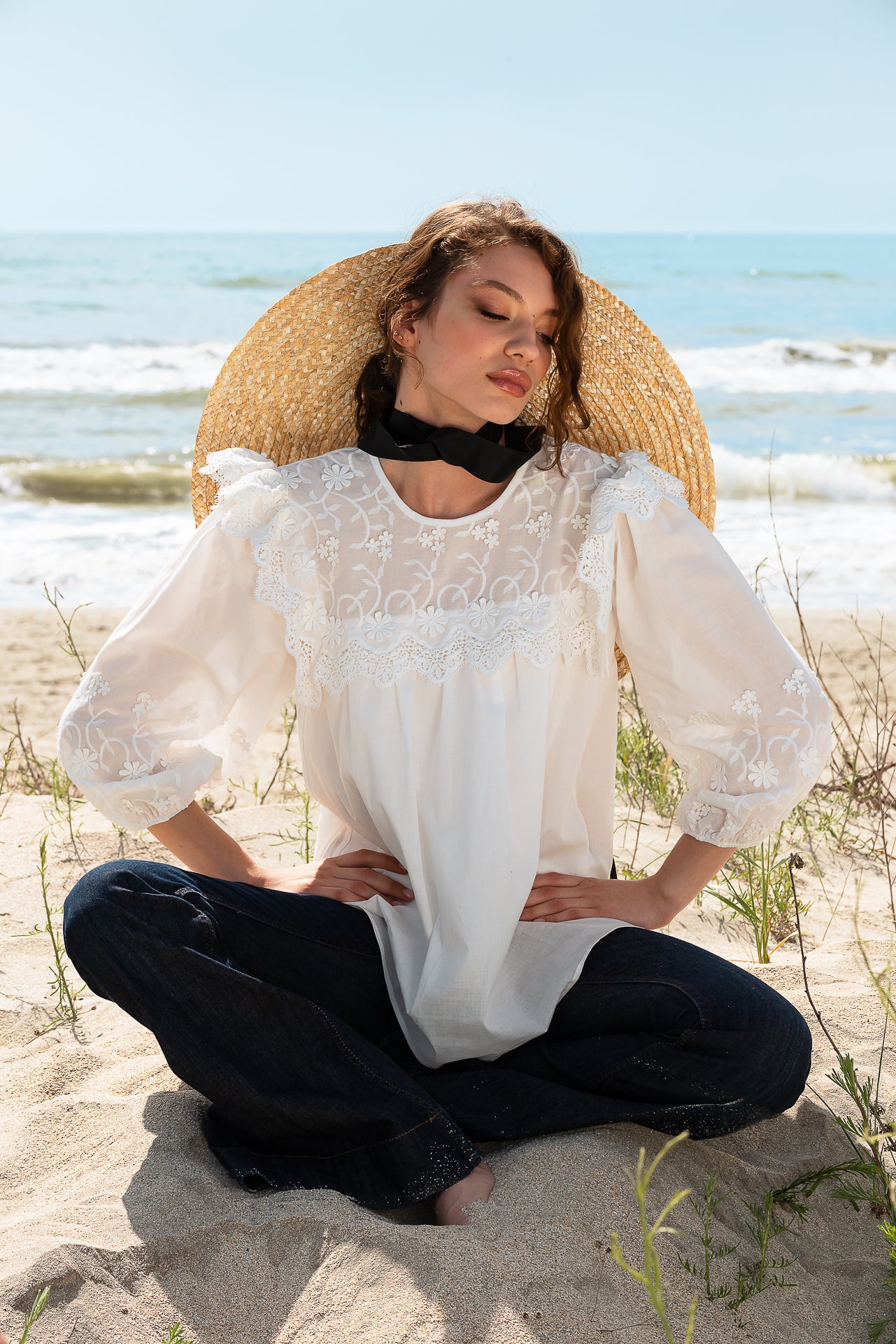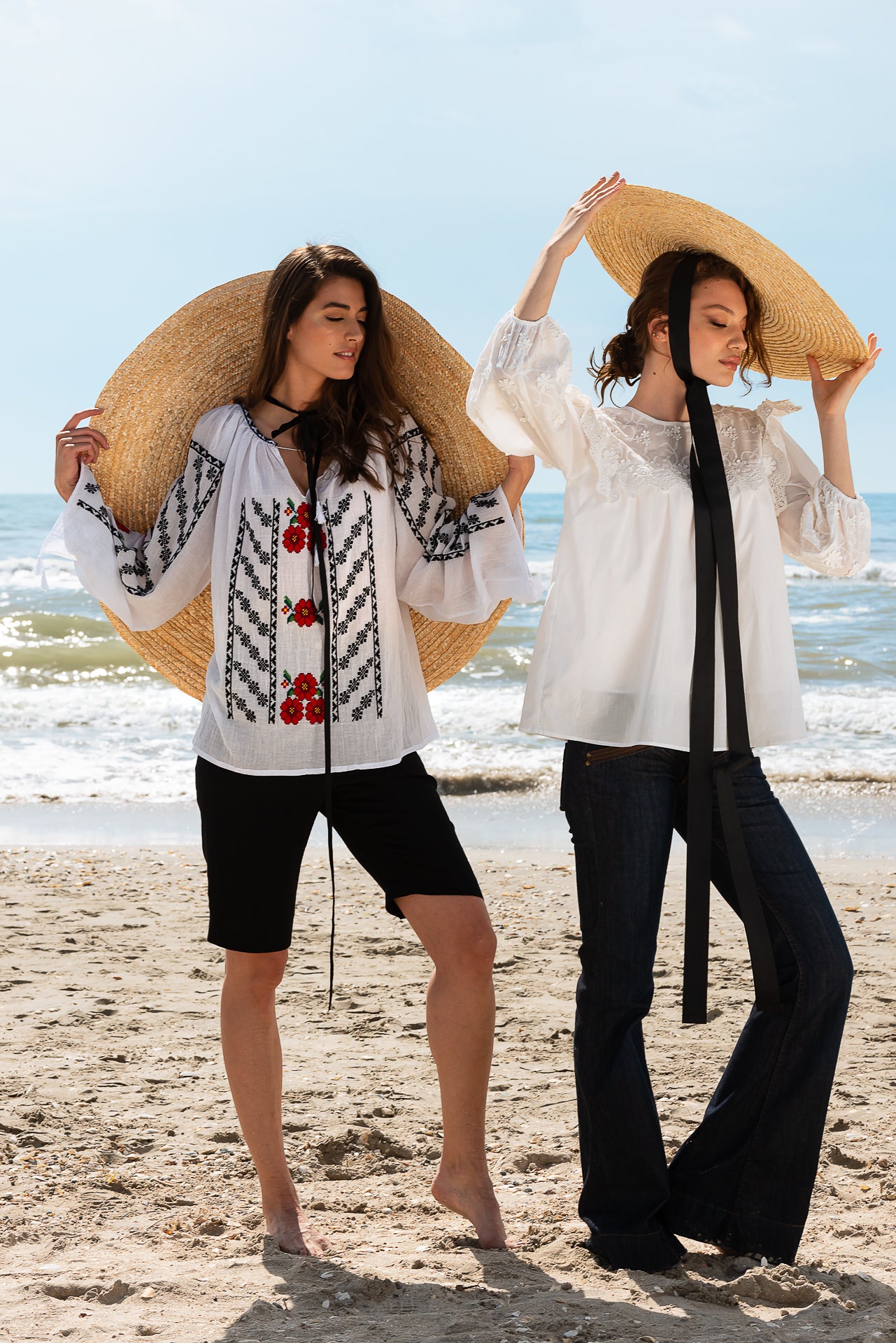 Bluza alba Maramu este confecționată din batist de bumbac și broderie florală tridimensională, încadrată armonios de volanul din dantelă. Inspirată din cămășile arhaice maramureșene, bluza este un etalon al eleganței. Are un croi lejer, versatil, cu mânecă trei sferturi.