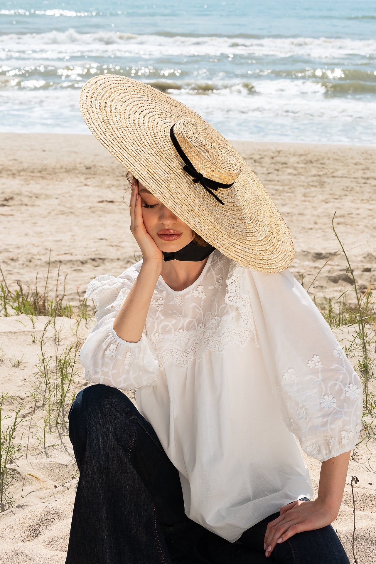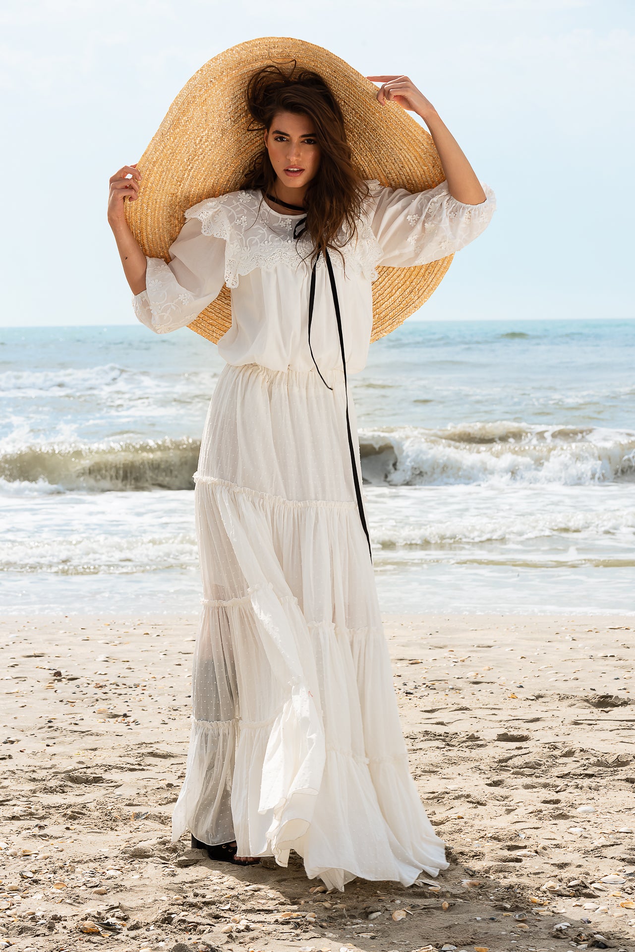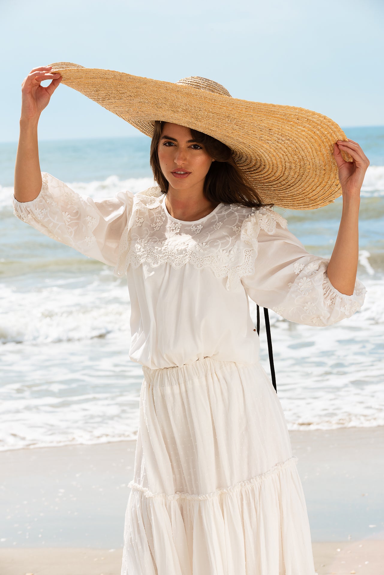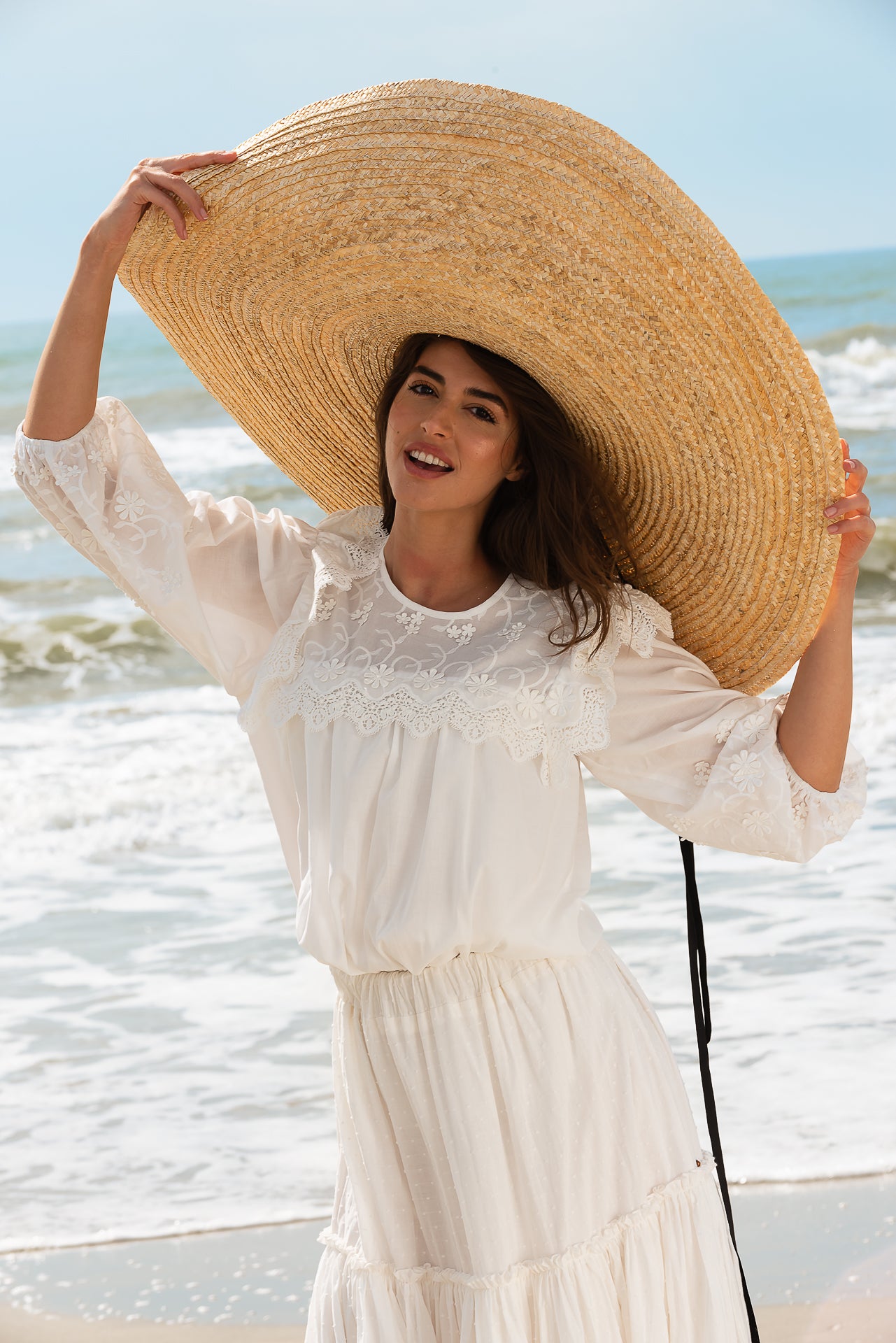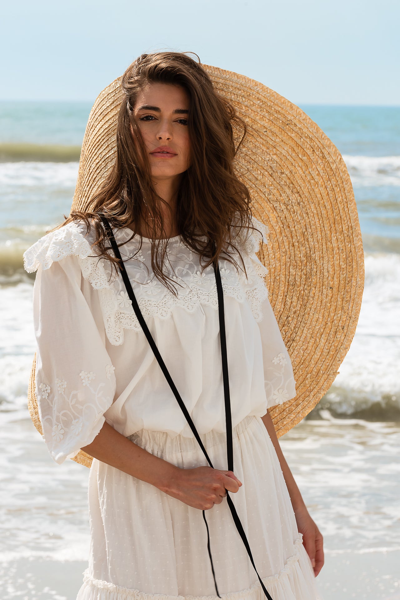 Bluza alba Maramu este confecționată din batist de bumbac și broderie florală tridimensională, încadrată armonios de volanul din dantelă. Inspirată din cămășile arhaice maramureșene, bluza este un etalon al eleganței. Are un croi lejer, versatil, cu mânecă trei sferturi.