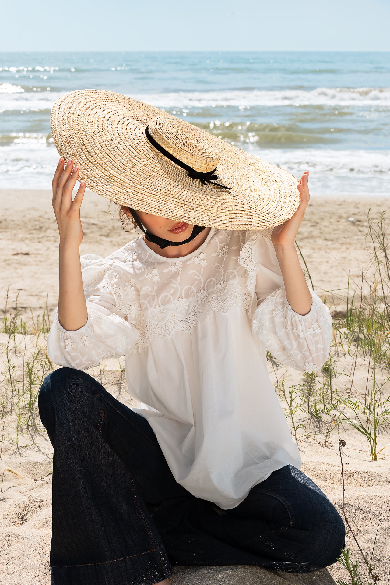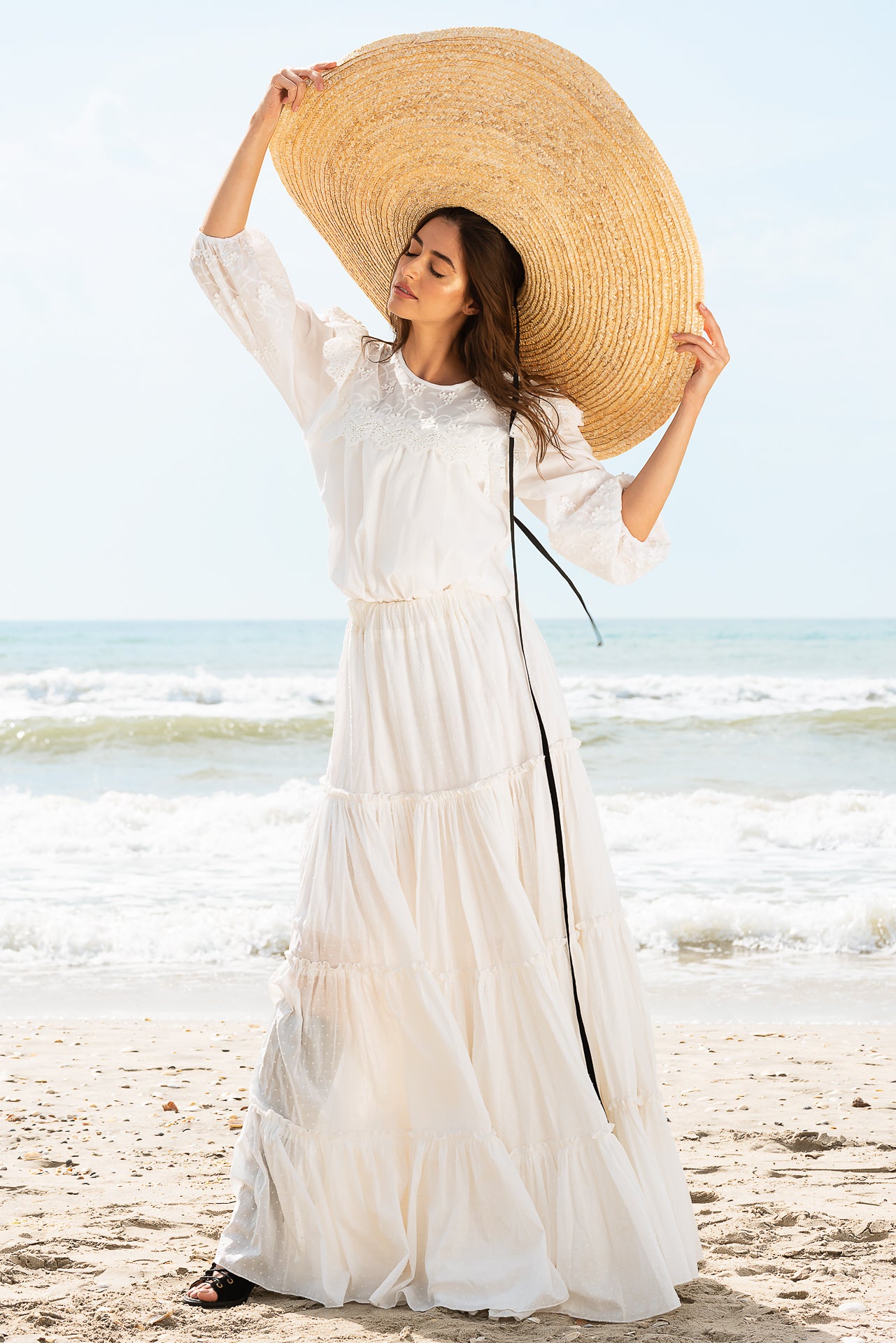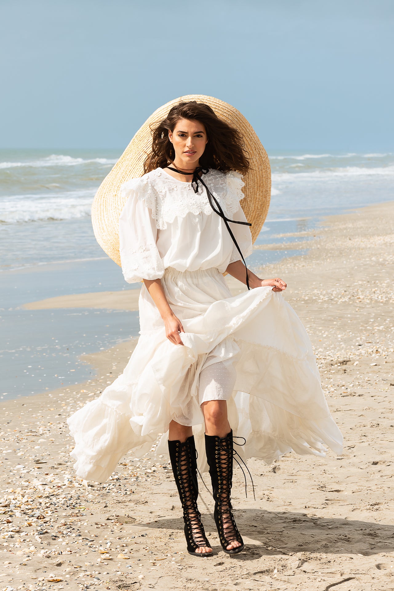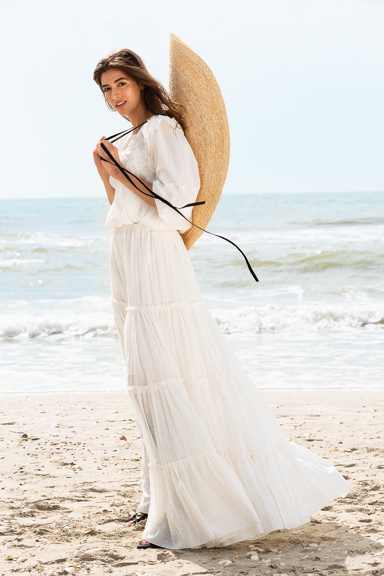 Bluza alba Maramu este confecționată din batist de bumbac și broderie florală tridimensională, încadrată armonios de volanul din dantelă. Inspirată din cămășile arhaice maramureșene, bluza este un etalon al eleganței. Are un croi lejer, versatil, cu mânecă trei sferturi.