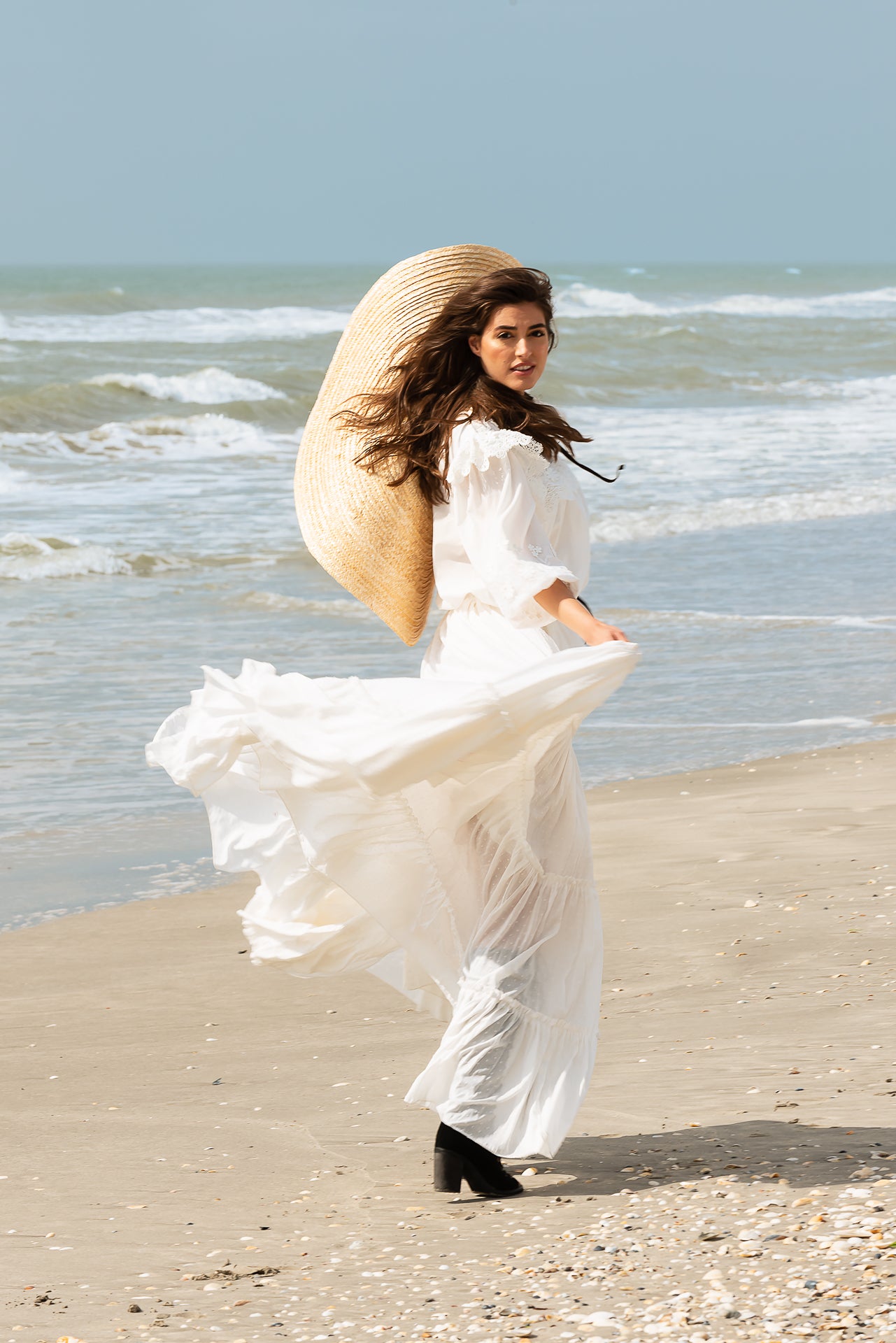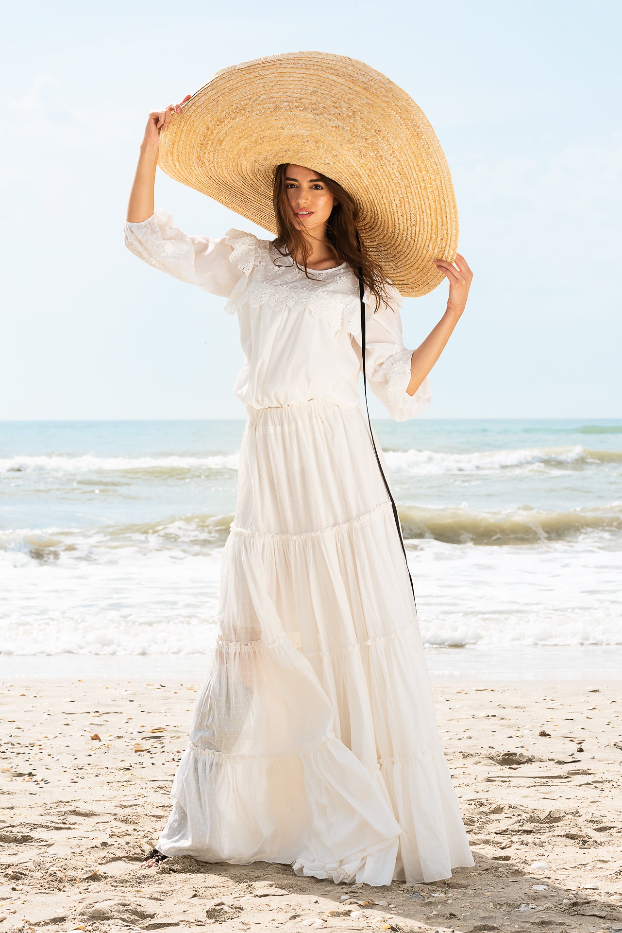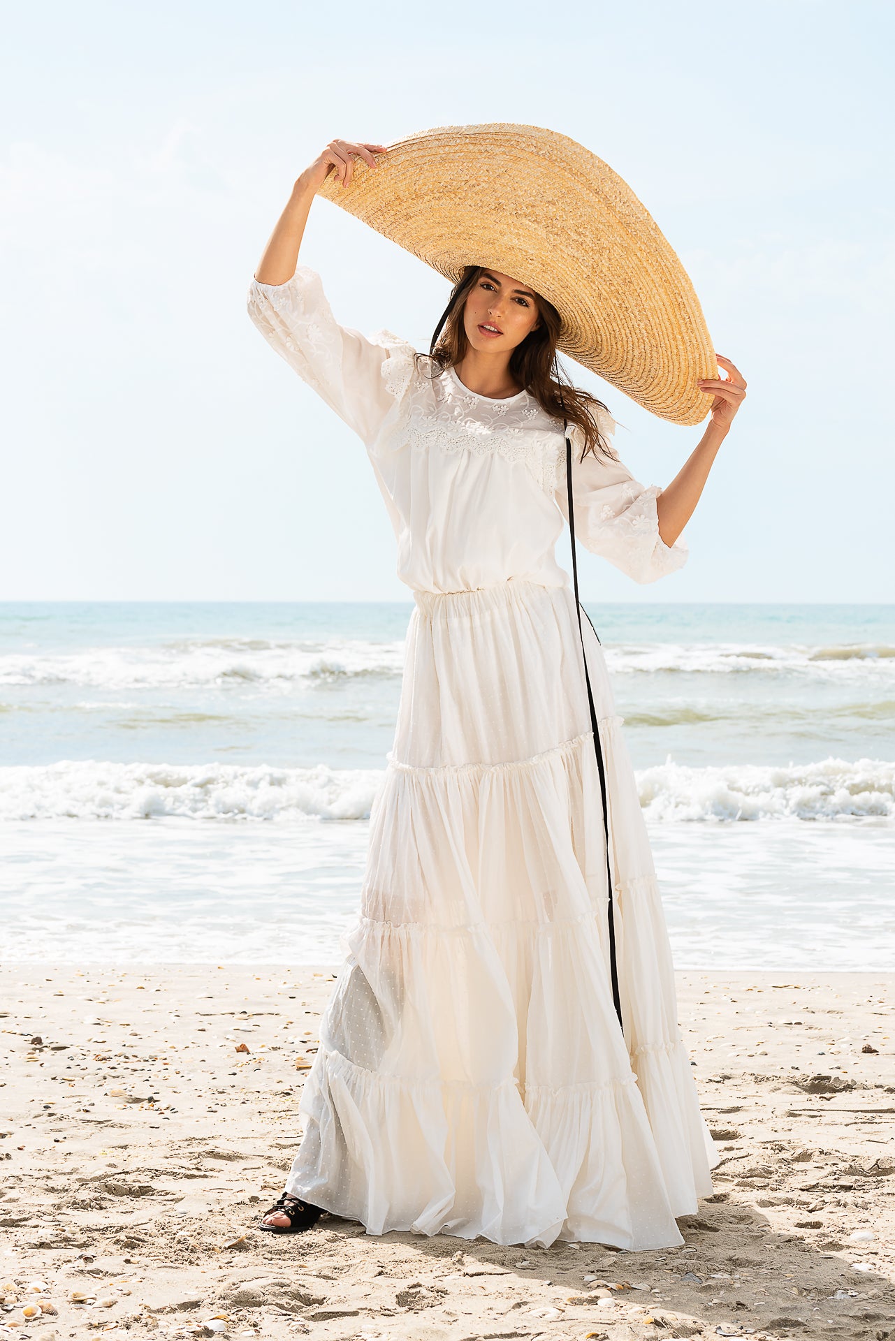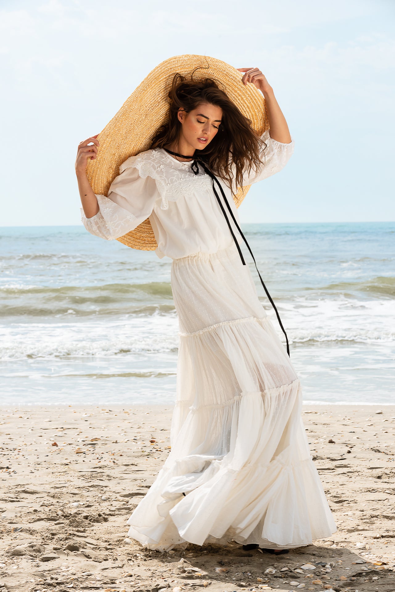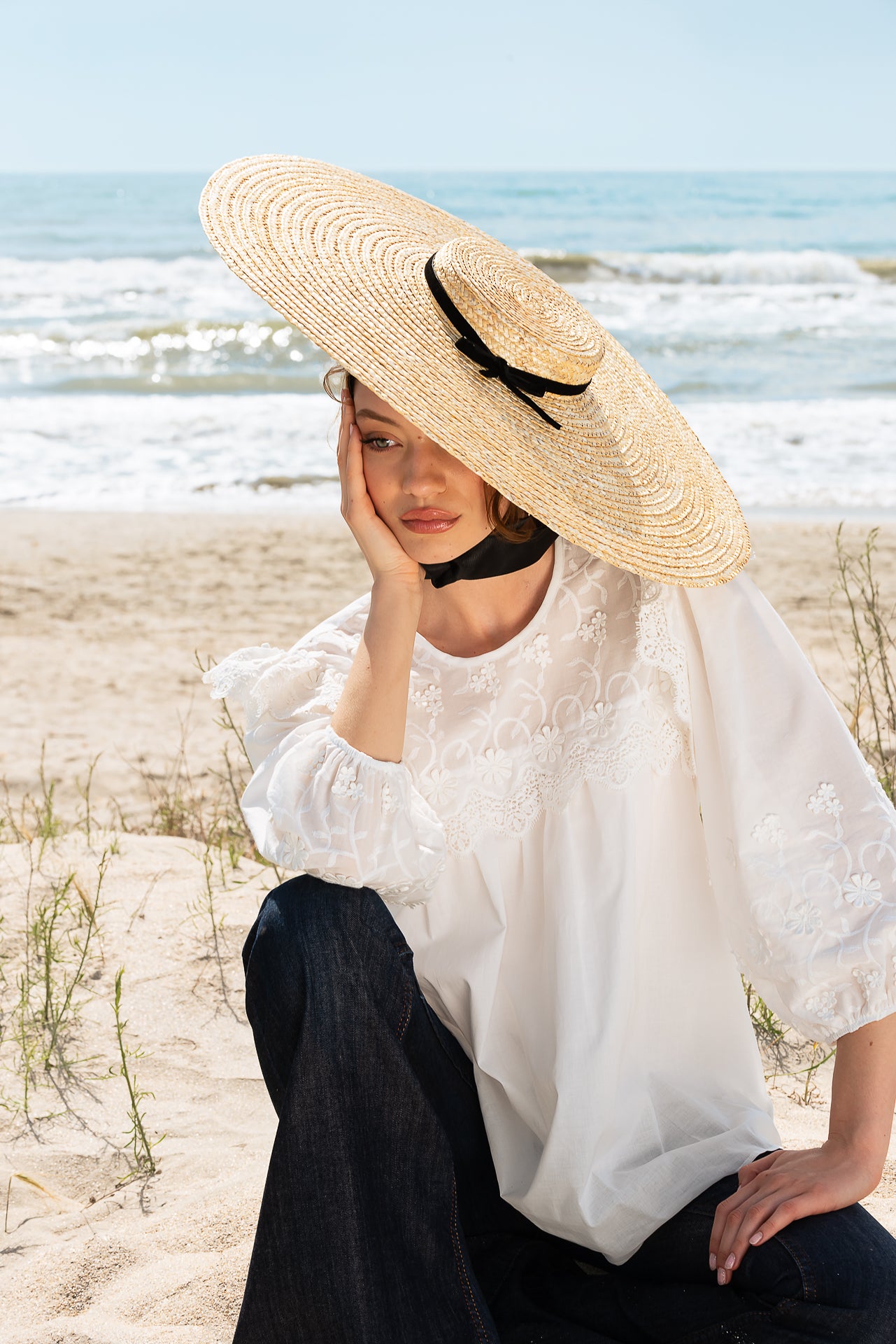 Bluza alba Maramu este confecționată din batist de bumbac și broderie florală tridimensională, încadrată armonios de volanul din dantelă. Inspirată din cămășile arhaice maramureșene, bluza este un etalon al eleganței. Are un croi lejer, versatil, cu mânecă trei sferturi.