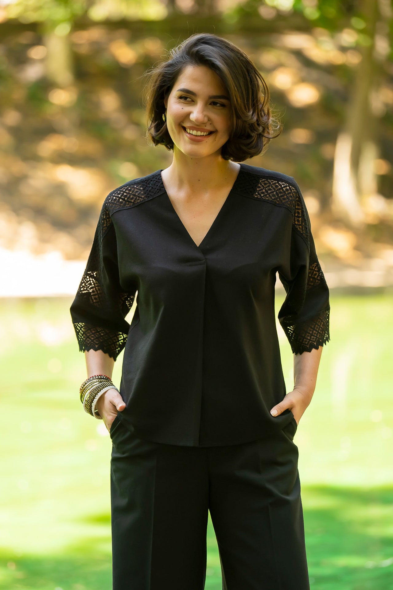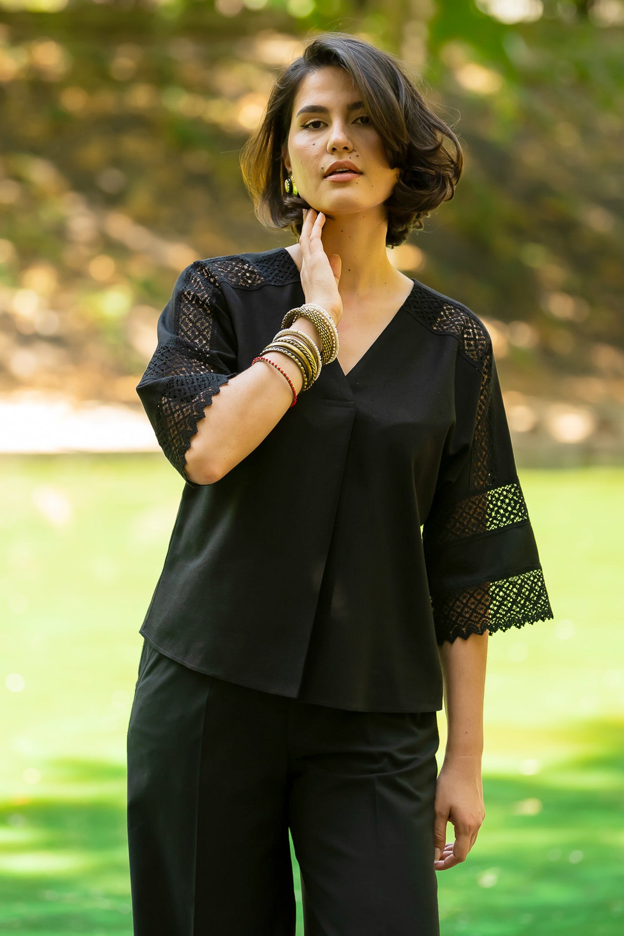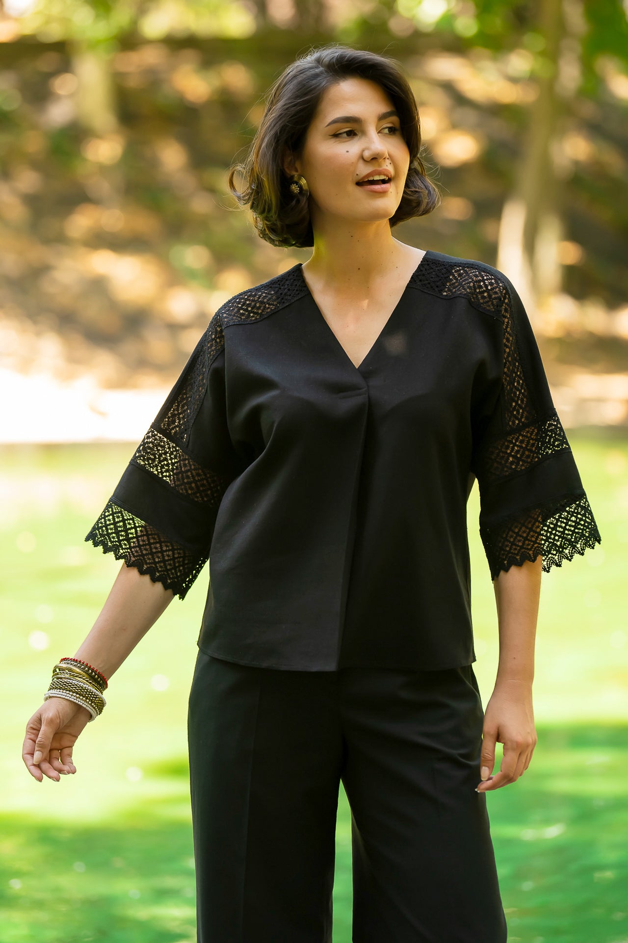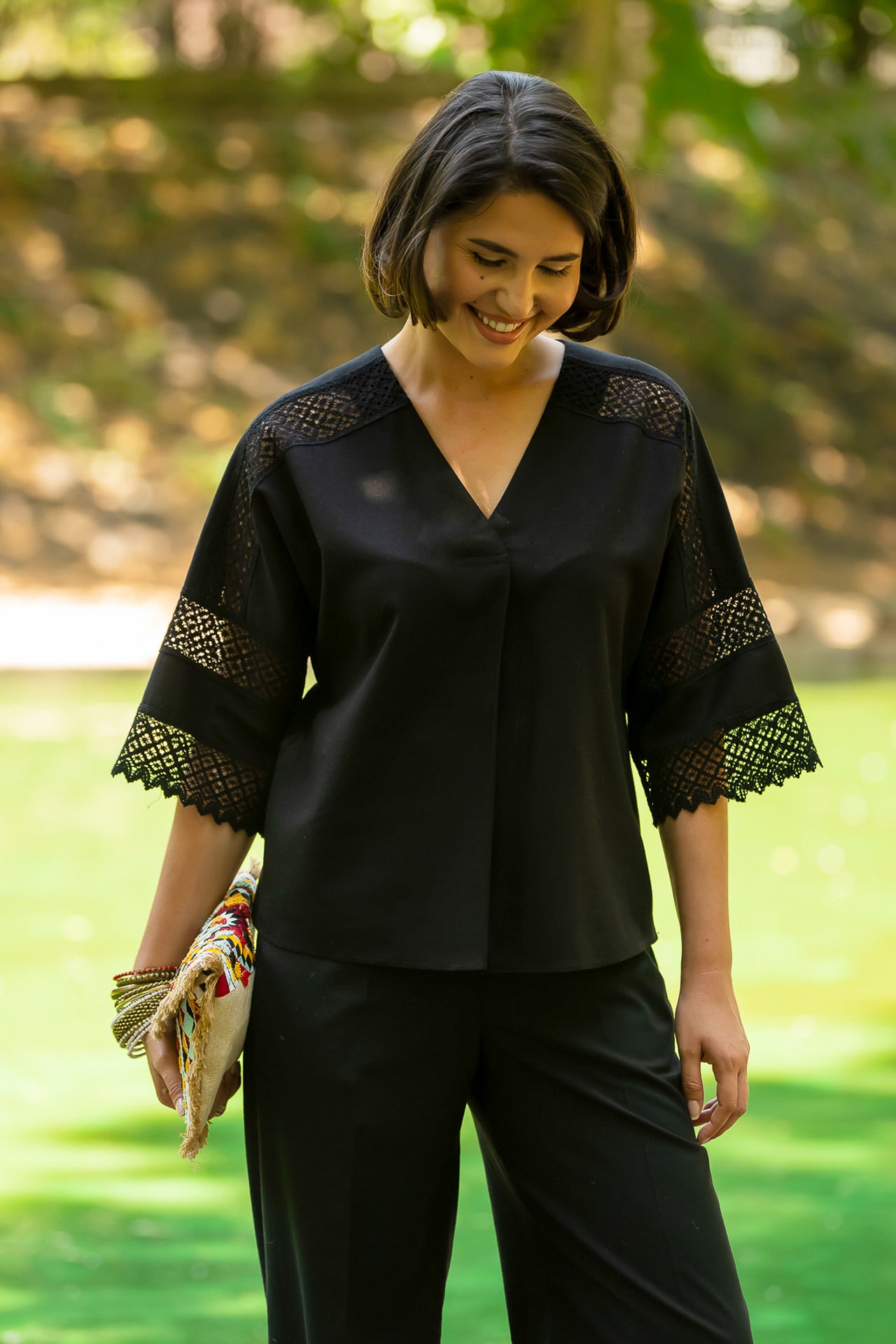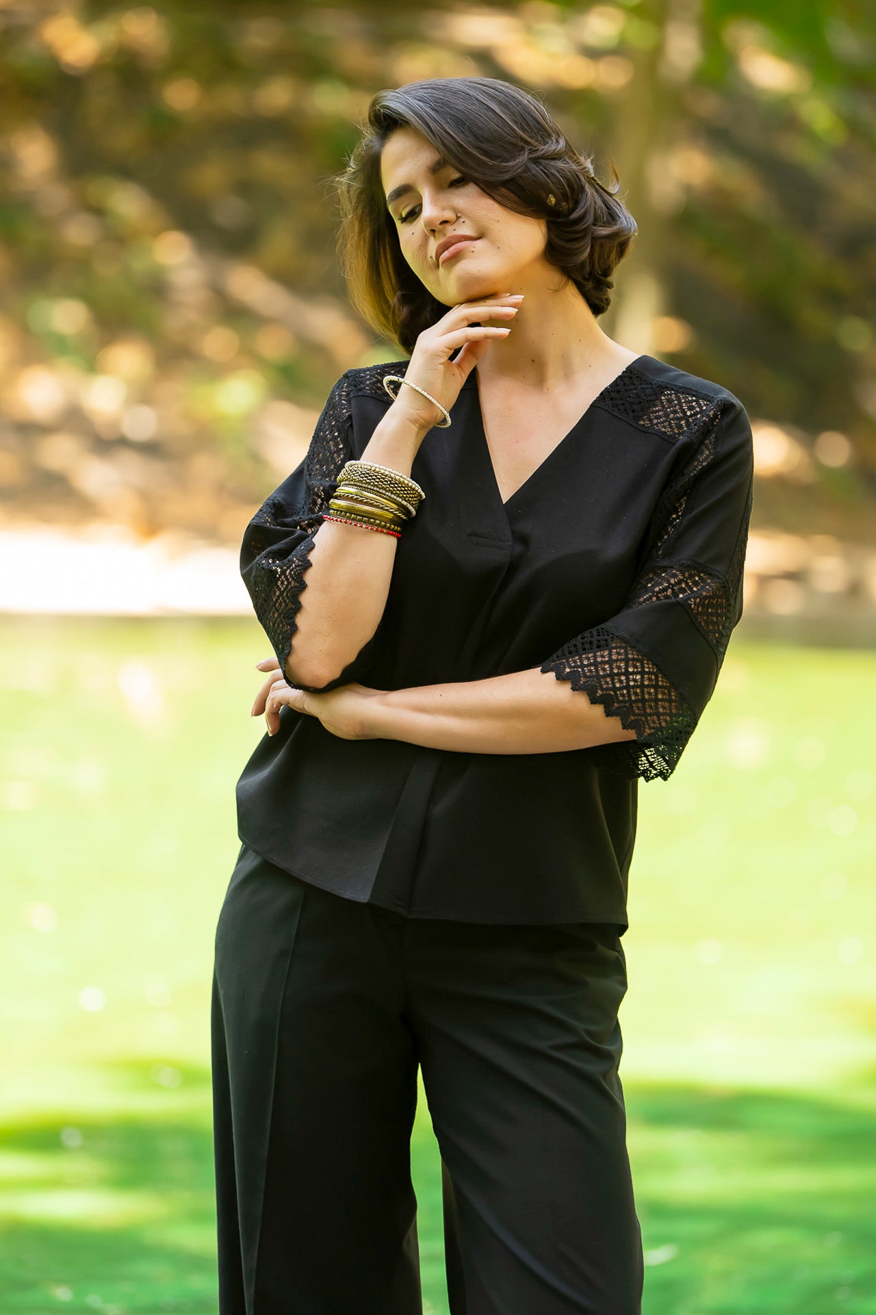 Bluza are un croi modern, inspirat de chimono-ul japonez și iinobilat cu dantelă prețioasă din bumbac.