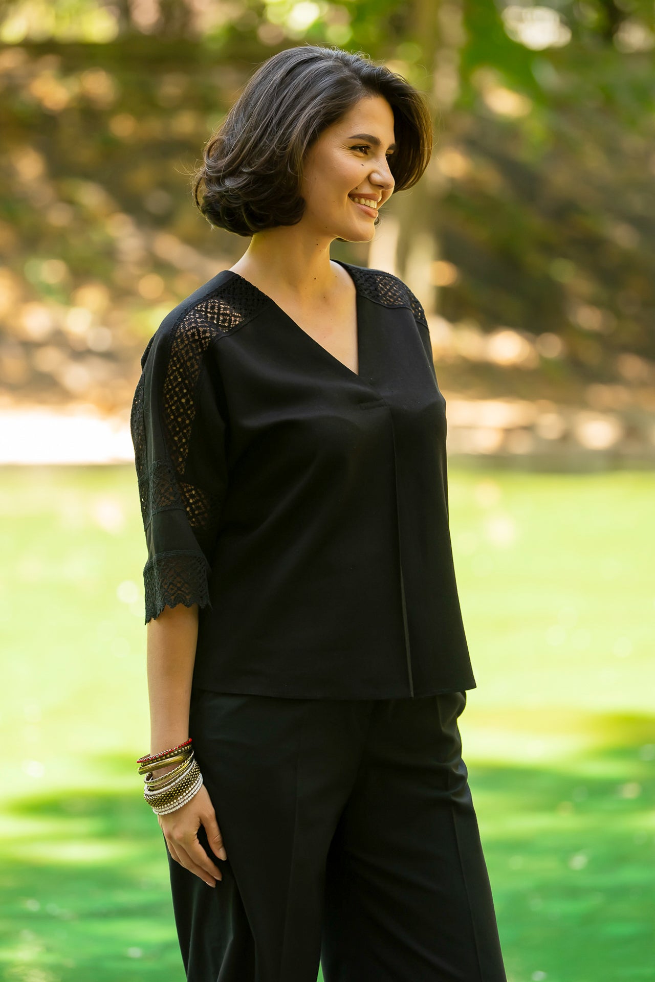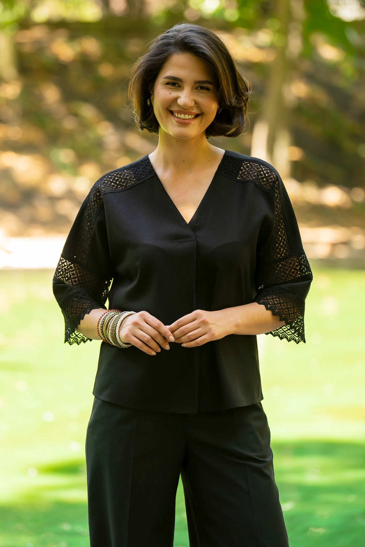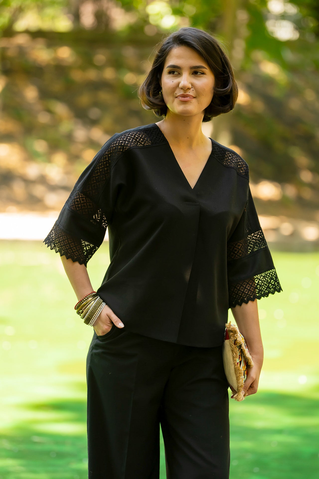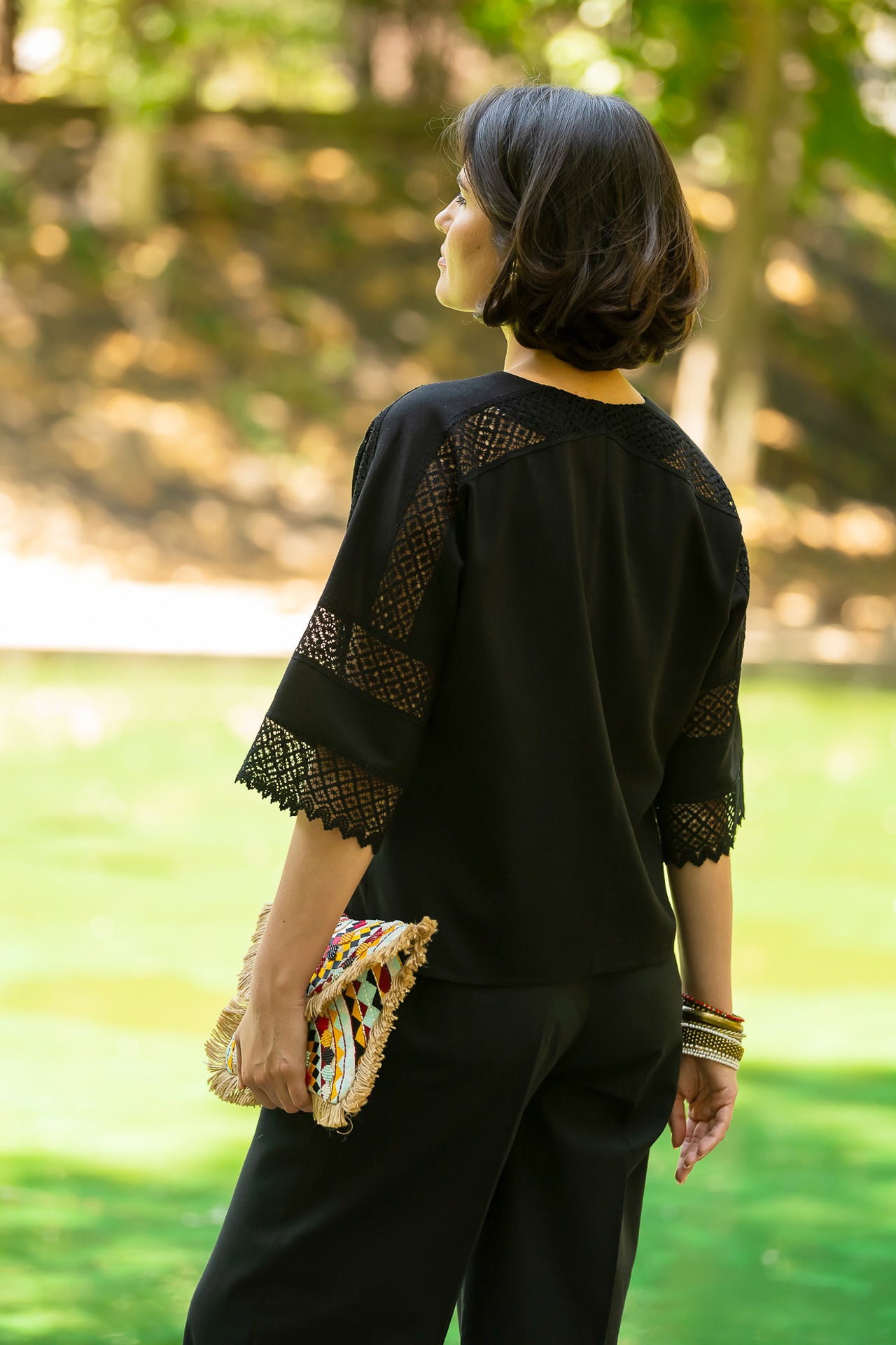 Bluza are un croi modern, inspirat de chimono-ul japonez și iinobilat cu dantelă prețioasă din bumbac.