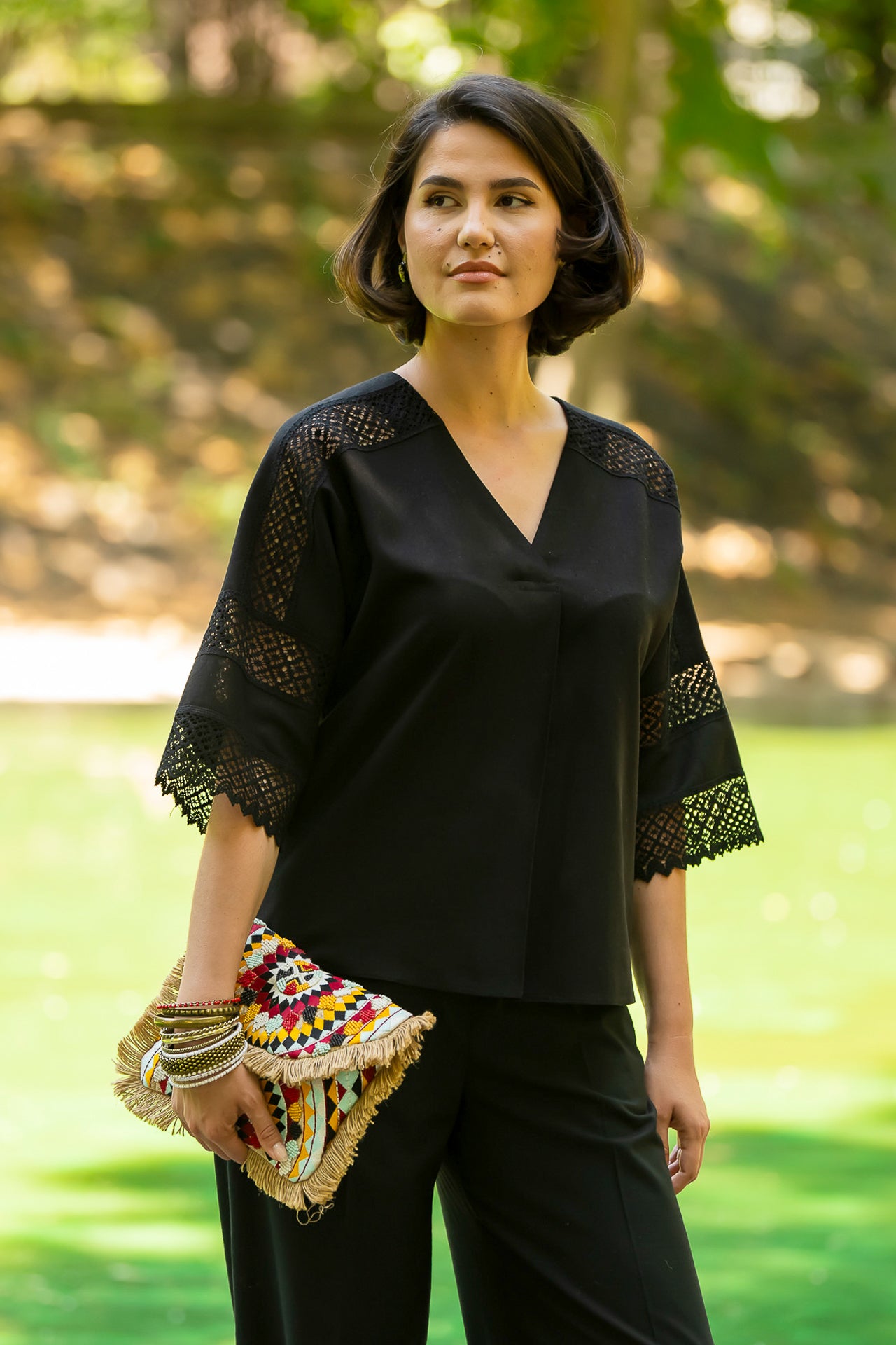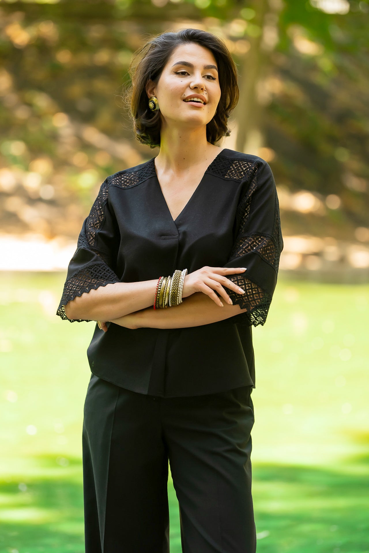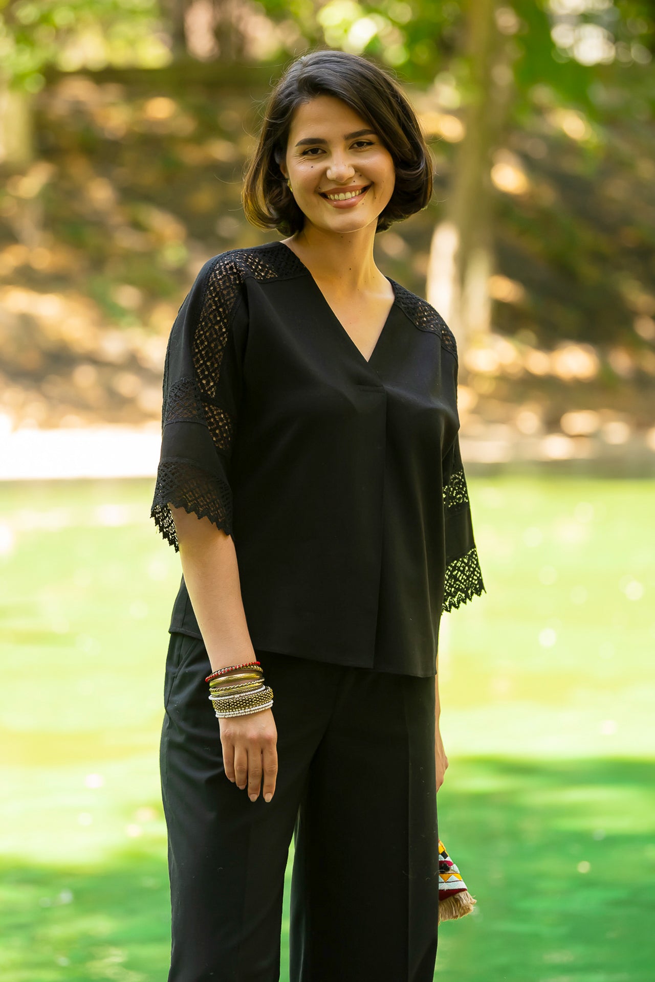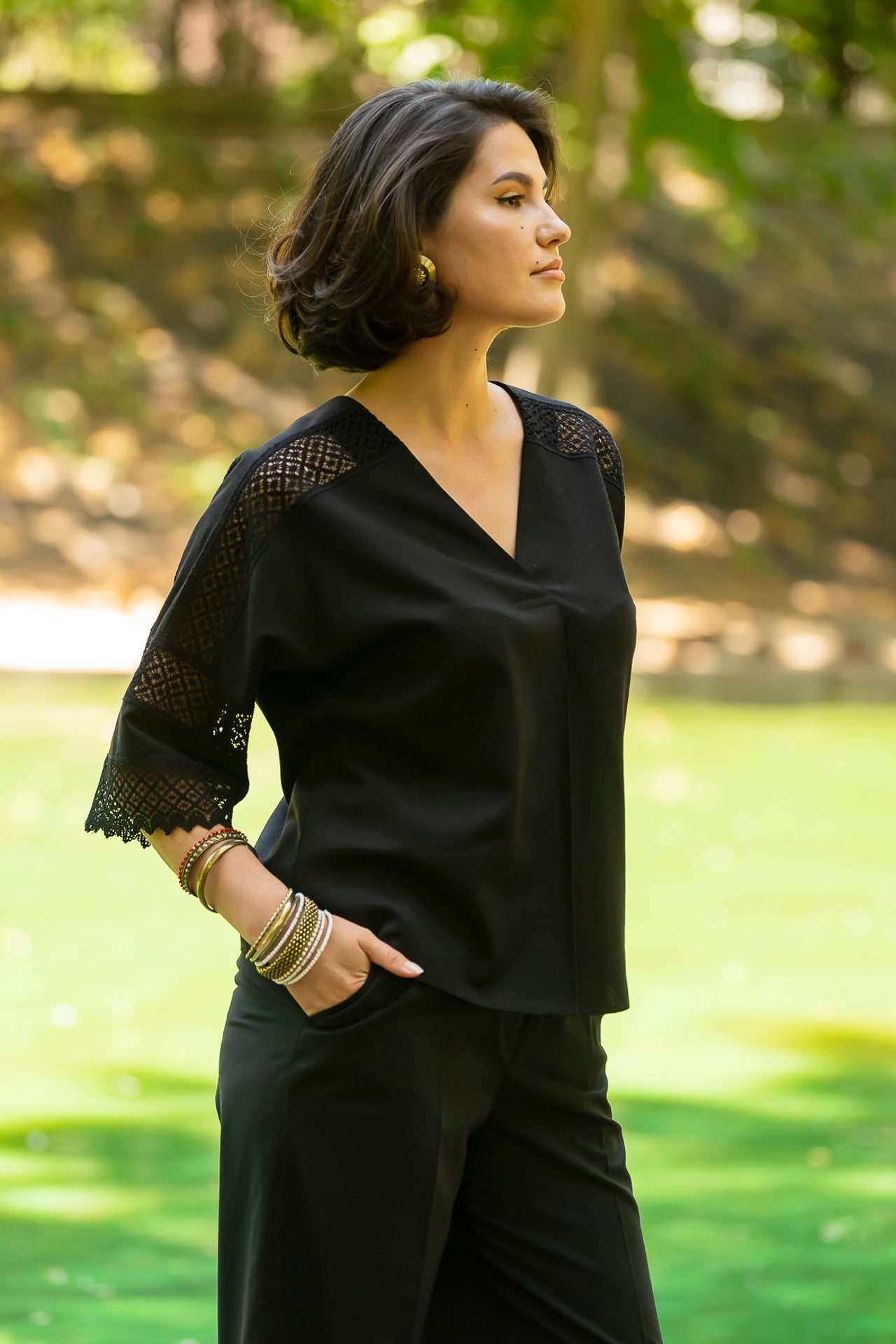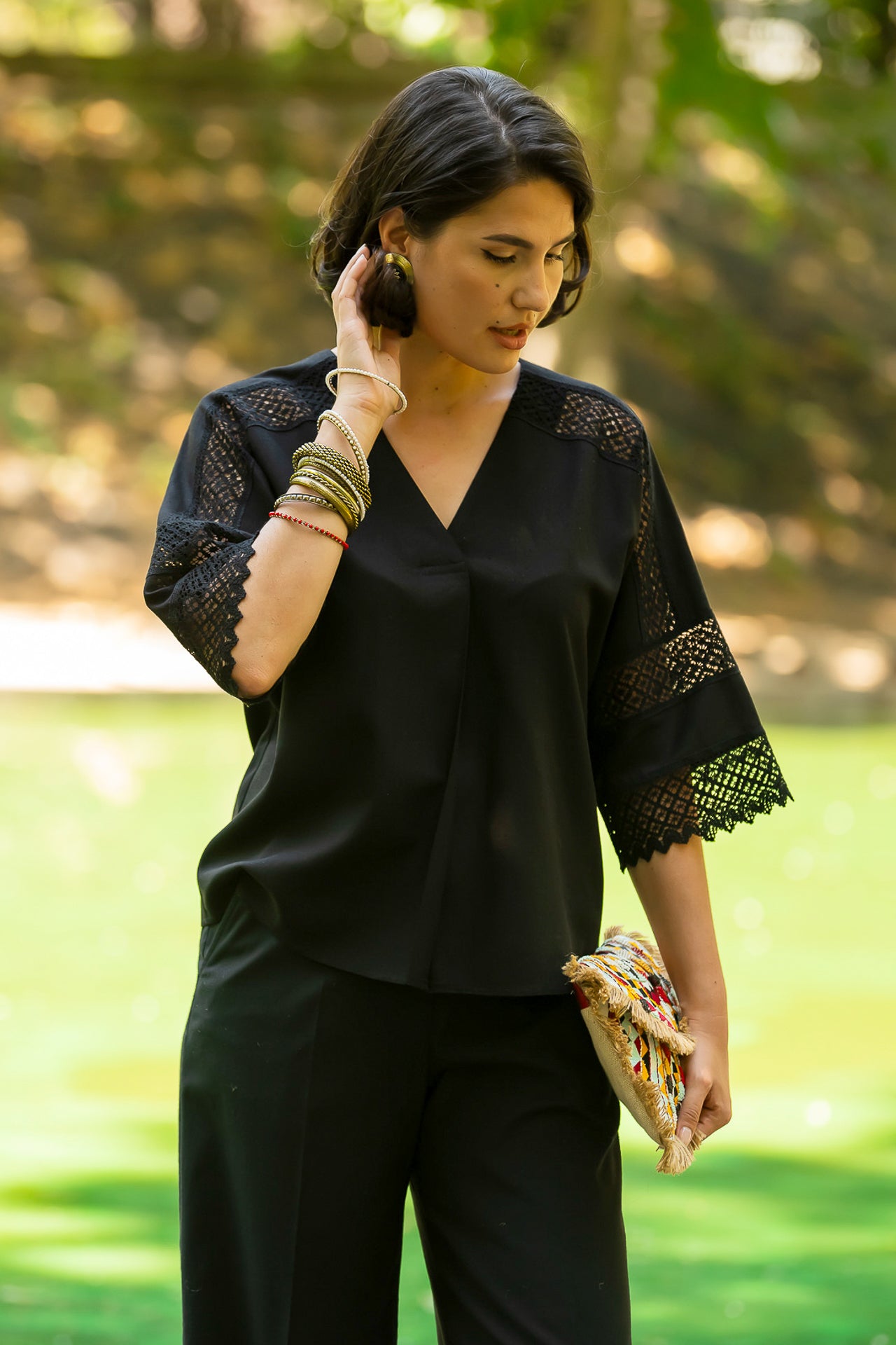 Bluza are un croi modern, inspirat de chimono-ul japonez și iinobilat cu dantelă prețioasă din bumbac.