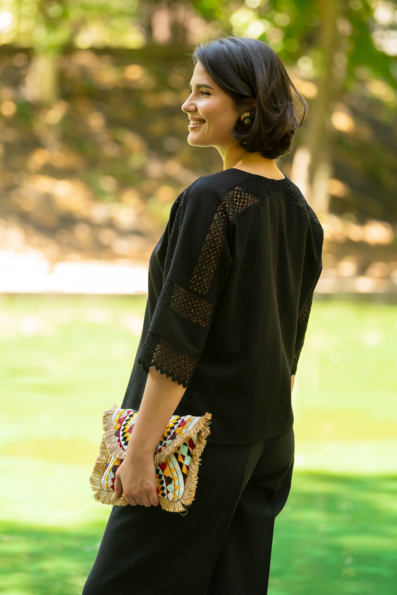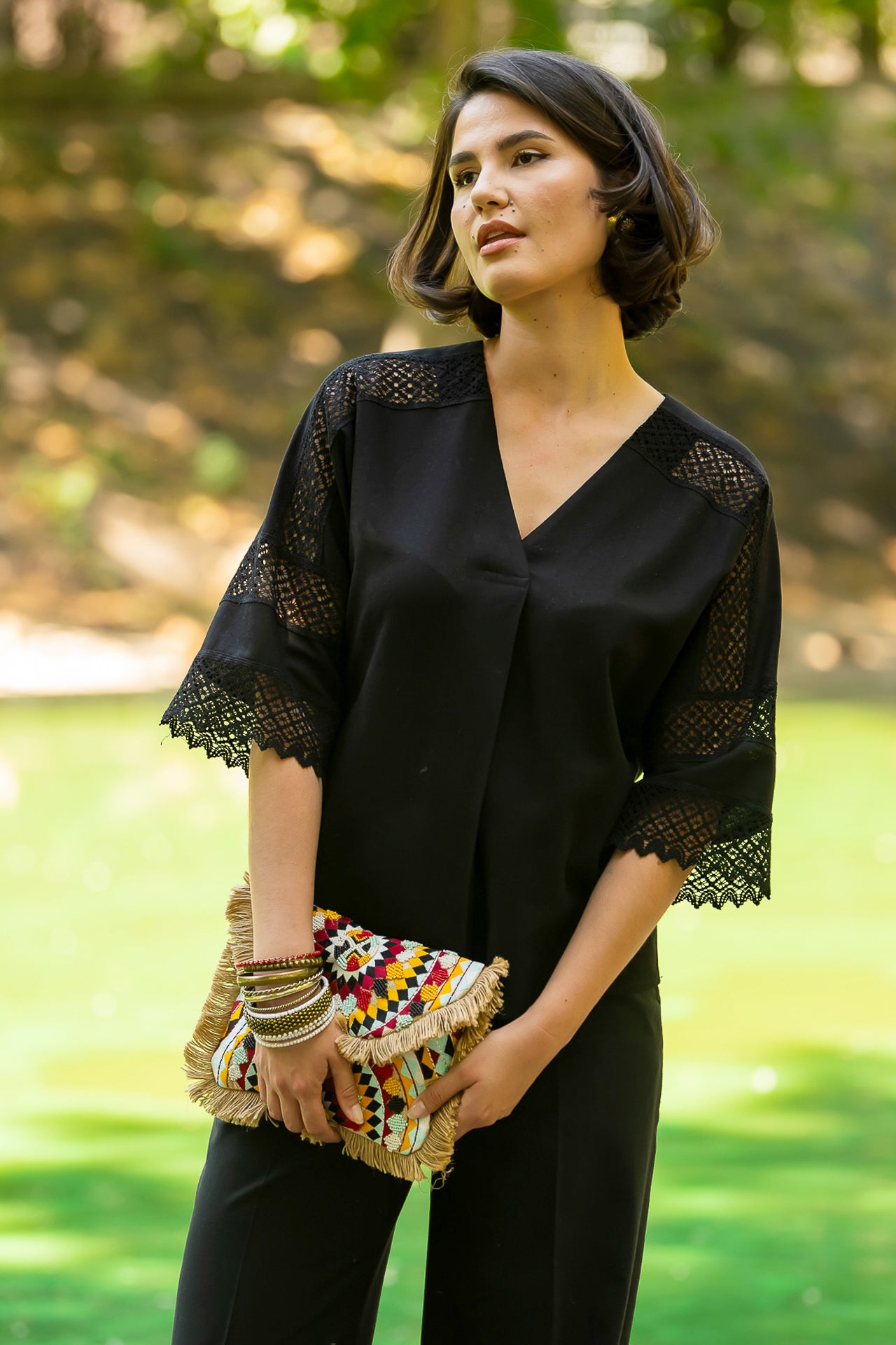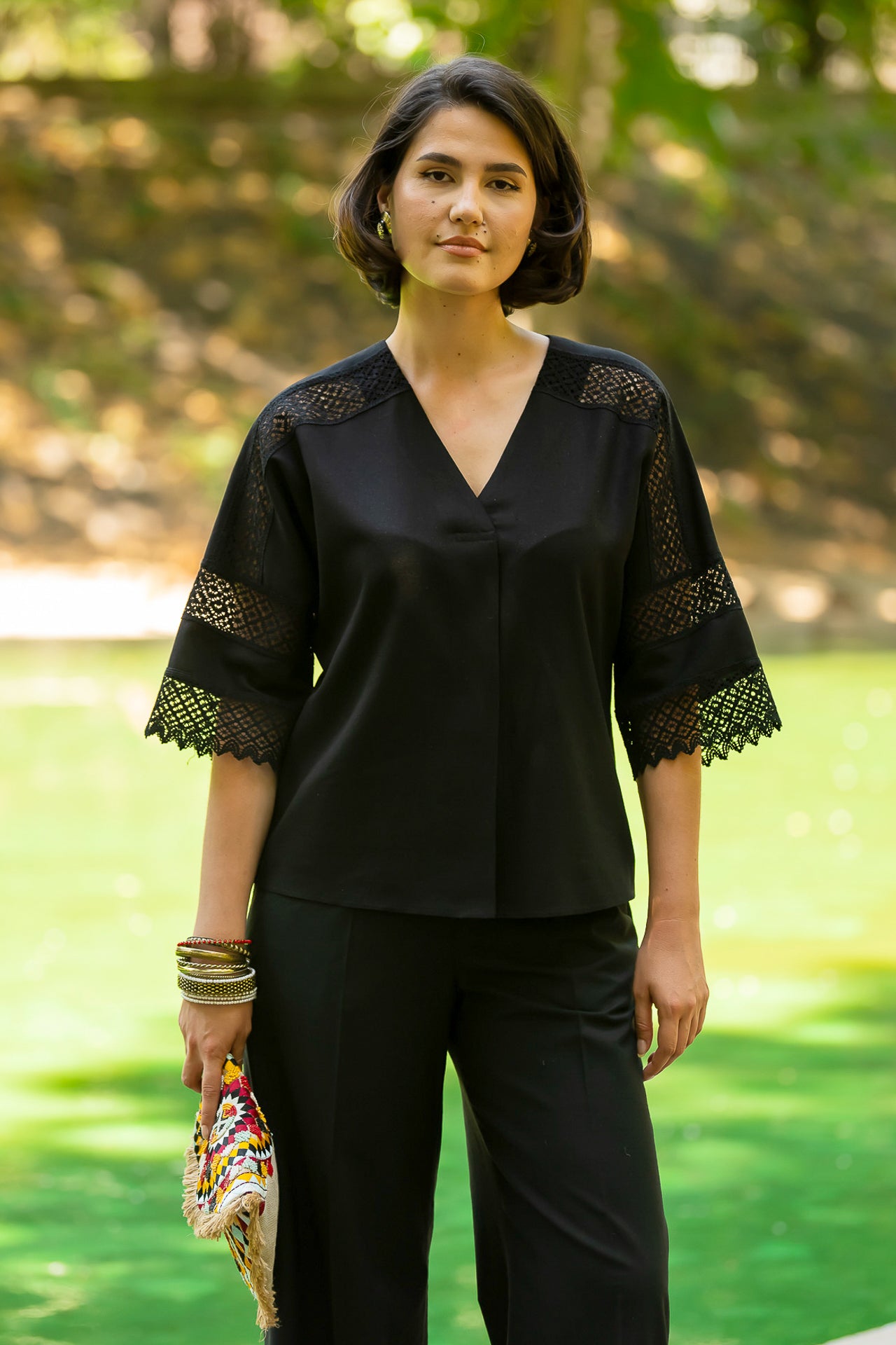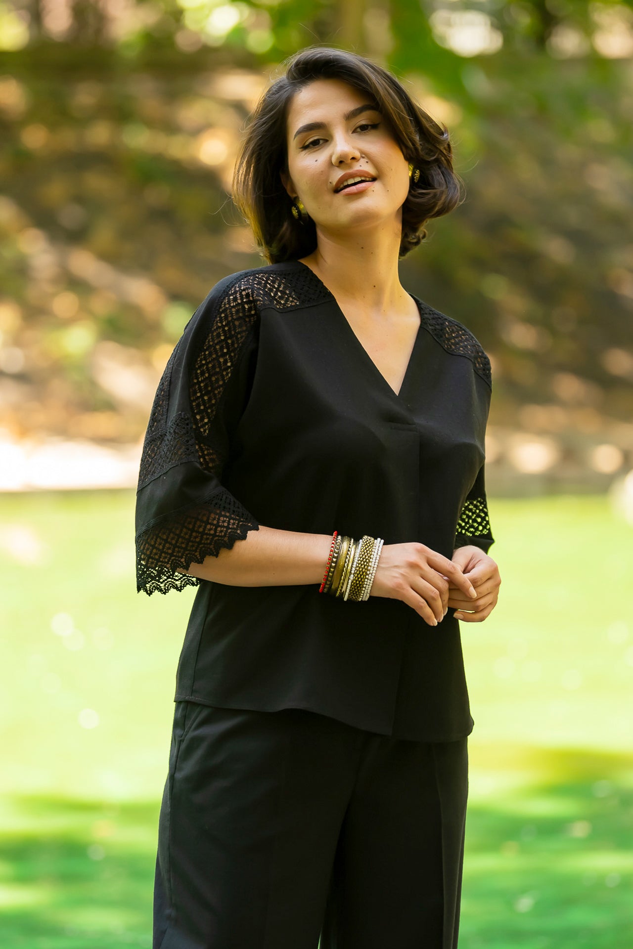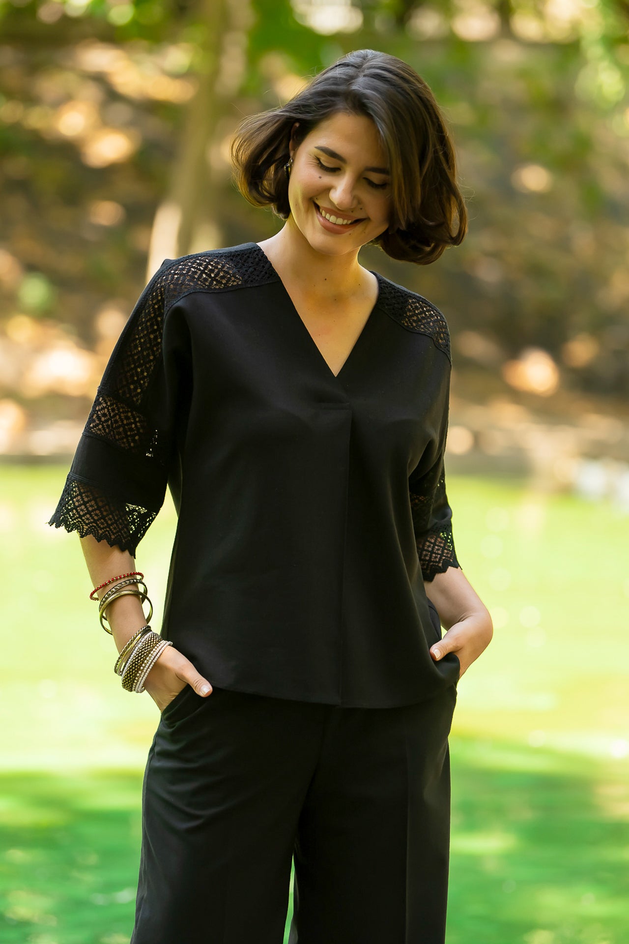 Bluza are un croi modern, inspirat de chimono-ul japonez și iinobilat cu dantelă prețioasă din bumbac.