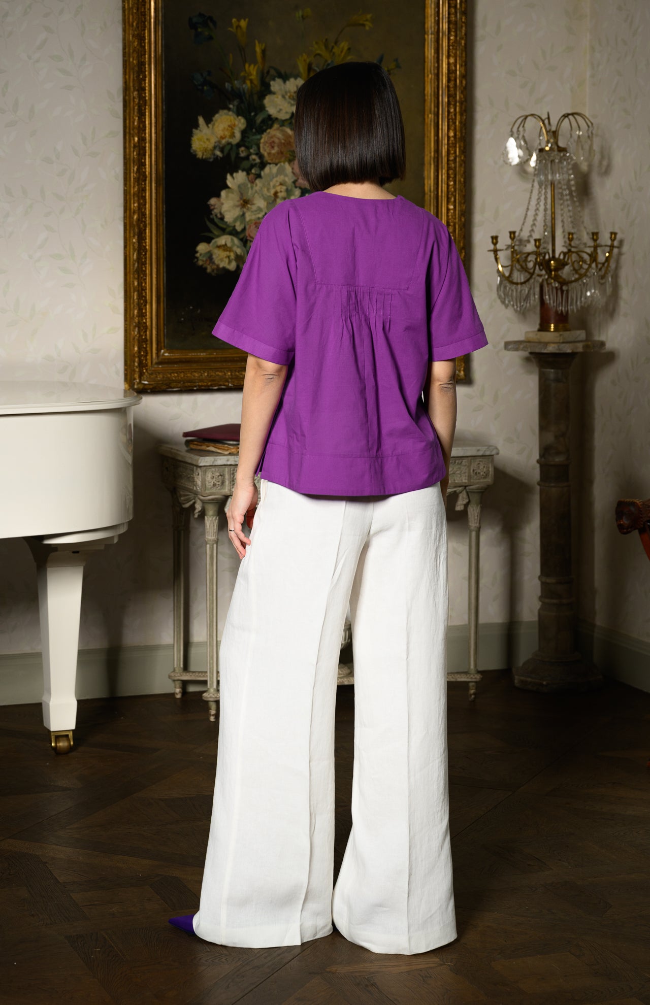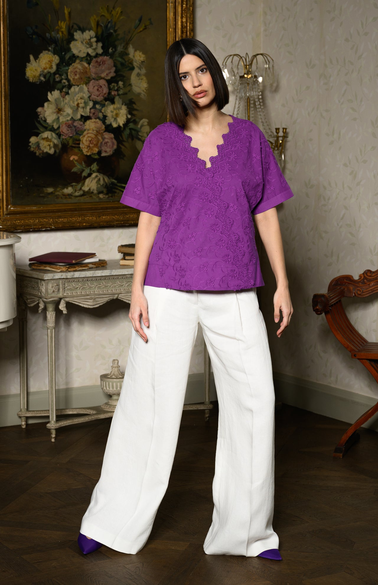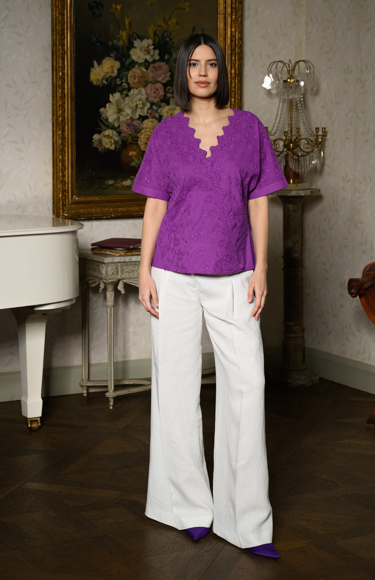 Bluza chimono violet din batist de bumbac și broderie tridimensională