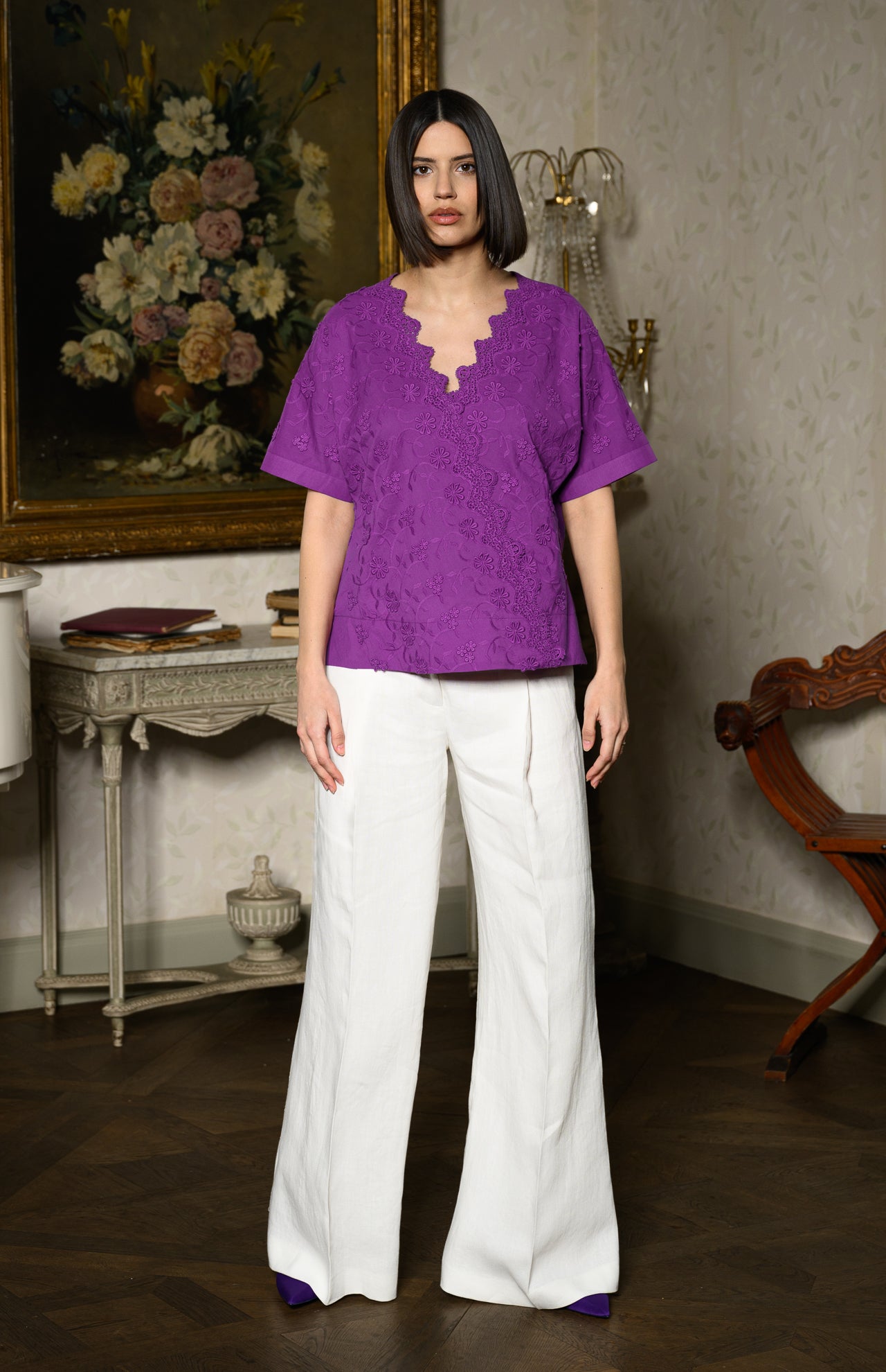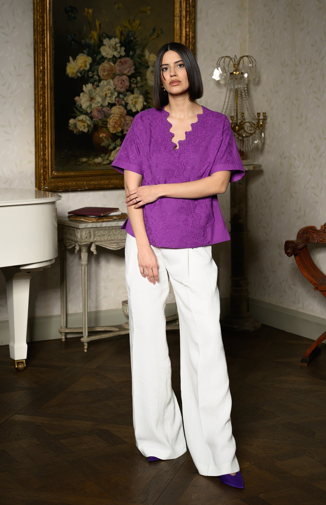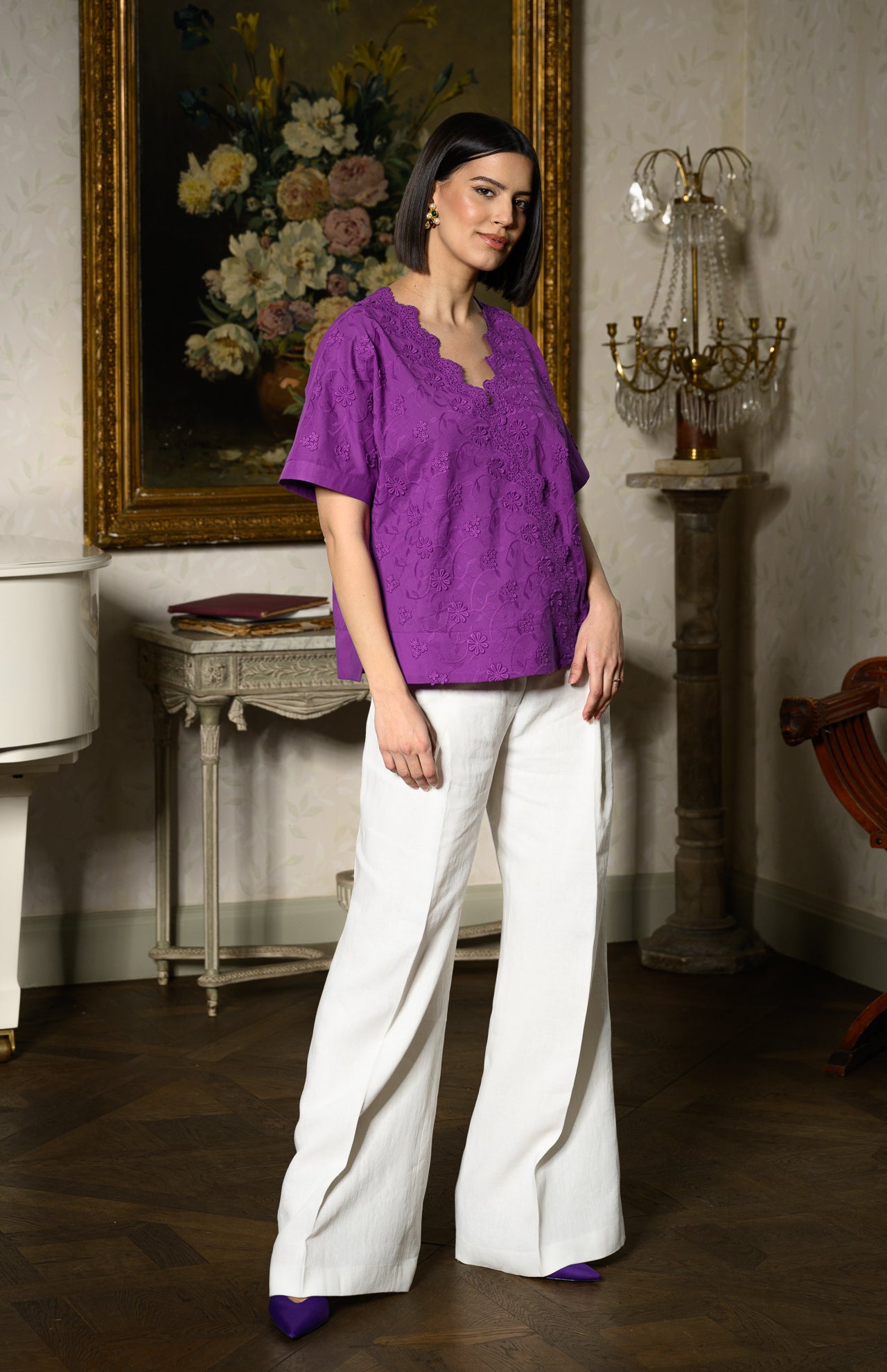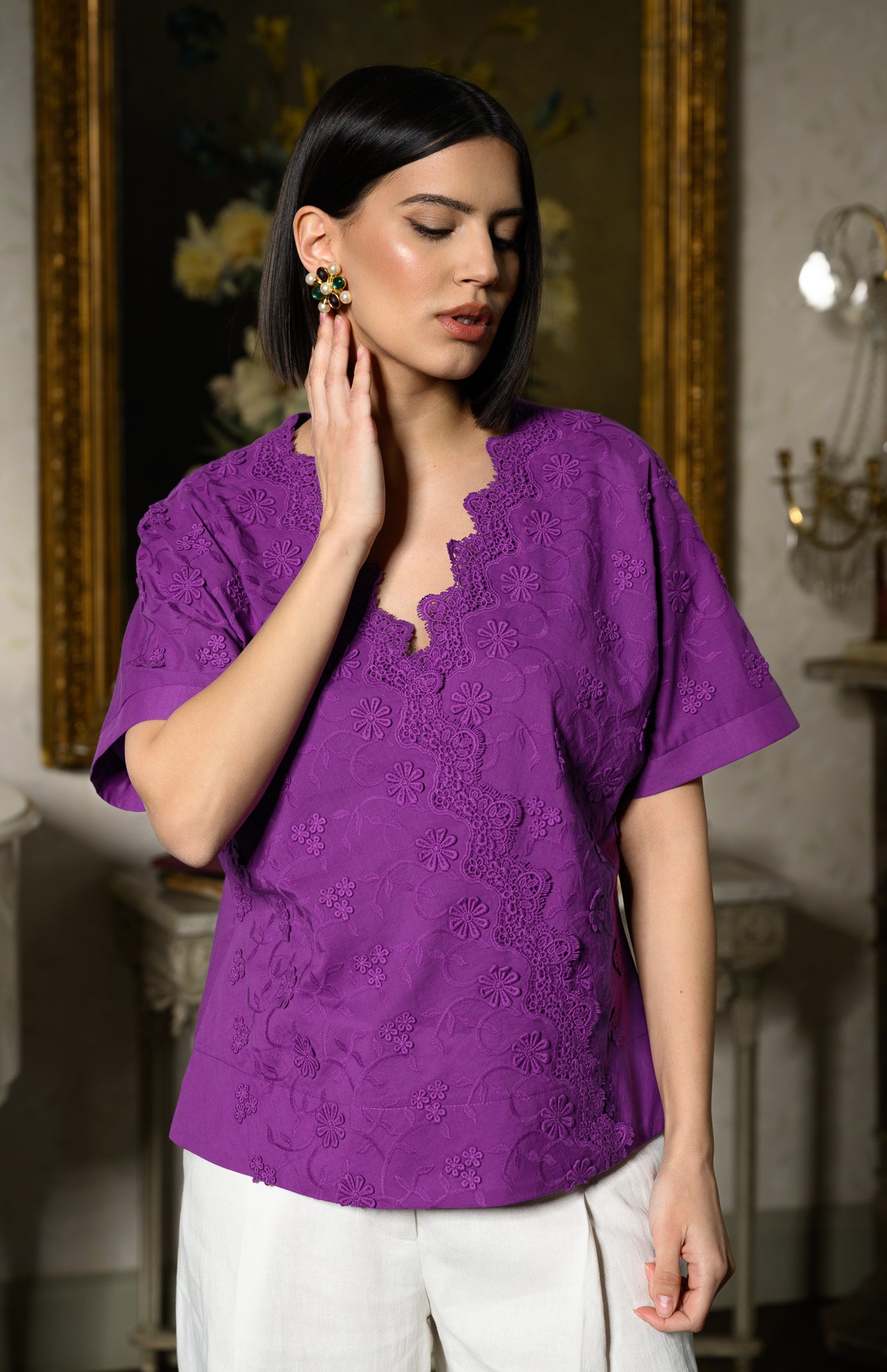 Bluza chimono violet este confecționată din batist subțire și fin, înnobilat cu o broderie florala spectaculoasă și finisaje migăloase.