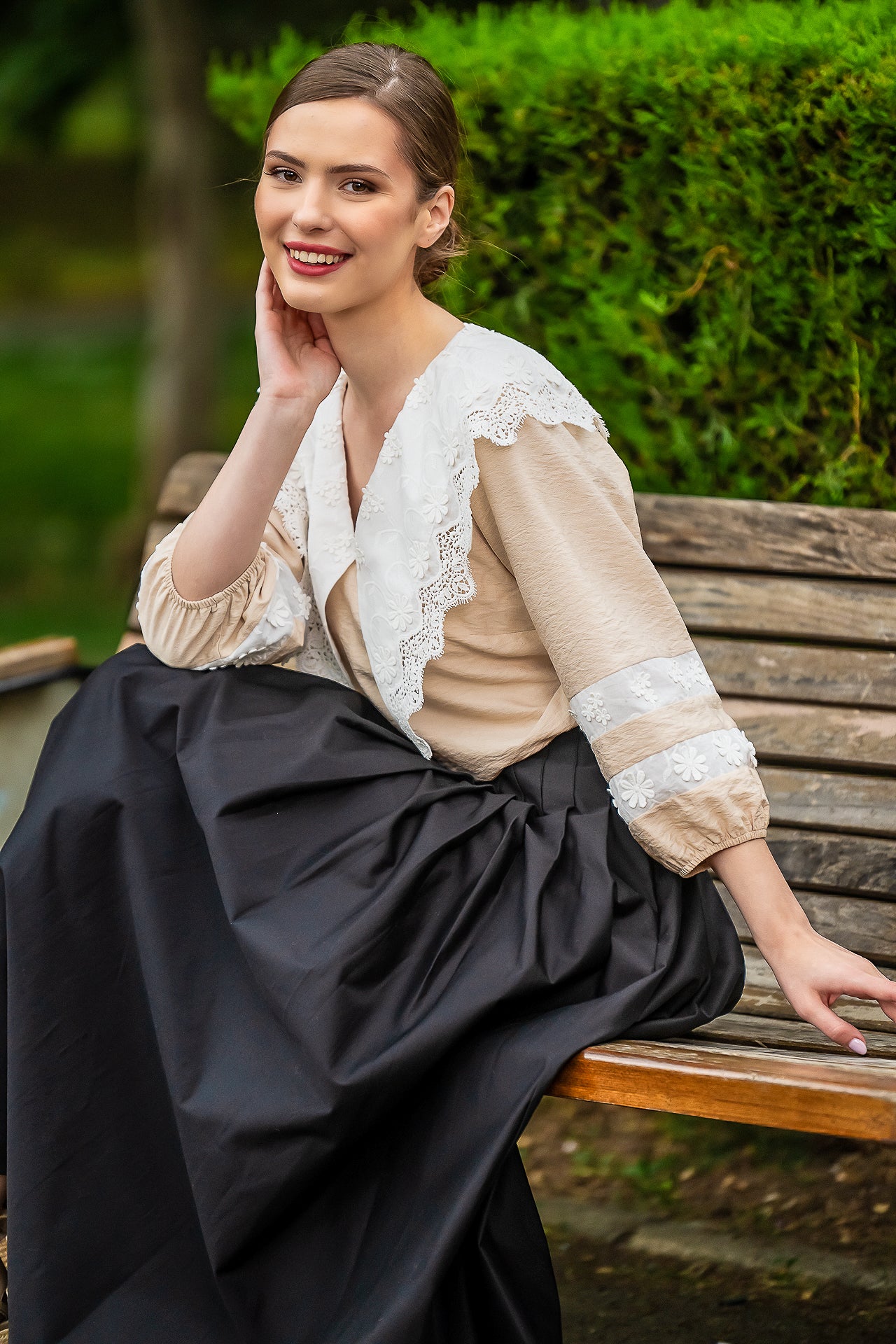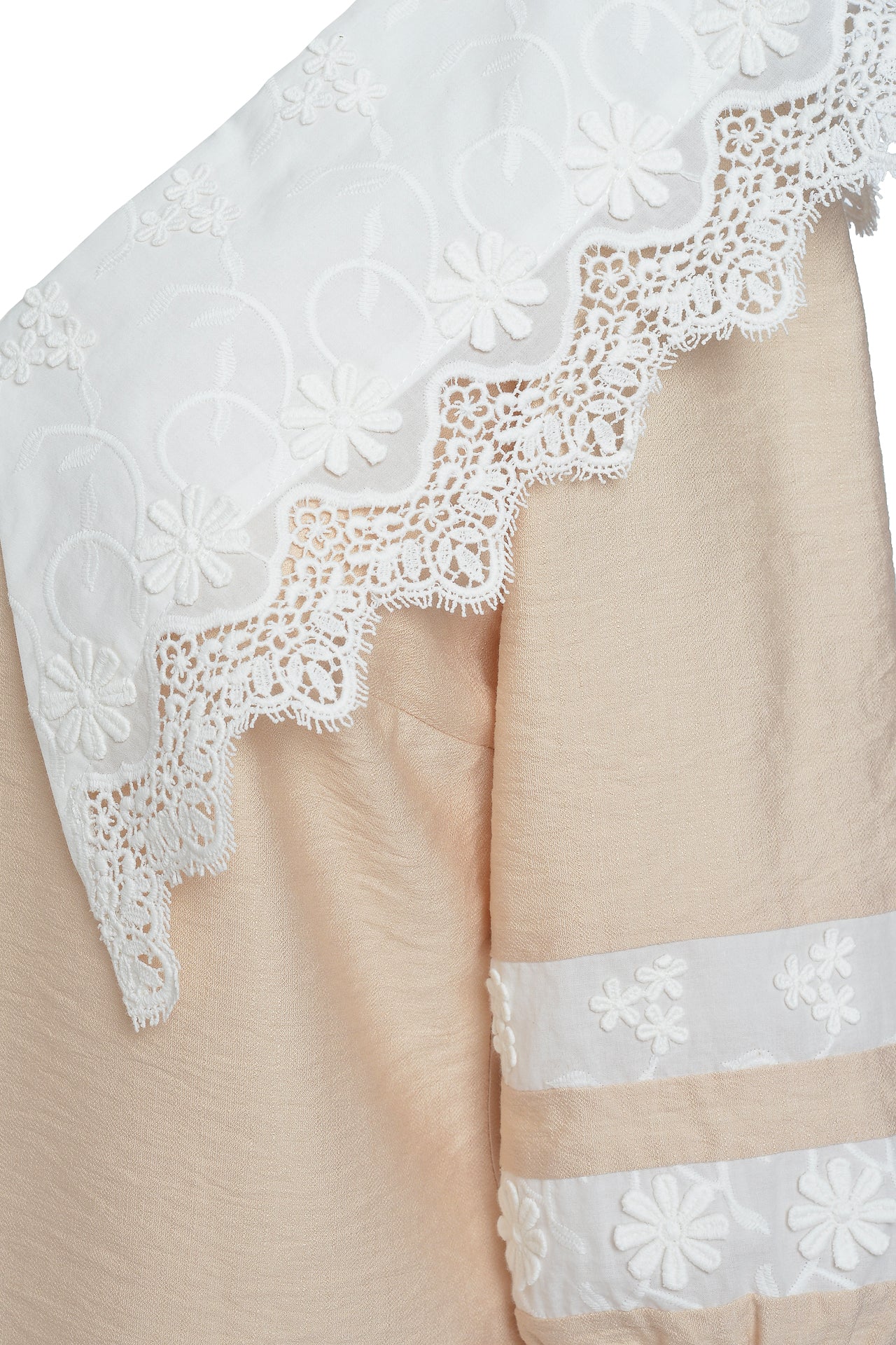 Bluza crem cu guler este confecționată din viscoză cu in și guler din bumbac cu dantelă și broderie florală tridimensională.
