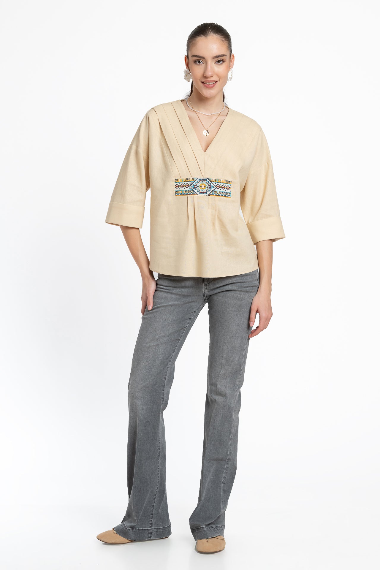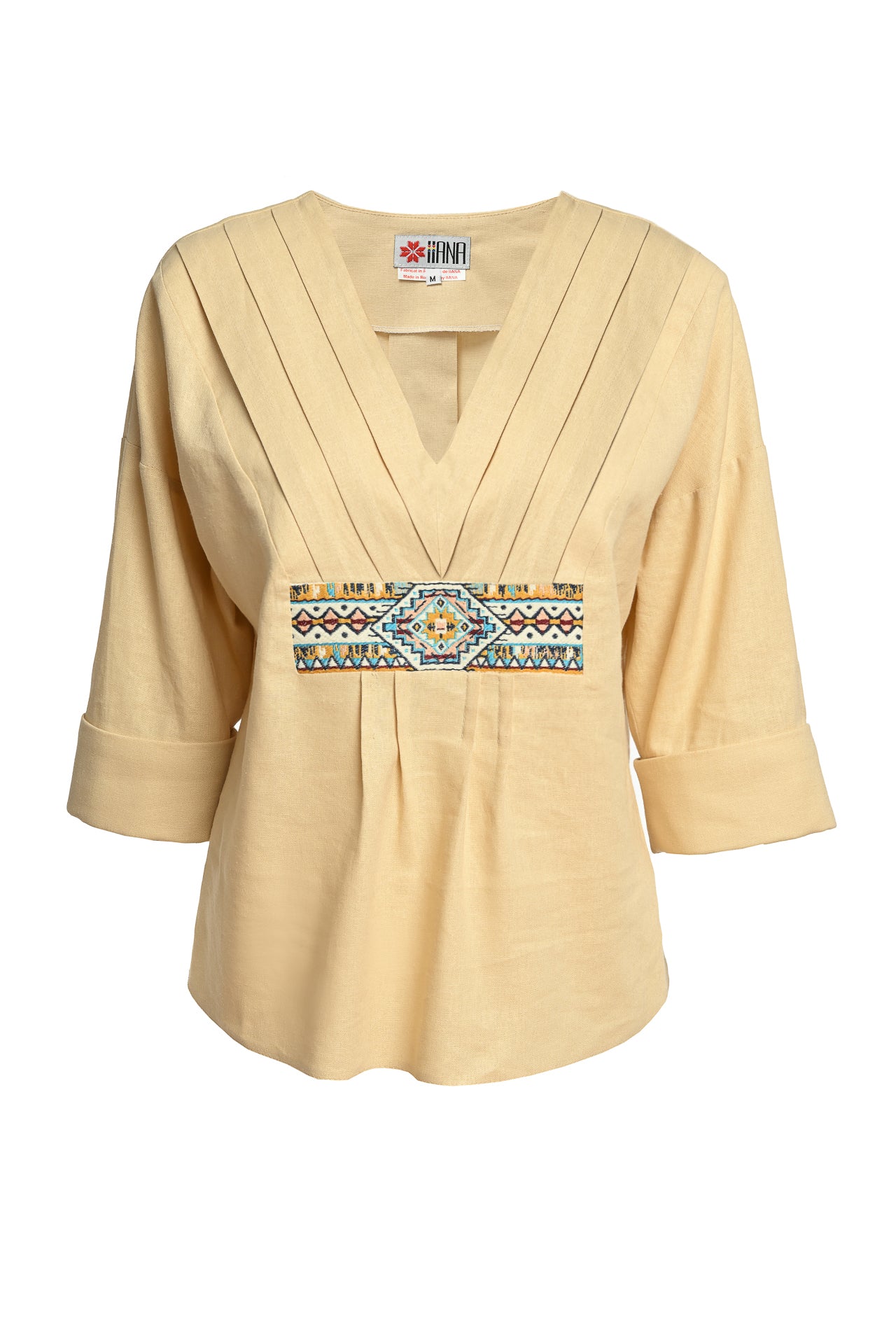 Bluza crem din in este atent cusută cu finisaje manuale în decolteu, are manșete late și pliu dublu pe spate.