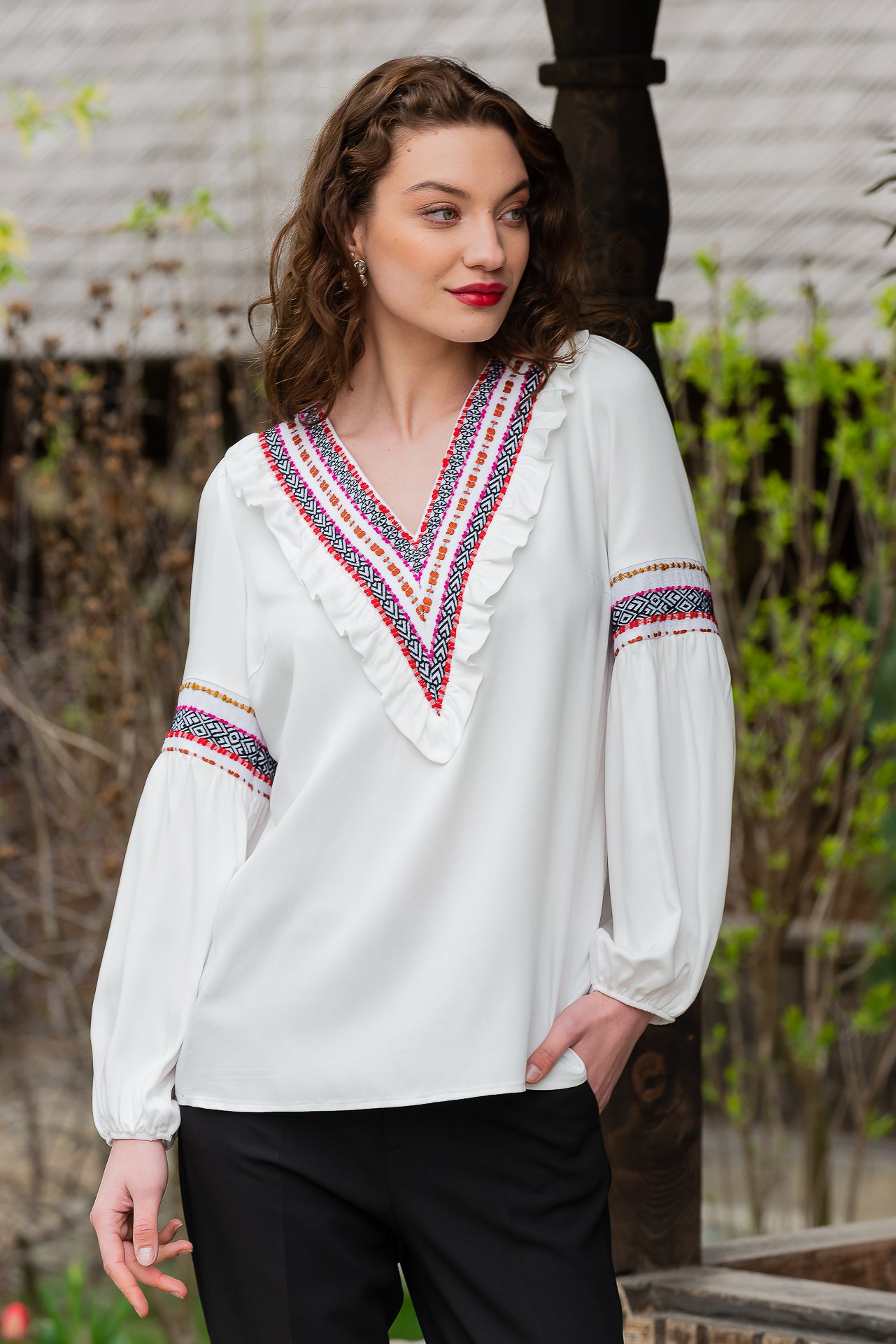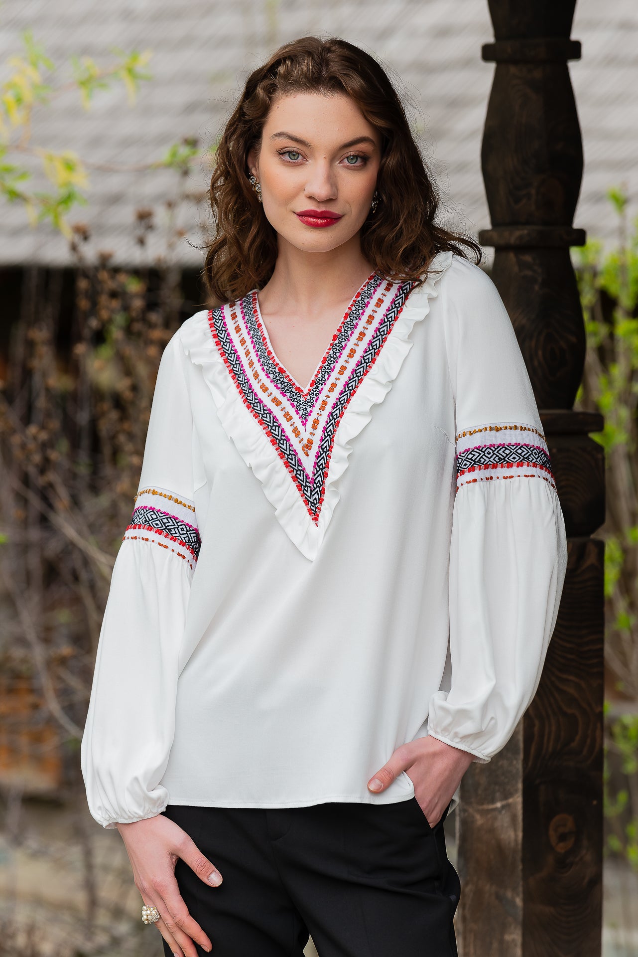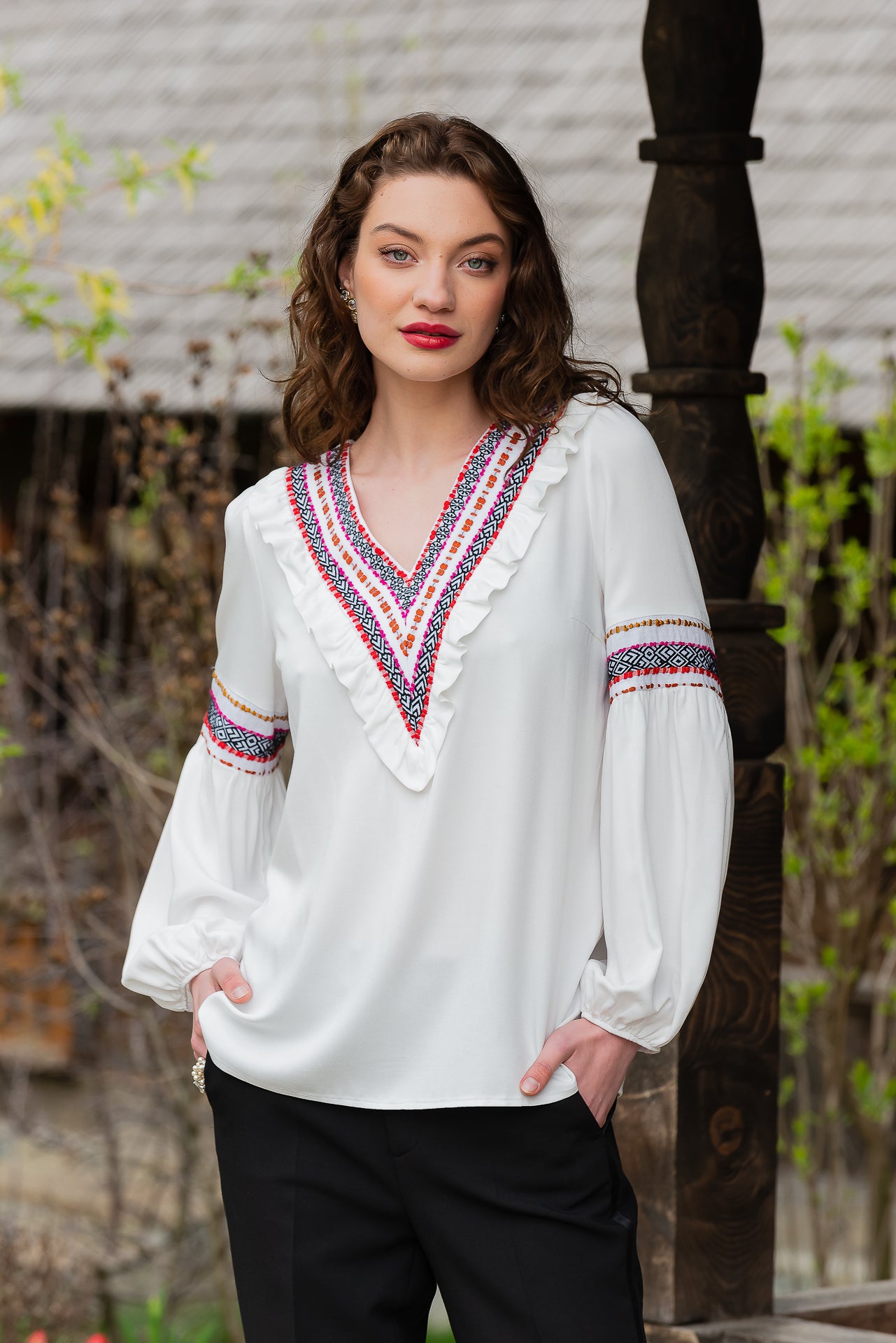 Bluza Stilizată Casiana are un croi lejer, un decolteu anchior și mâneca bogată.
