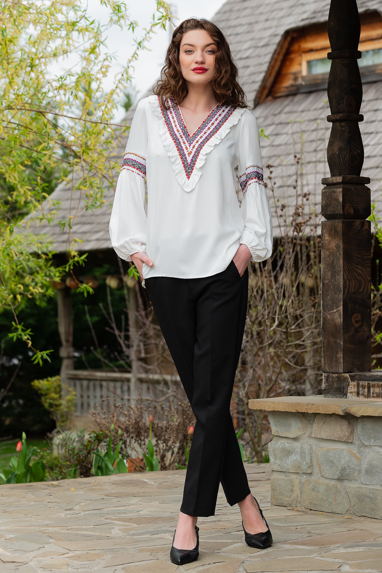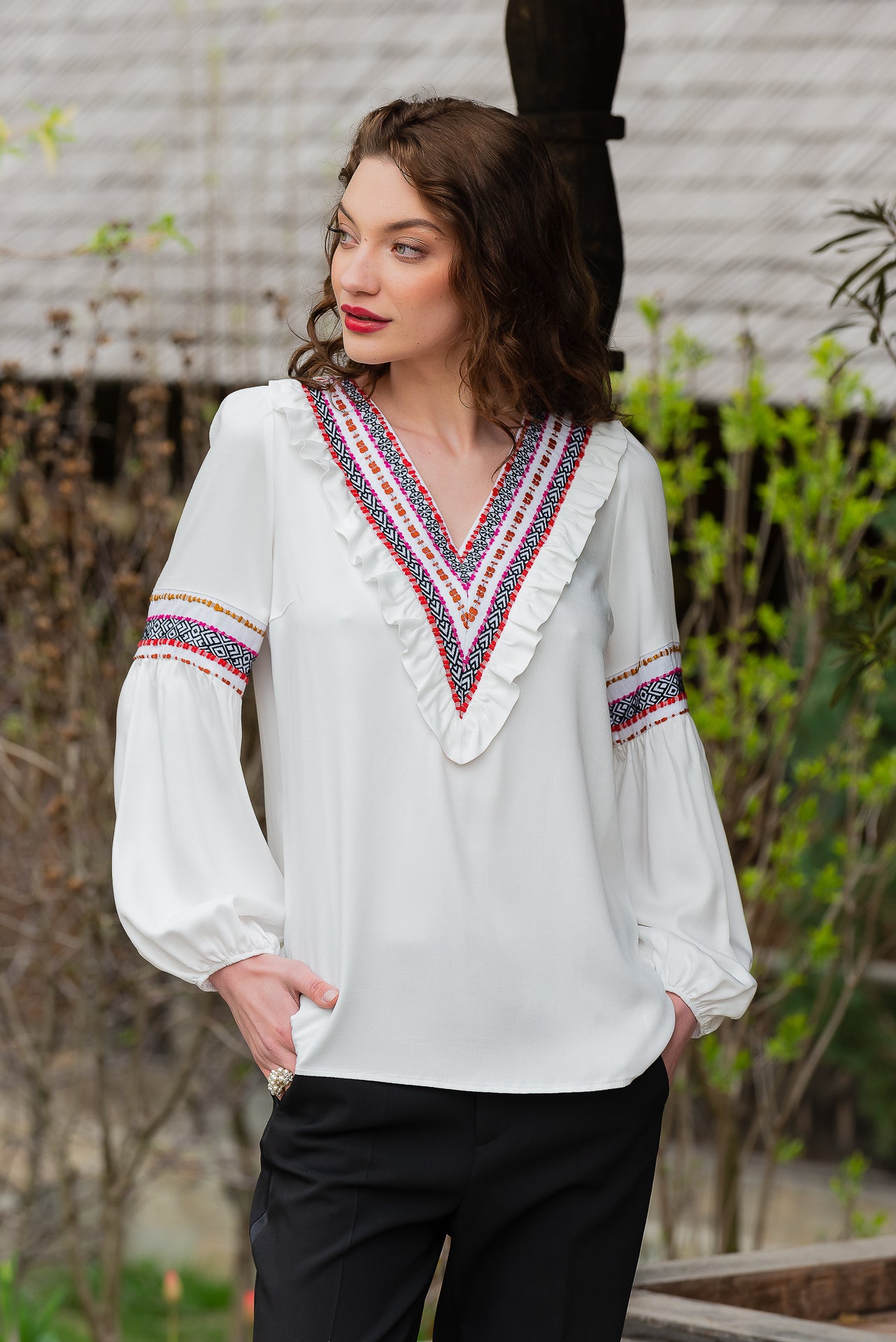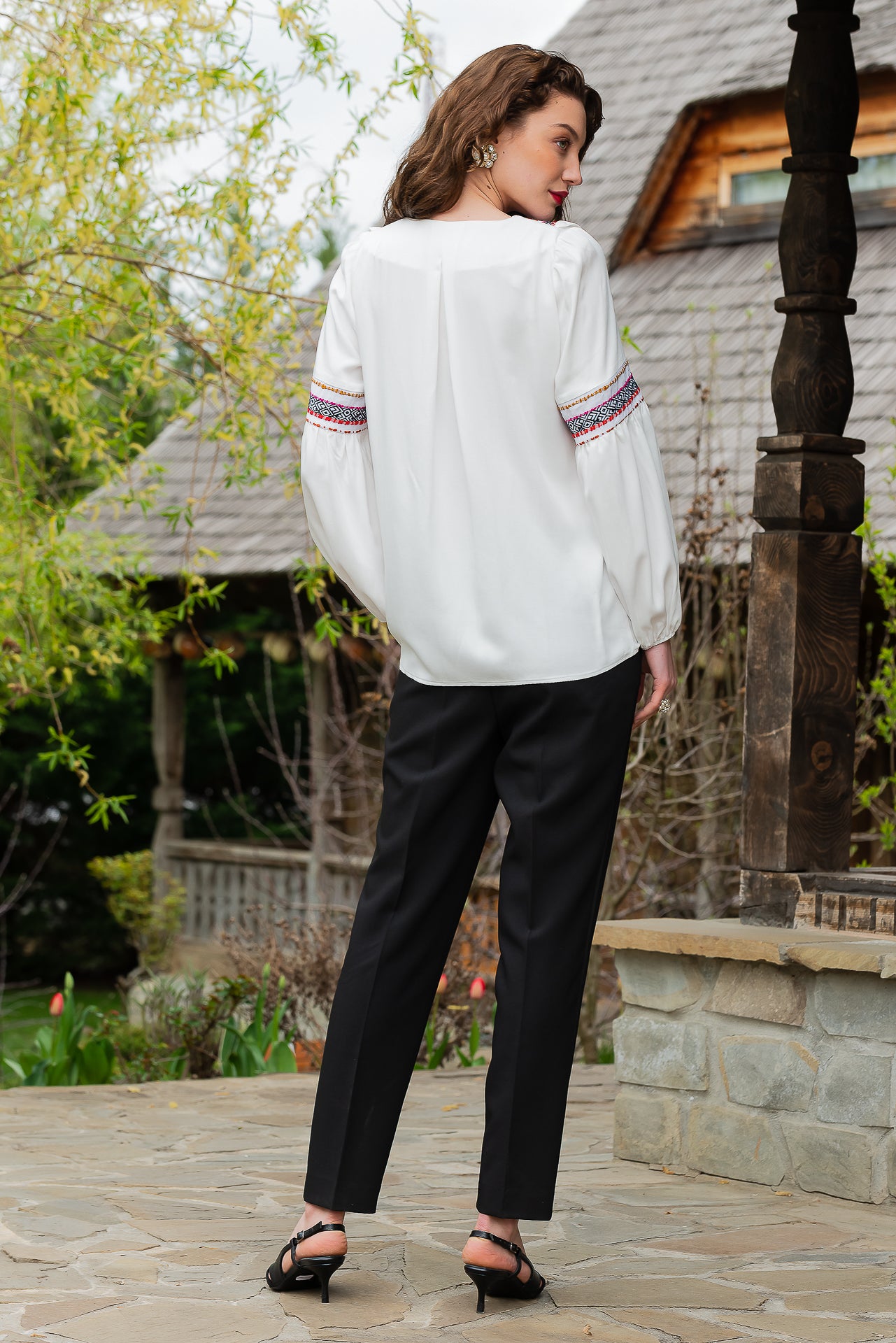 Bluza Stilizată Casiana are un croi lejer, un decolteu anchior și mâneca bogată.