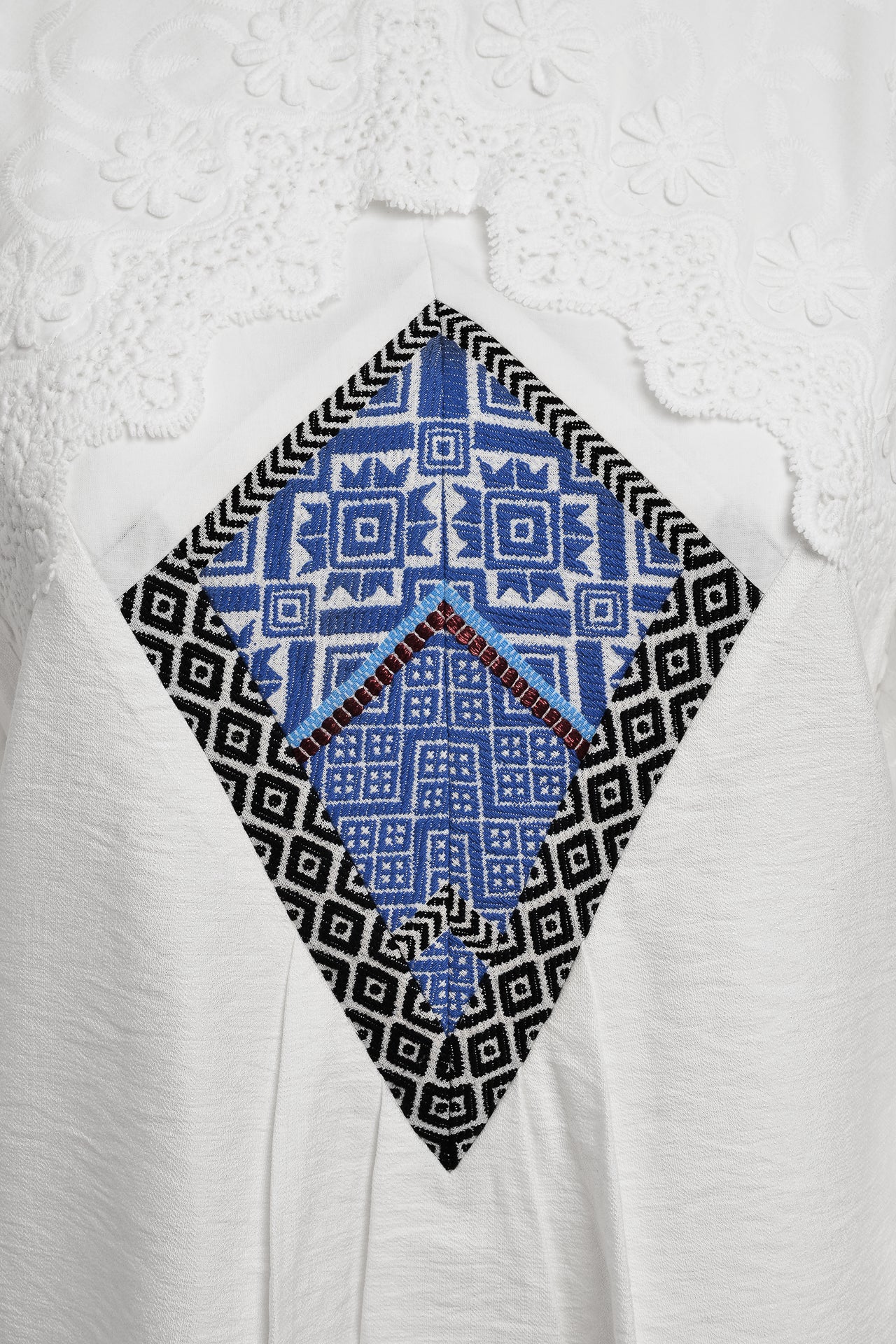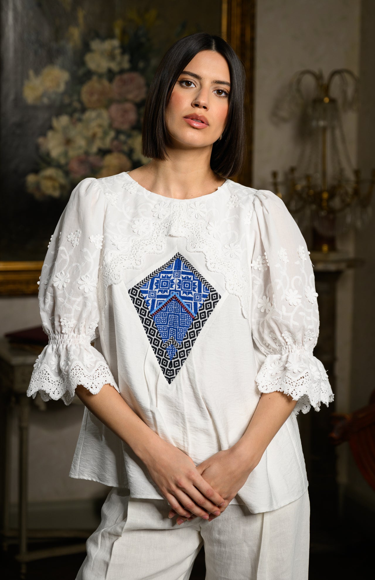 Bluză tradițională stilizată cu broderie tridimensională și jacquard etnic