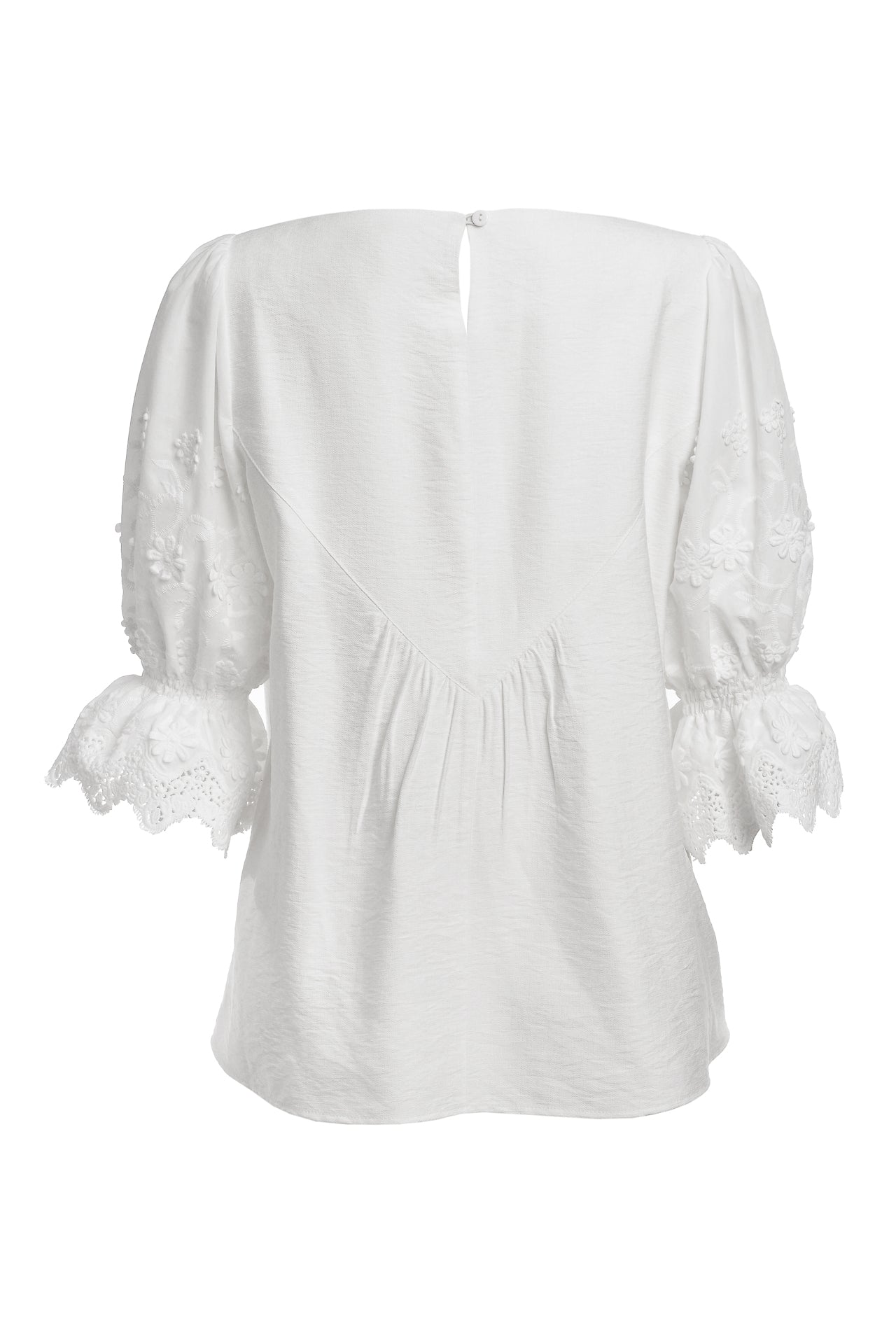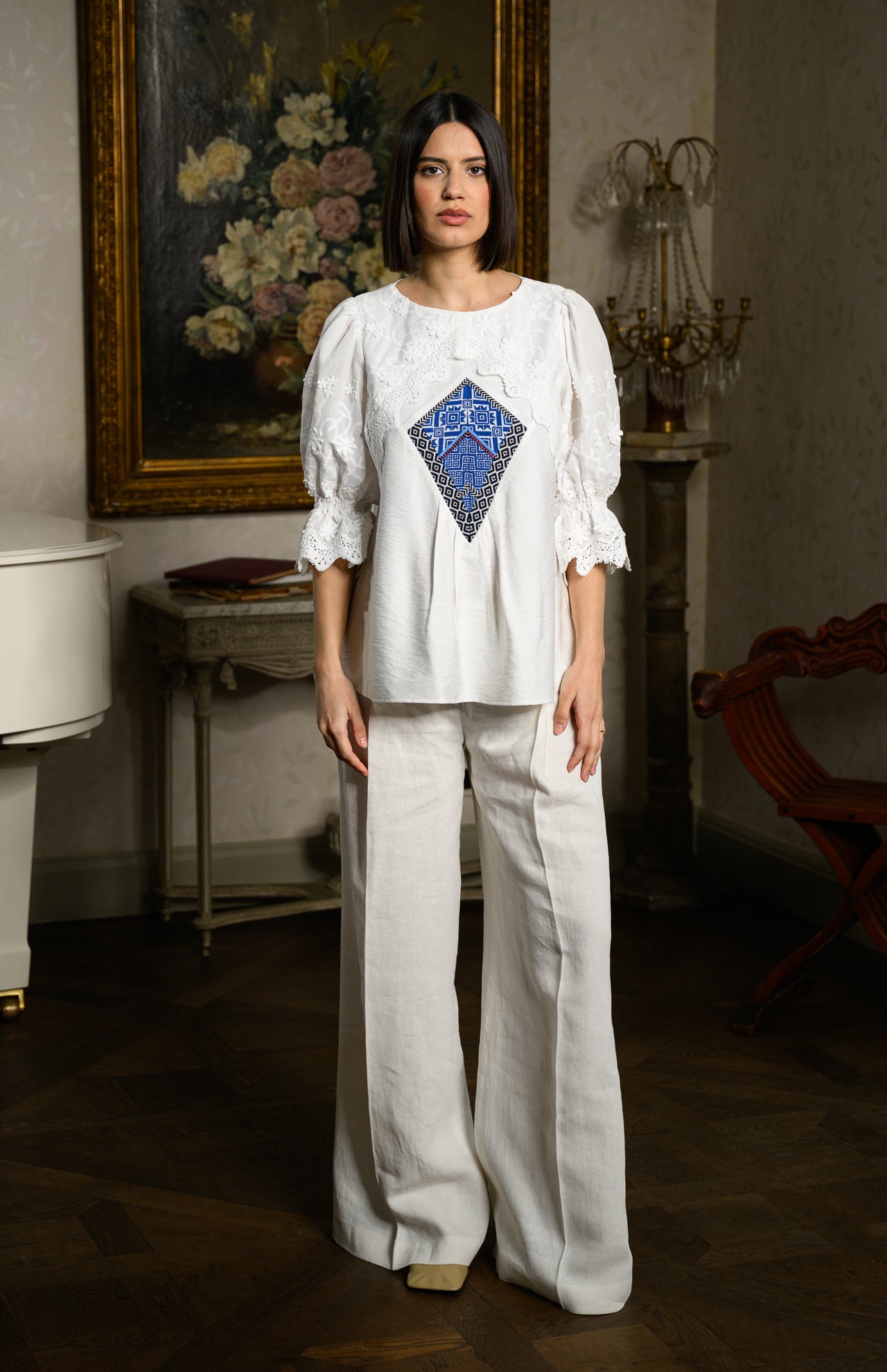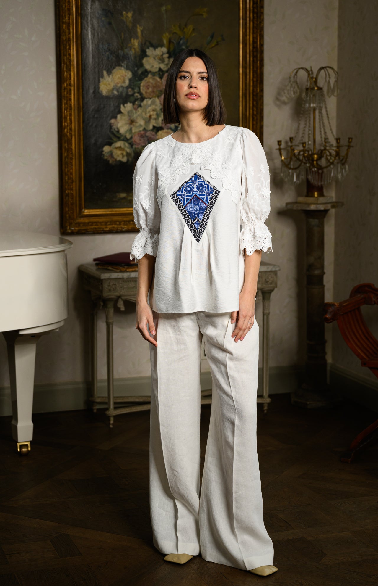 Bluza stilizată este confecționată din viscoză cu in și bumbac cu broderie tridimensională.
