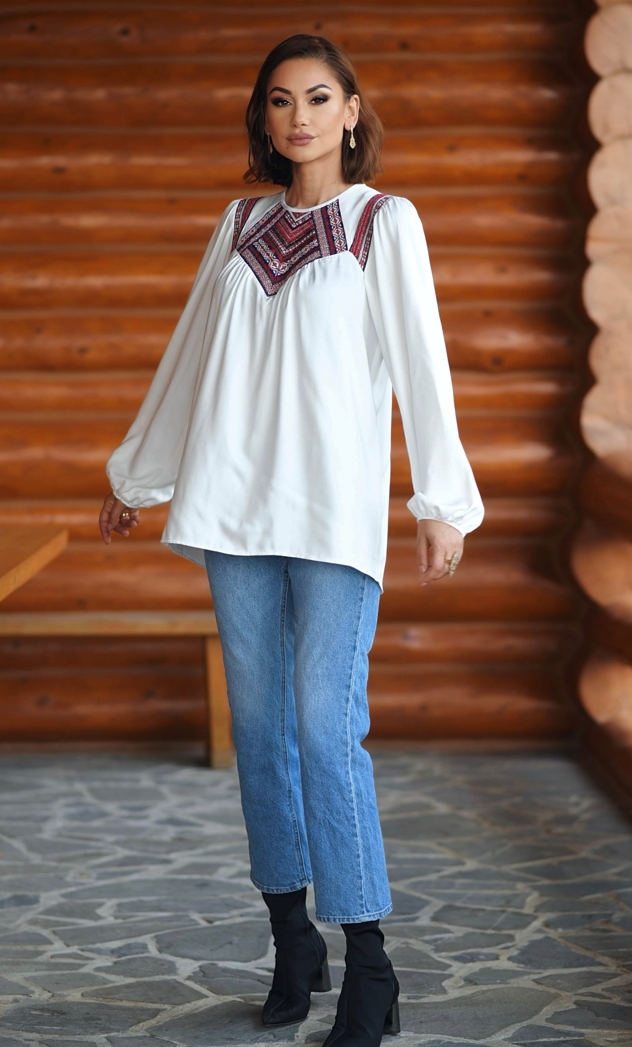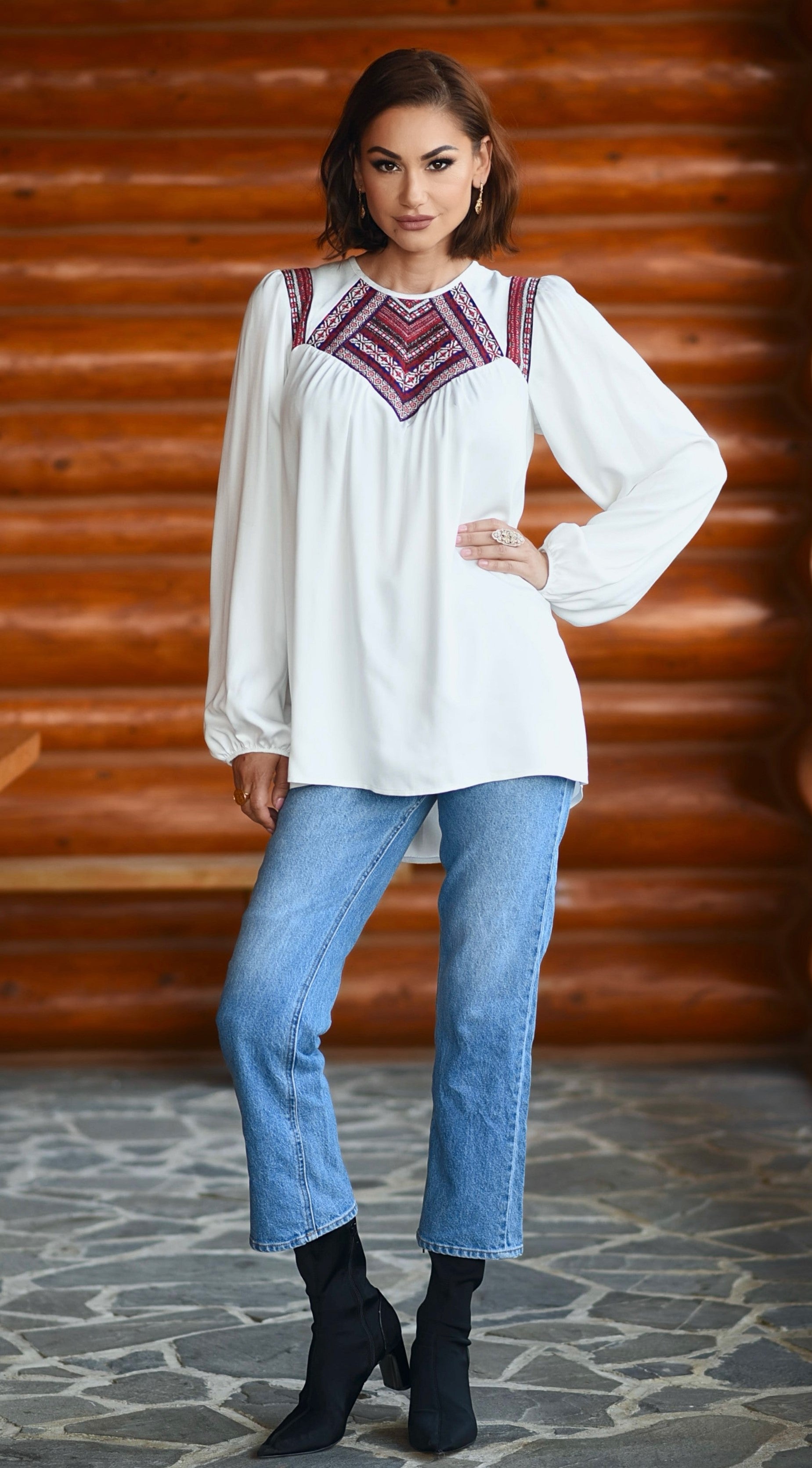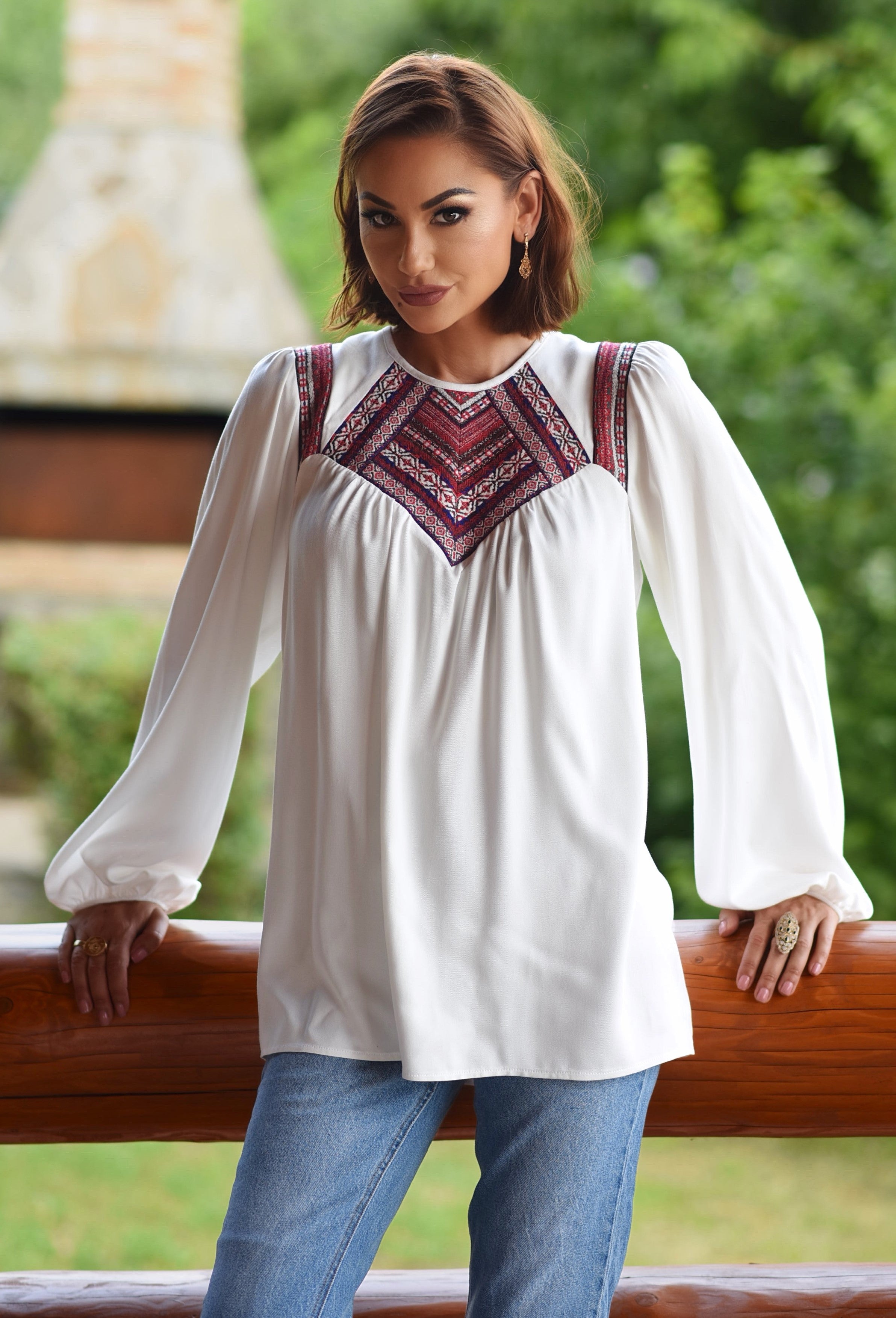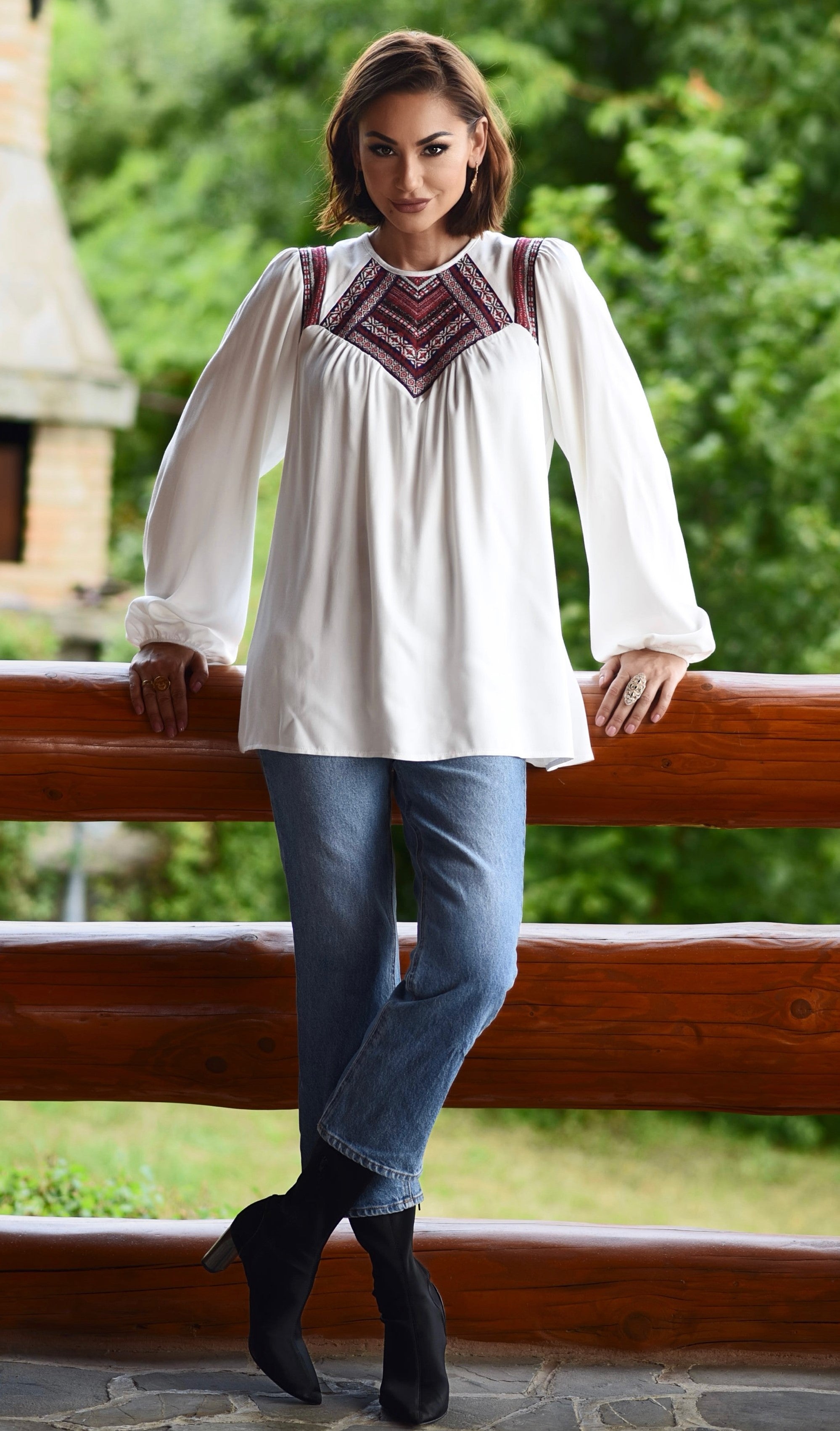 Bluza tradițională stilizată Daciana este confecționată din viscoză de calitate superioară și jacquard etnic țesut.